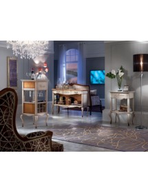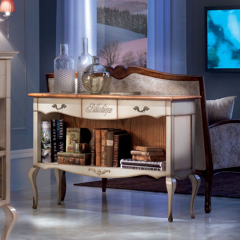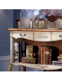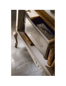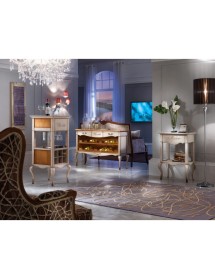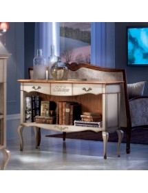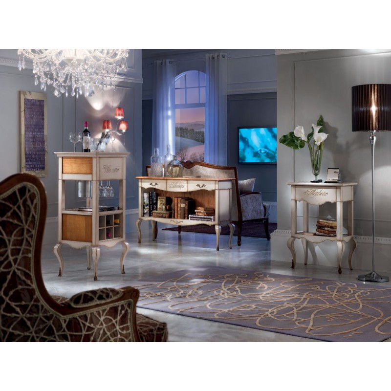 Mobile bar classico e raffinato costruito in legno massello. Nella parte inferiore è presente una rastrelliera porta bottiglie con 14 posti, invece nella parte inferiore è presente un piccolo fregio in metallo. Nella parte superiore sono presenti 2 cassetti laterali e un cassetto centrale con incisione. Ideale per una zona soggiorno classica o come retro divano in salotto.
