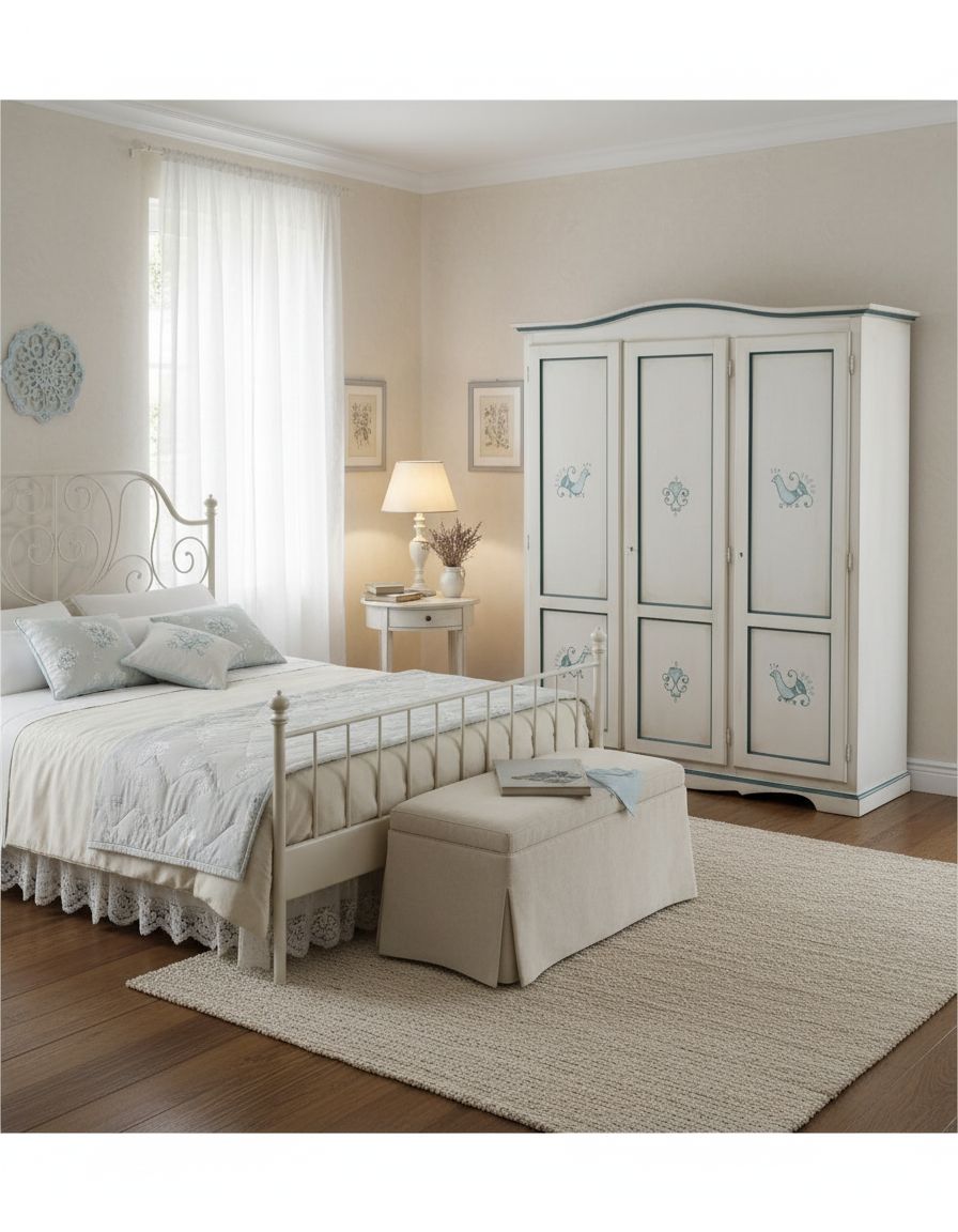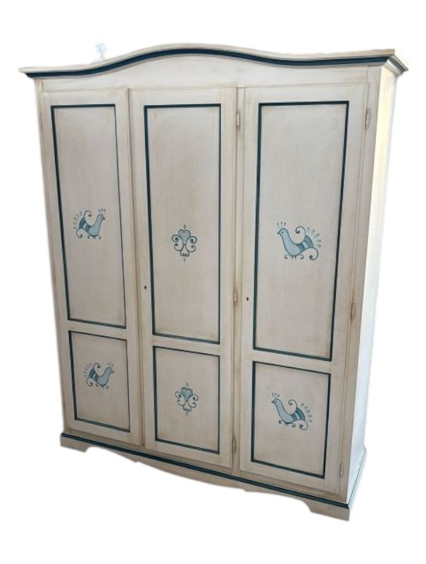 Armadio in stile shabby laccato bianco anticato con filo blu e pavoncelle dipinti rigorosamente a mano da esperti artigiani. Solido e robusto dotato di 3 porte battenti e un palo appendiabiti e 3 ripiani da riporre all' interno: capi di abbigliamento, biancheria intima, borse e sciarpe. Ideale come armadio per l' entrata o da posizionare nella zona notte.