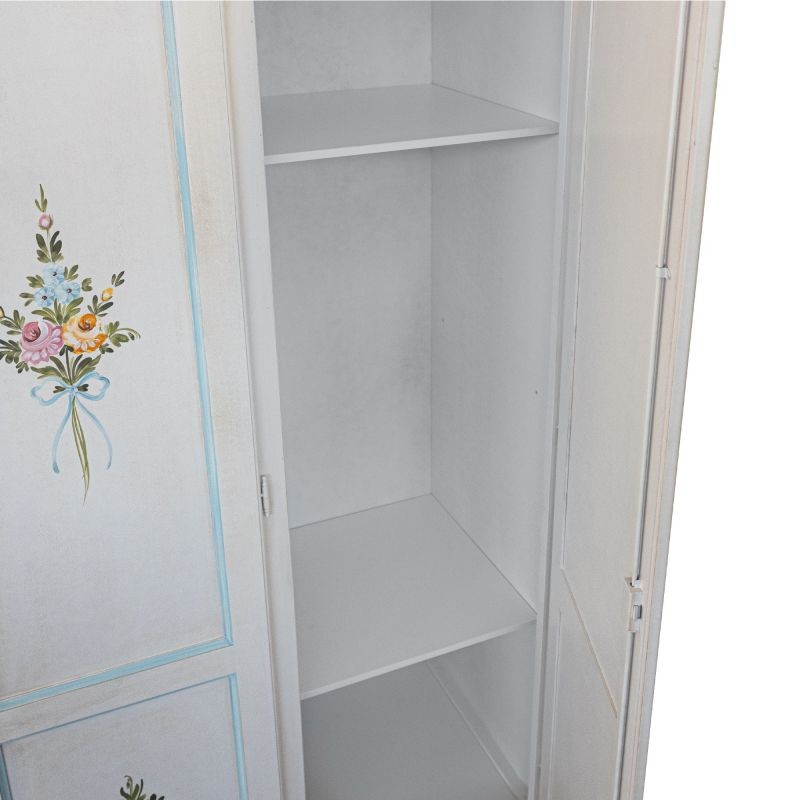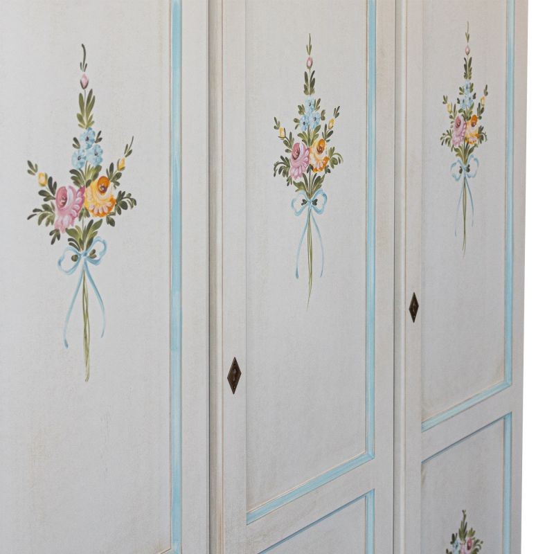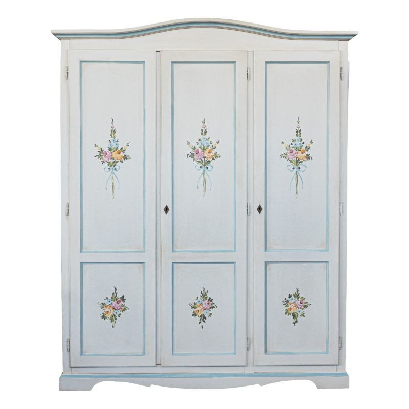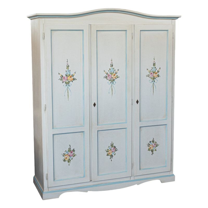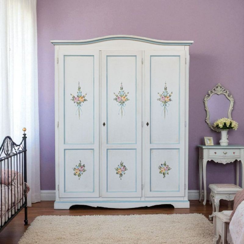 Armadio in stile shabby laccato laccato bianco anticato con filo azzurro e decori floreali dipinti rigorosamente a mano da esperti artigiani. Solido e robusto dotato di 3 porte battenti e un palo appendiabiti e 3 ripiani da riporre all' interno: capi di abbigliamento, biancheria intima, borse e sciarpe. Ideale come armadio per l' entrata o da posizionare nella zona notte.