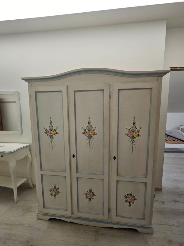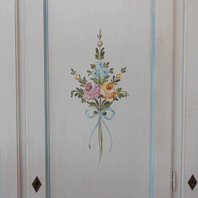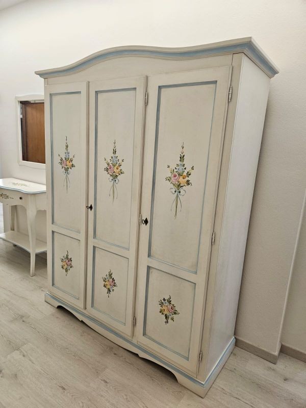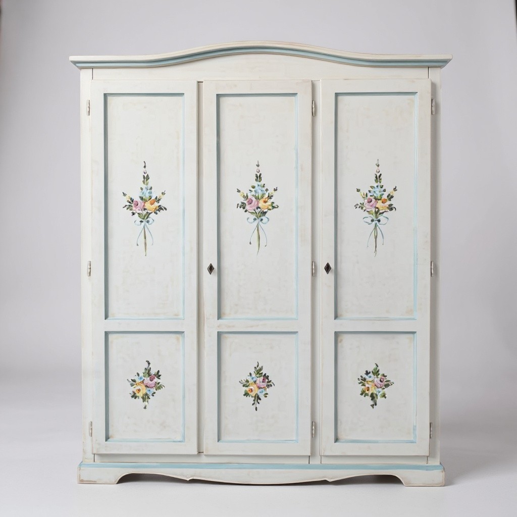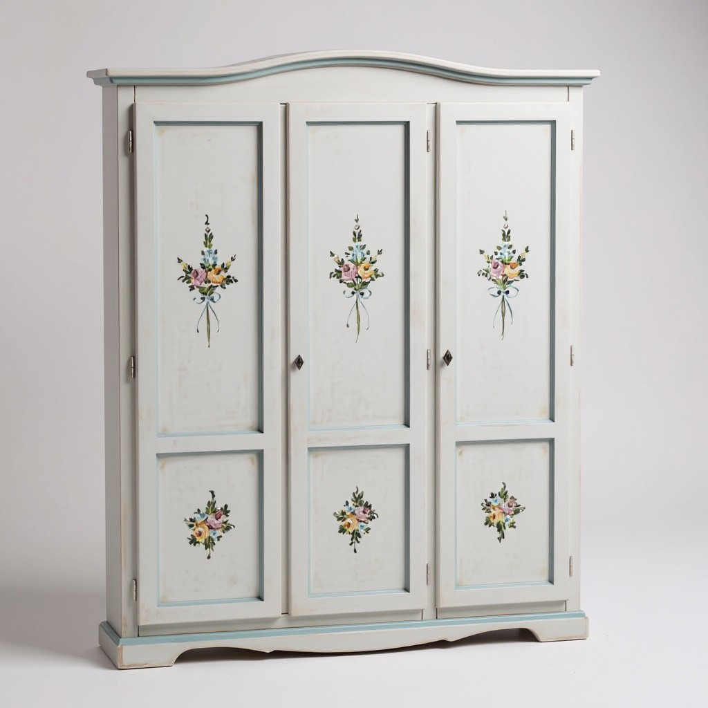 Armadio in stile shabby laccato laccato bianco anticato con filo azzurro e decori floreali dipinti rigorosamente a mano da esperti artigiani. Solido e robusto dotato di 3 porte battenti e un palo appendiabiti e 3 ripiani da riporre all' interno: capi di abbigliamento, biancheria intima, borse e sciarpe. Ideale come armadio per l' entrata o da posizionare nella zona notte.