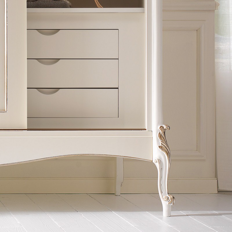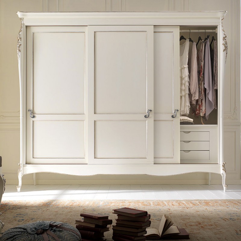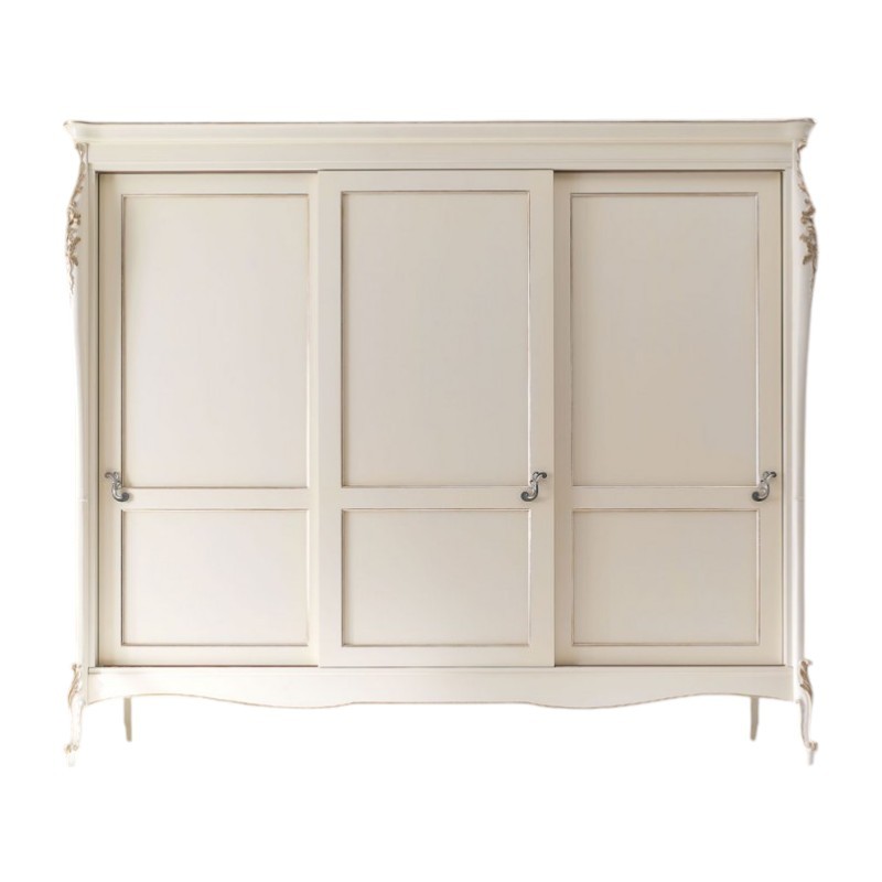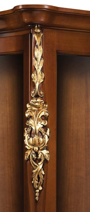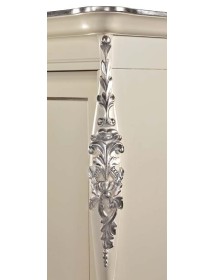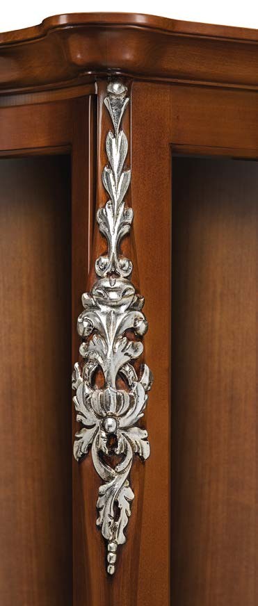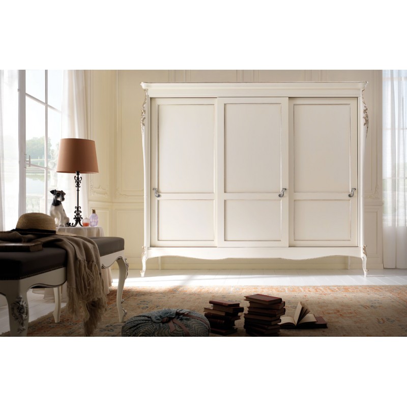 Armadio intagliato con 3 ante scorrevoli, destinato ad una camera da letto esclusiva e di classe. Spalle sagomate con evidente intaglio nella parte superiore ed inferiore, importante cappello sagomato e base alzata da terra da piedini che terminano a ricciolo. Le forme delicate ma importanti sono decorate da dettagli riccamente intagliati. Questo armadio può essere inserito all’interno di un arredamento classico, sia come elemento singolo oppure in abbinamento alla camera da letto della stessa collezione.