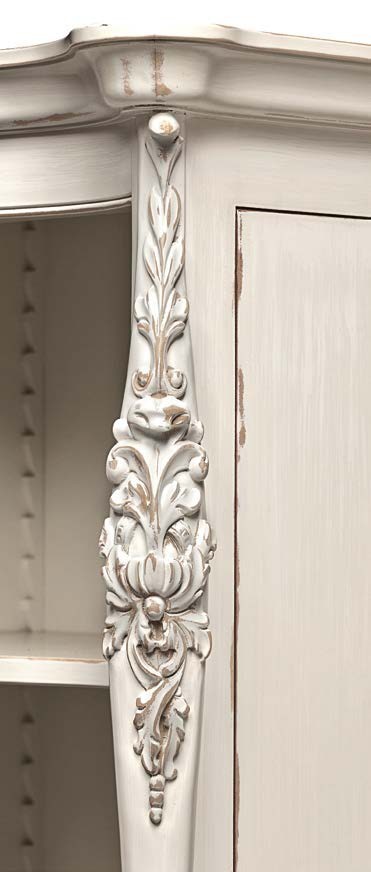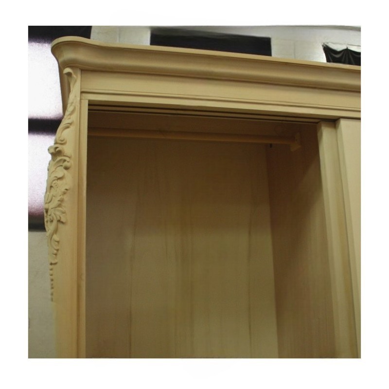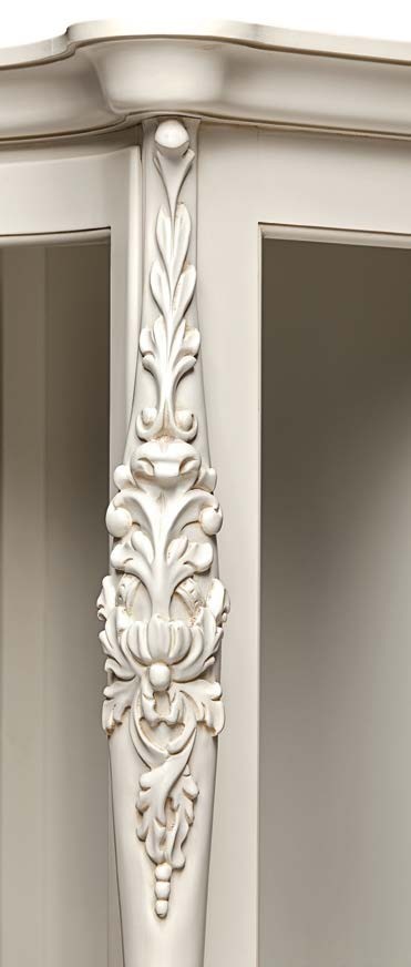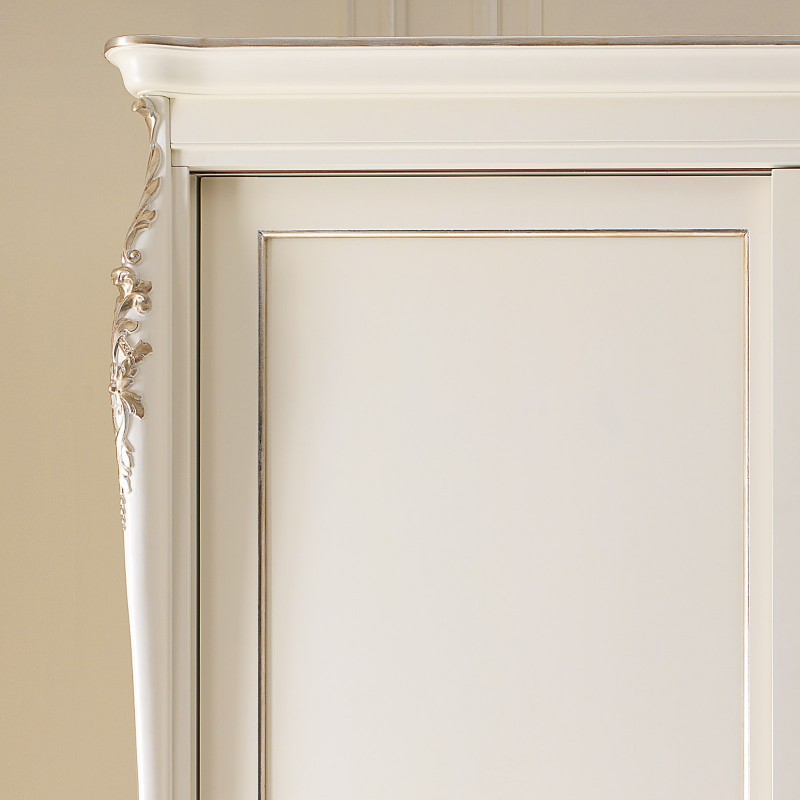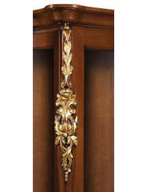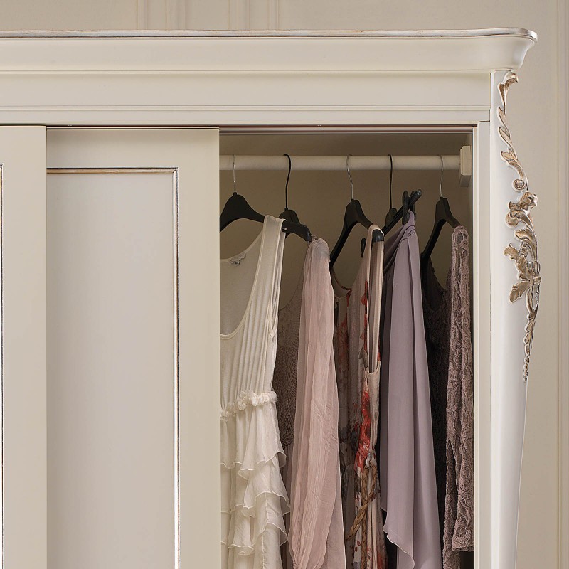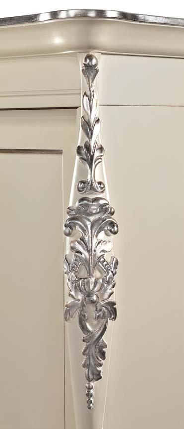 Armadio intagliato con 3 ante scorrevoli, destinato ad una camera da letto esclusiva e di classe. Spalle sagomate con evidente intaglio nella parte superiore ed inferiore, importante cappello sagomato e base alzata da terra da piedini che terminano a ricciolo. Le forme delicate ma importanti sono decorate da dettagli riccamente intagliati. Questo armadio può essere inserito all’interno di un arredamento classico, sia come elemento singolo oppure in abbinamento alla camera da letto della stessa collezione.
