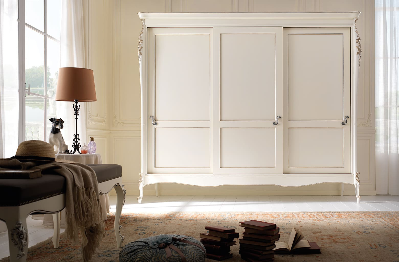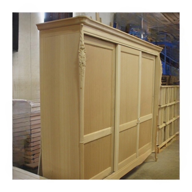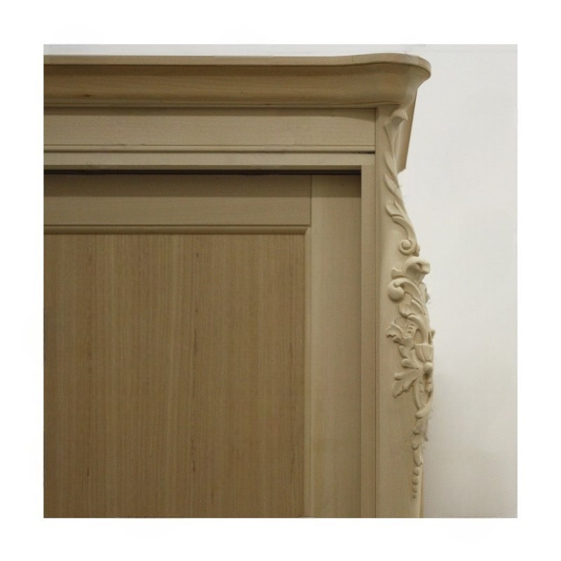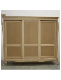 Armadio intagliato con 3 ante scorrevoli, destinato ad una camera da letto esclusiva e di classe. Spalle sagomate con evidente intaglio nella parte superiore ed inferiore, importante cappello sagomato e base alzata da terra da piedini che terminano a ricciolo. Le forme delicate ma importanti sono decorate da dettagli riccamente intagliati. Questo armadio può essere inserito all’interno di un arredamento classico, sia come elemento singolo oppure in abbinamento alla camera da letto della stessa collezione.