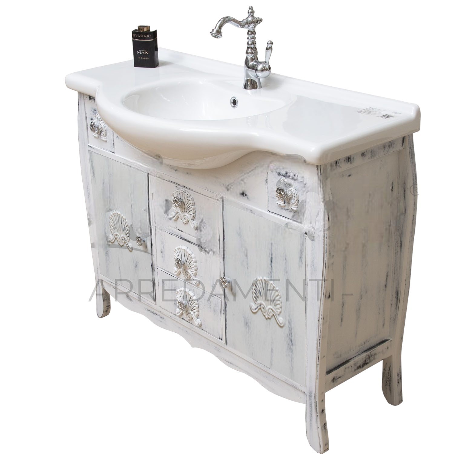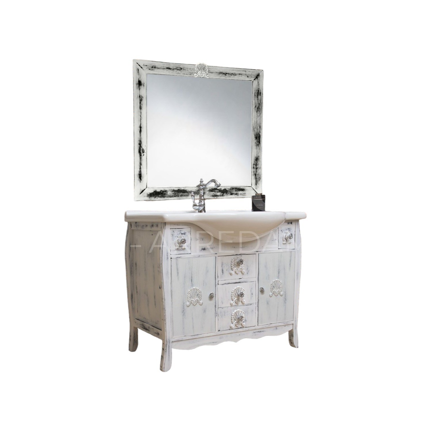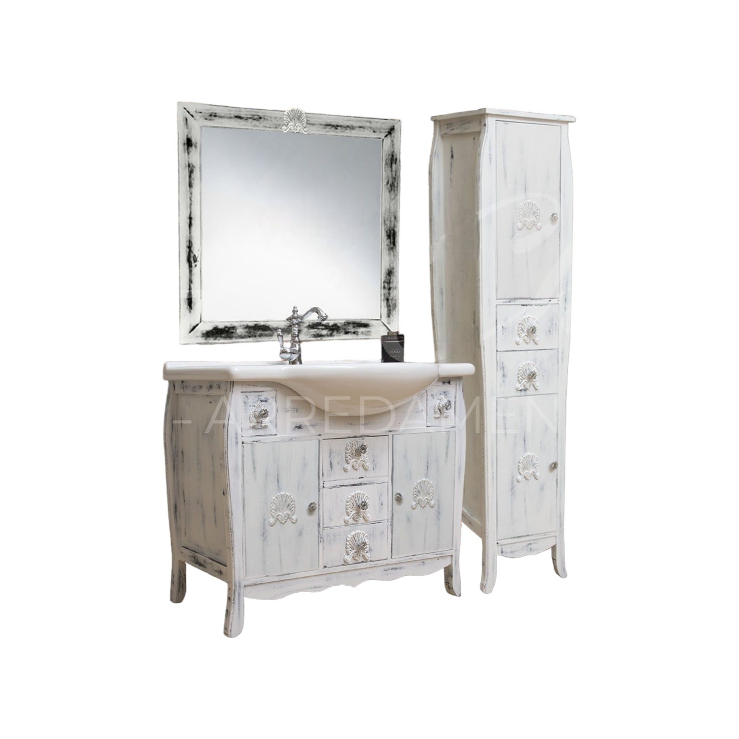 Mobile bagno in stile shabby chic, costruito interamente in legno di pioppo. Finitura laccato bianco invecchiato, realizzato completamente a mano in Italia. Dotato di 2 ante, 3 cassetti centrali e 2 cassetti laterali nella parte superiore per riporre spazzole e prodotti per la cura del corpo, accompagnati da pomelli in ottone cromato e intarsi applicati nei frontali dei cassetti e nelle porte. Il spazioso lavabo è in ceramica resistente ad prodotti chimici e corrosivi. Con la base è compresa una specchiera in stile e una colonna con 2 ante e 2 cassetti. La vernice del mobile è idrorepellente.