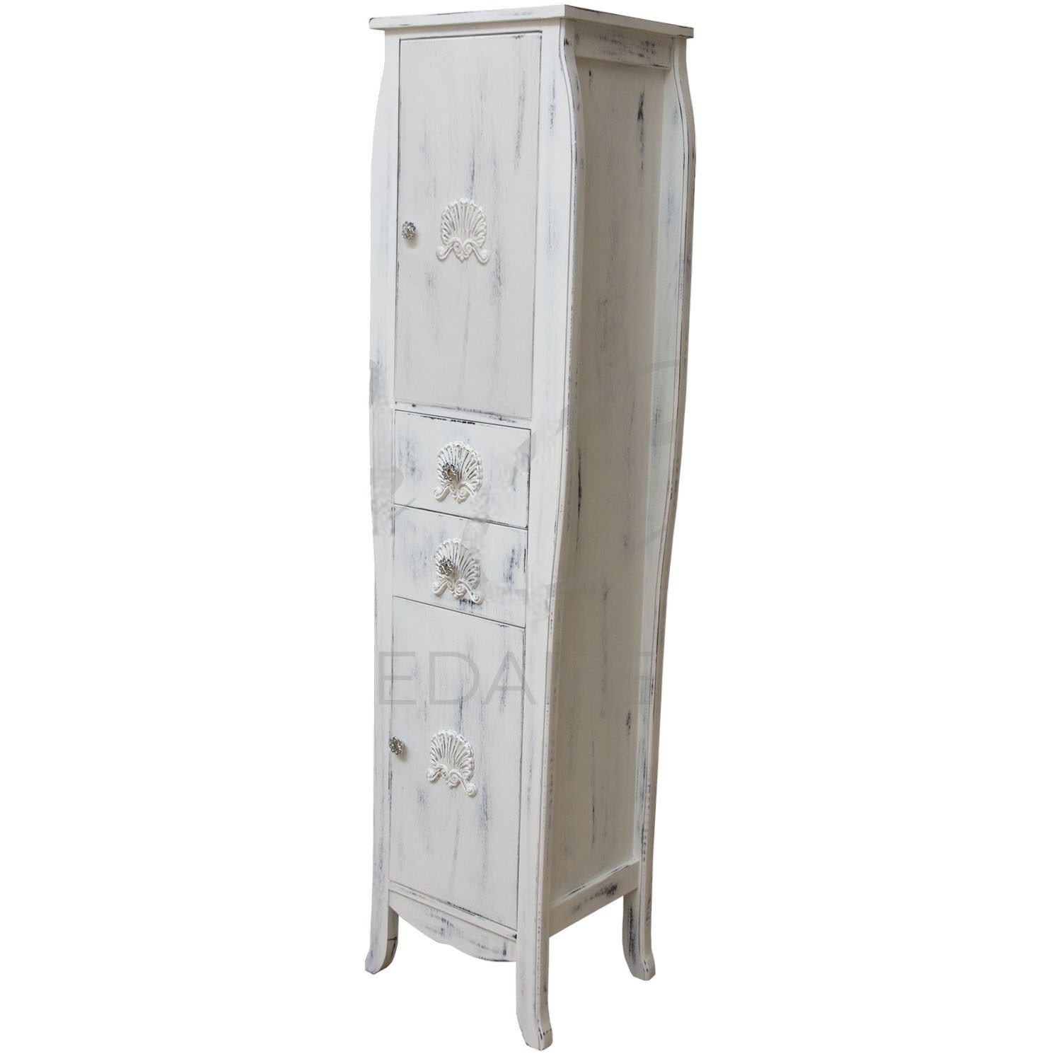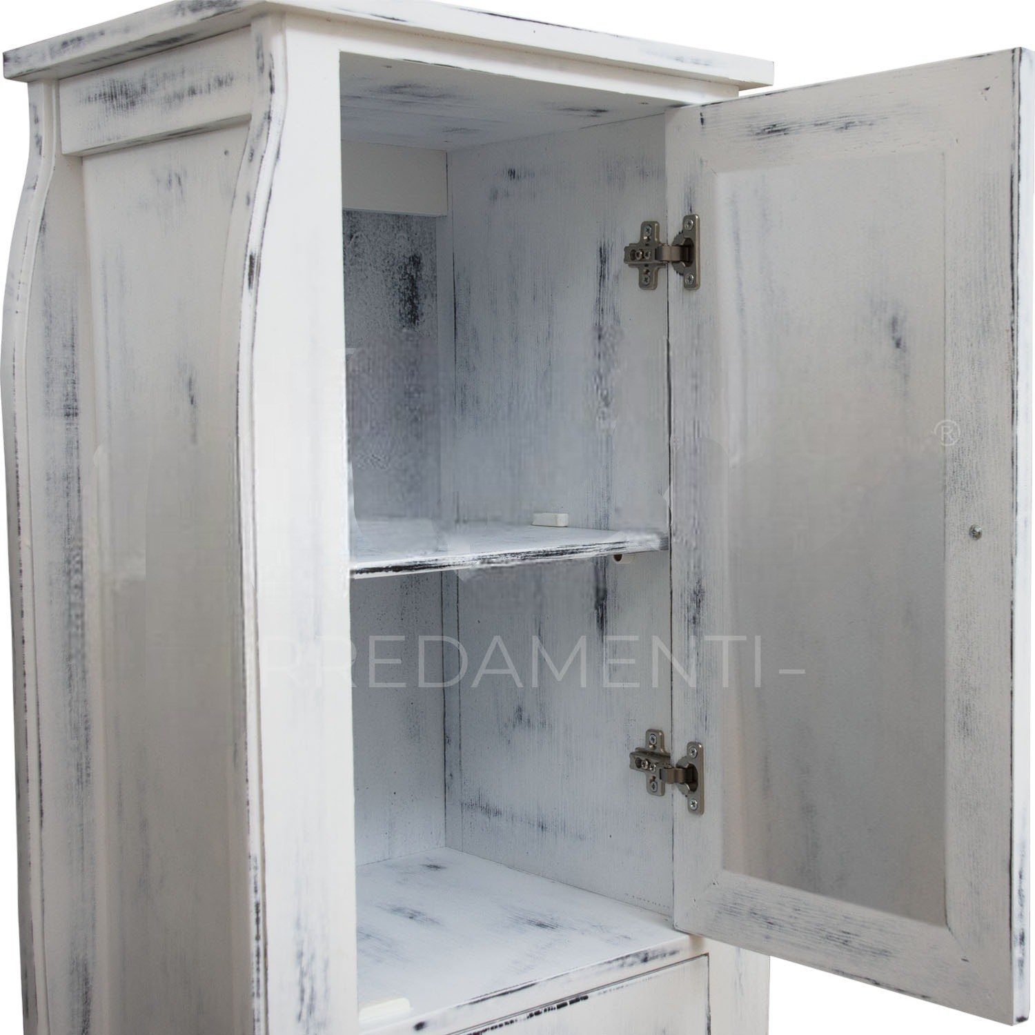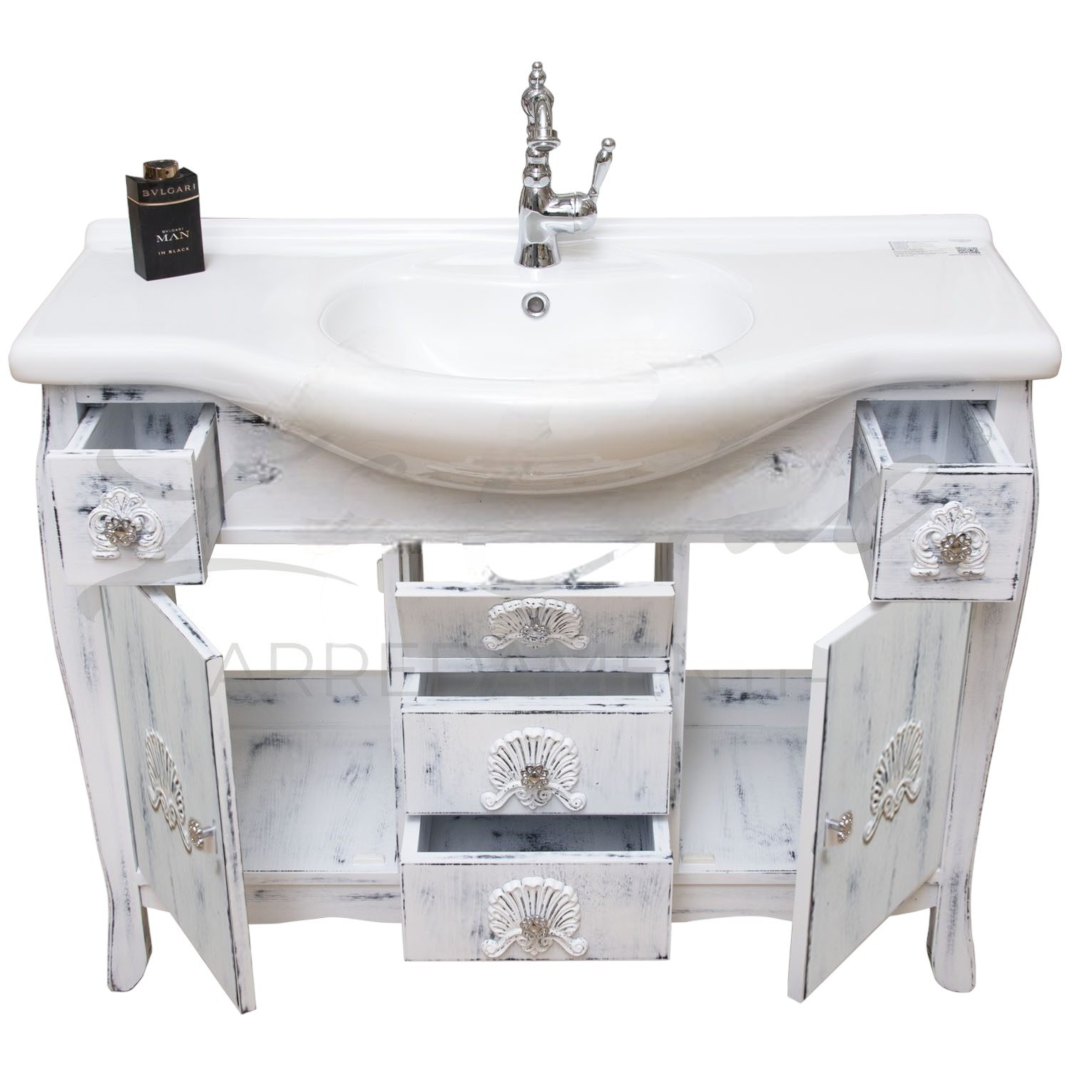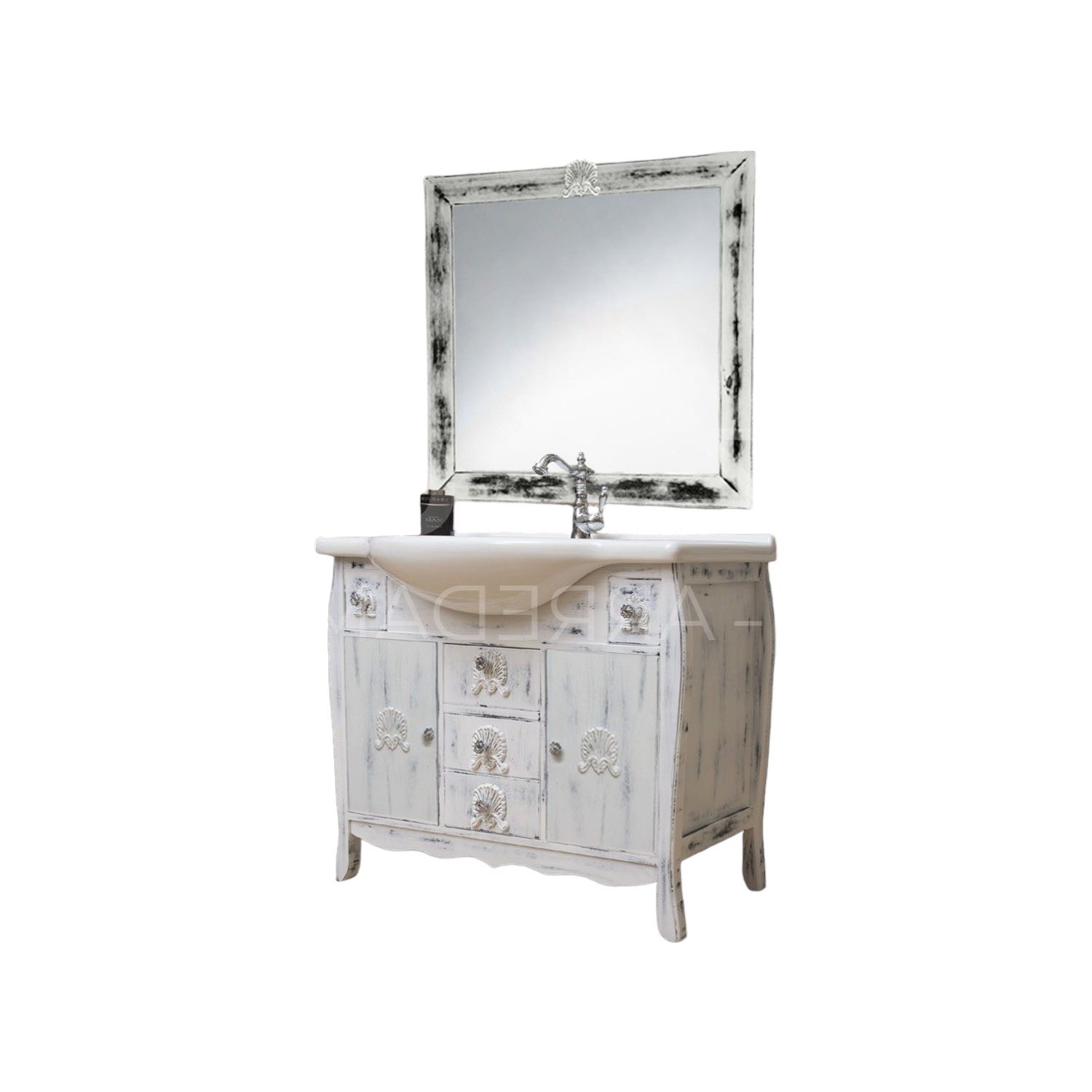 Mobile bagno in stile shabby chic, costruito interamente in legno di pioppo. Finitura laccato bianco invecchiato, realizzato completamente a mano in Italia. Dotato di 2 ante, 3 cassetti centrali e 2 cassetti laterali nella parte superiore per riporre spazzole e prodotti per la cura del corpo, accompagnati da pomelli in ottone cromato e intarsi applicati nei frontali dei cassetti e nelle porte. Il spazioso lavabo è in ceramica resistente ad prodotti chimici e corrosivi. Con la base è compresa una specchiera in stile e una colonna con 2 ante e 2 cassetti. La vernice del mobile è idrorepellente.
