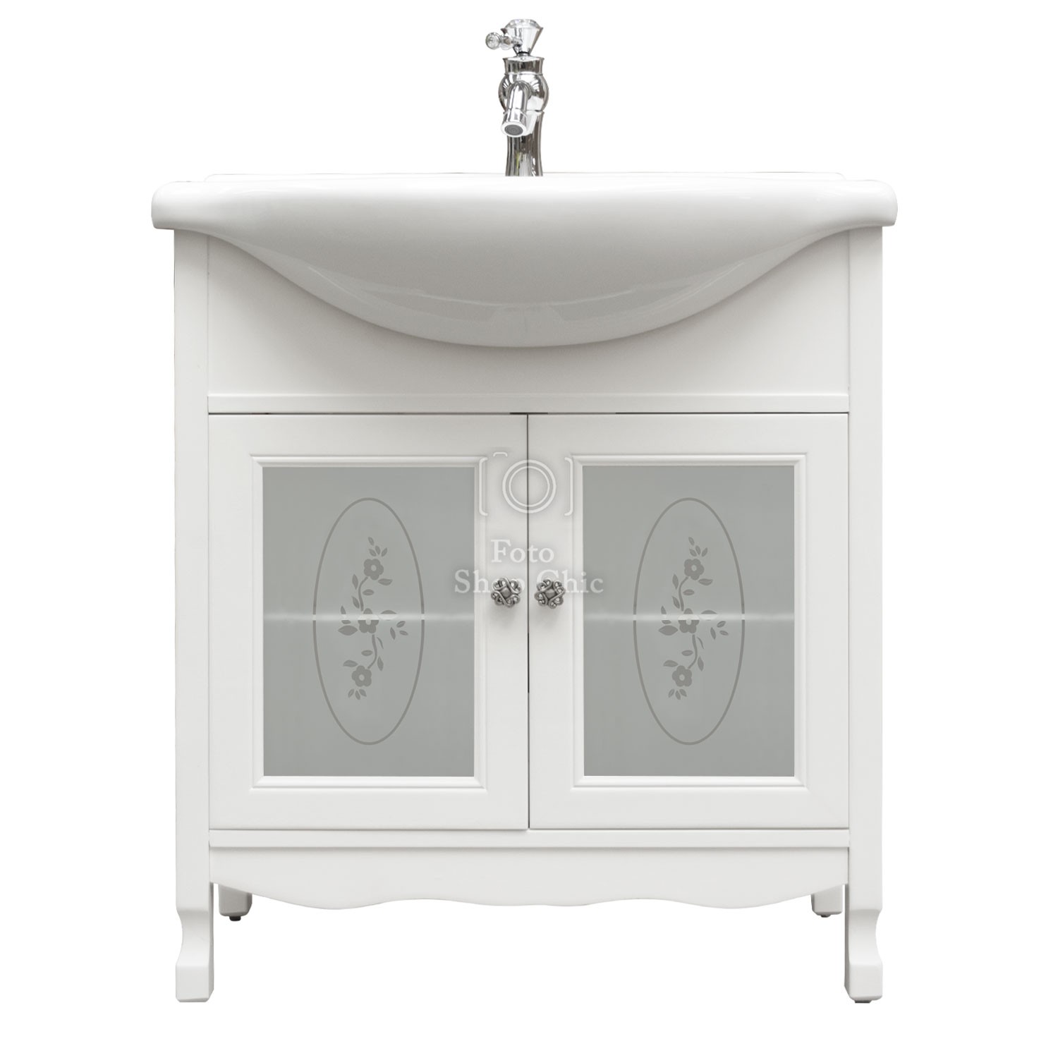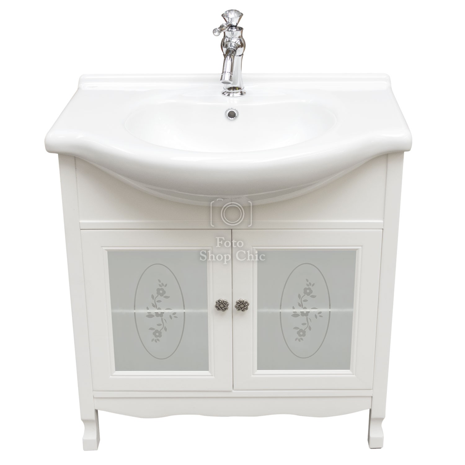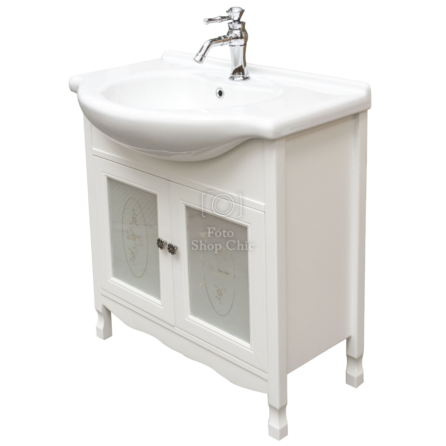 Mobile bagno in stile shabby chic, costruito interamente in legno di pioppo. Finitura laccato bianco, realizzato completamente a mano in Italia. Dotato di 2 ante con vetri decorati e sabbiati per riporre asciugamani, pettini e prodotti per la cura del corpo, invece i pomelli sono in ottone argento a fiore. Il spazioso lavabo è in ceramica resistente ad prodotti chimici e corrosivi. Con la base è compresa una specchiera in stile shabby con 1 applique in vetro sabbiato. La vernice del mobile è idrorepellente.
