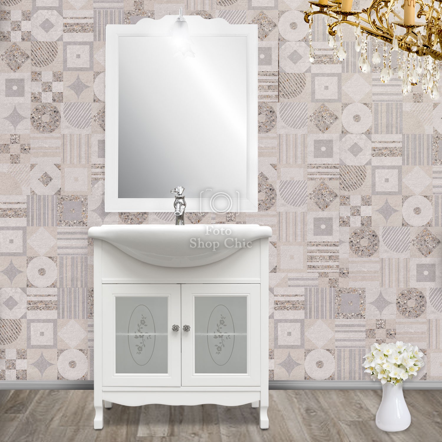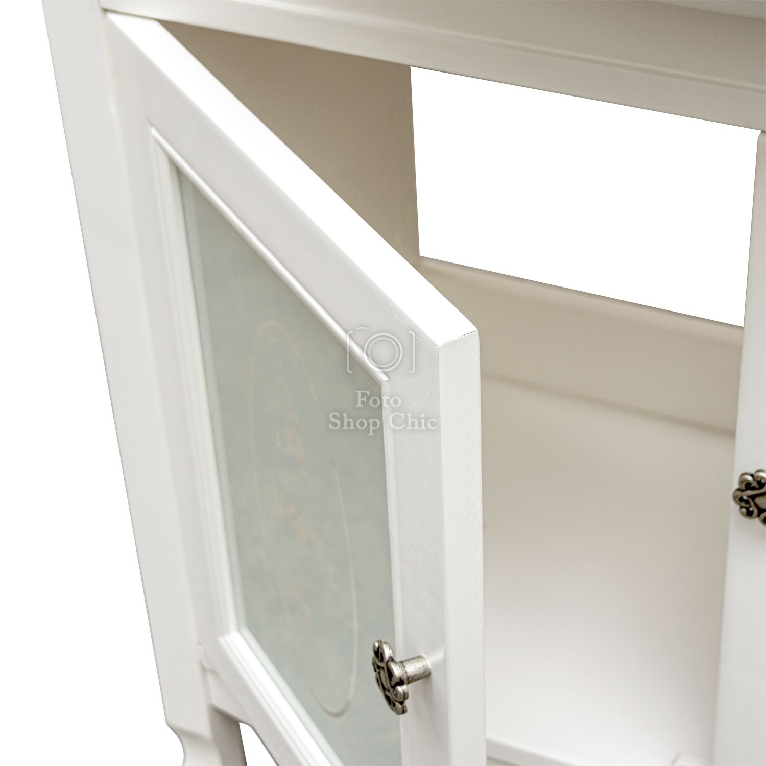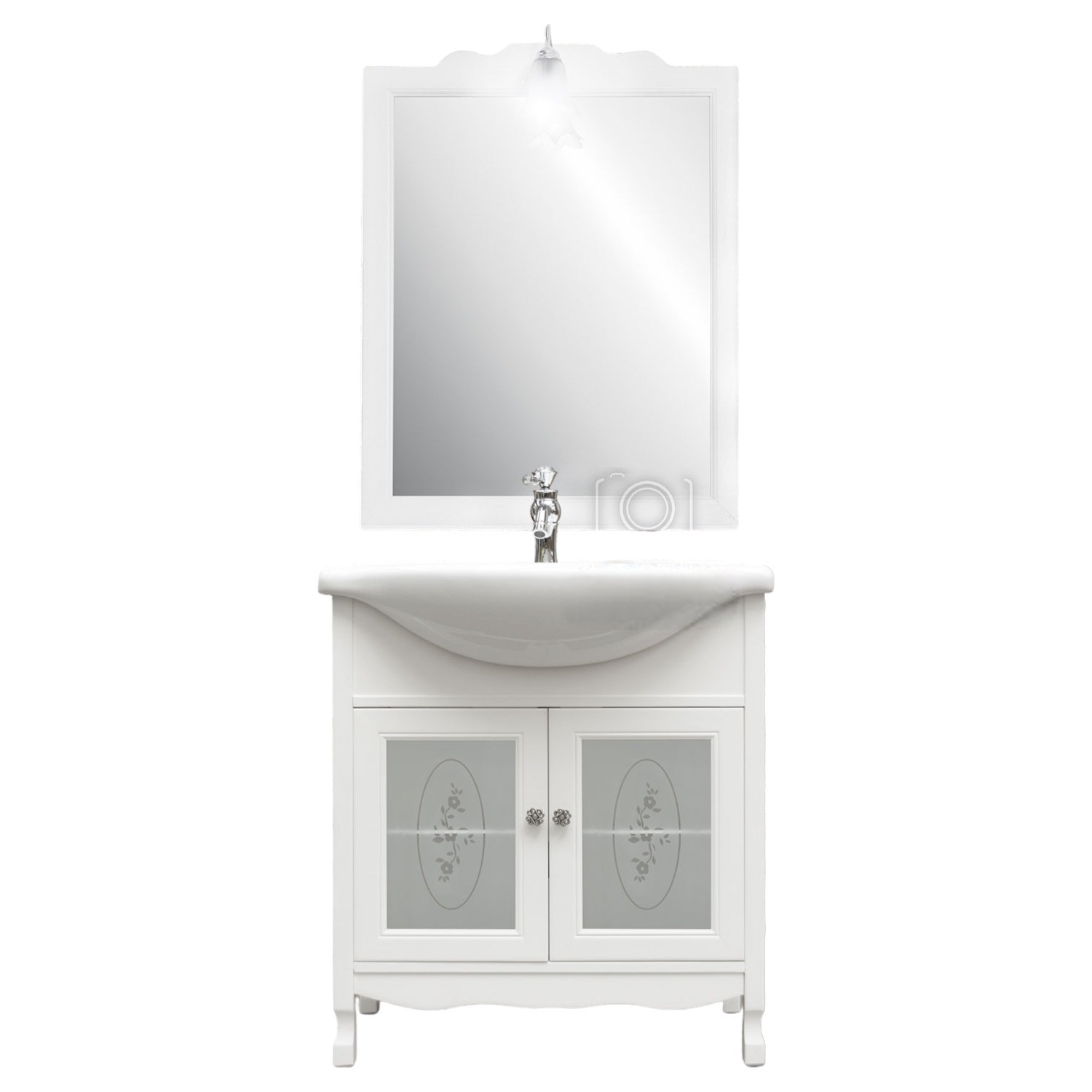 Mobile bagno in stile shabby chic, costruito interamente in legno di pioppo. Finitura laccato bianco, realizzato completamente a mano in Italia. Dotato di 2 ante con vetri decorati e sabbiati per riporre asciugamani, pettini e prodotti per la cura del corpo, invece i pomelli sono in ottone argento a fiore. Il spazioso lavabo è in ceramica resistente ad prodotti chimici e corrosivi. Con la base è compresa una specchiera in stile shabby con 1 applique in vetro sabbiato. La vernice del mobile è idrorepellente.