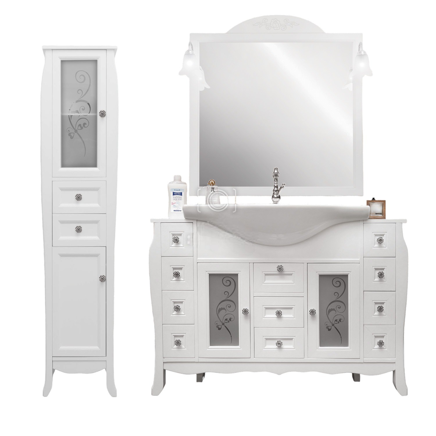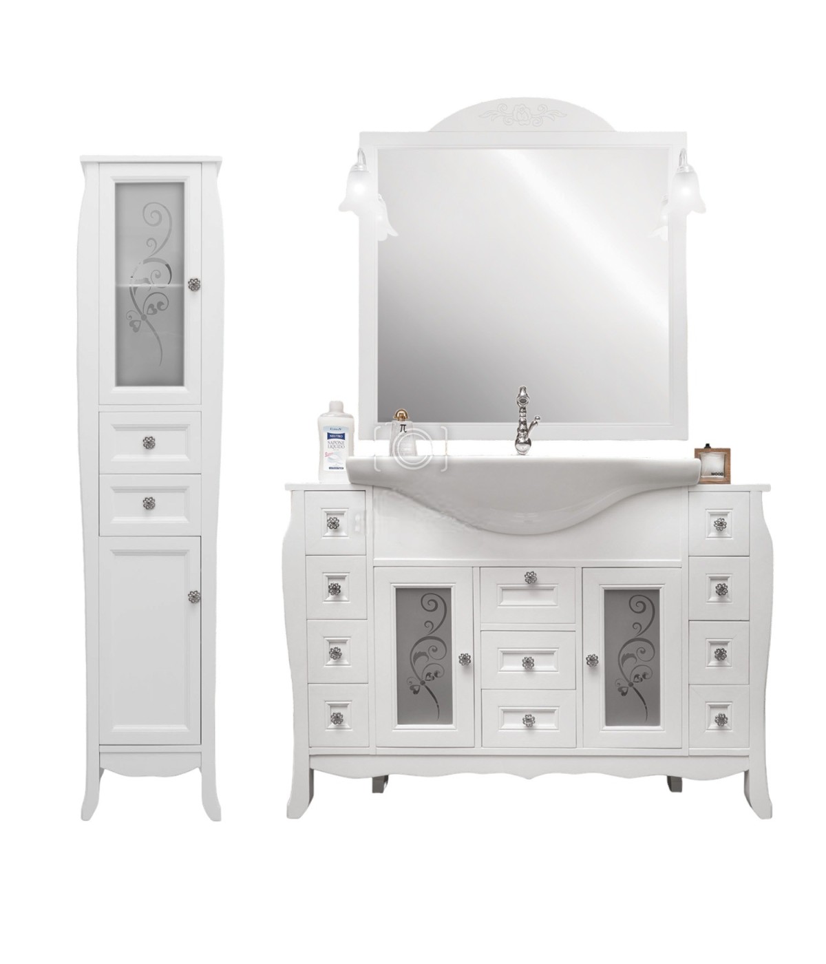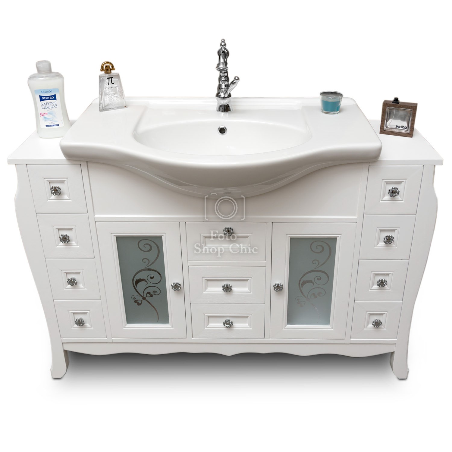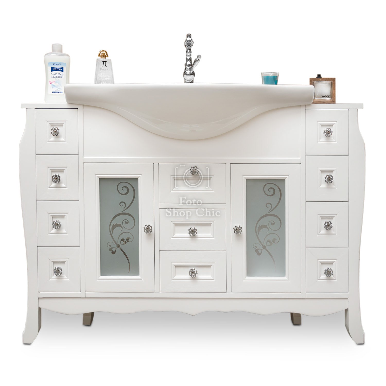 Mobile bagno in stile shabby chic, costruito interamente in legno di pioppo. Finitura laccato bianco, realizzato completamente a mano in Italia. Dotato di 2 ante con vetri decorati e sabbiati, 3 cassettini centrali e 8 cassetti laterali, invece i pomelli sono in ottone cromato e le applique in vetro. Il spazioso lavabo è in ceramica resistente ad prodotti chimici e corrosivi. Con la base è compresa una specchiera in stile shabby con 2 punti luce affiancata da una colonna sagomata con 2 ante e 2 cassetti. La vernice del mobile è idrorepellente.