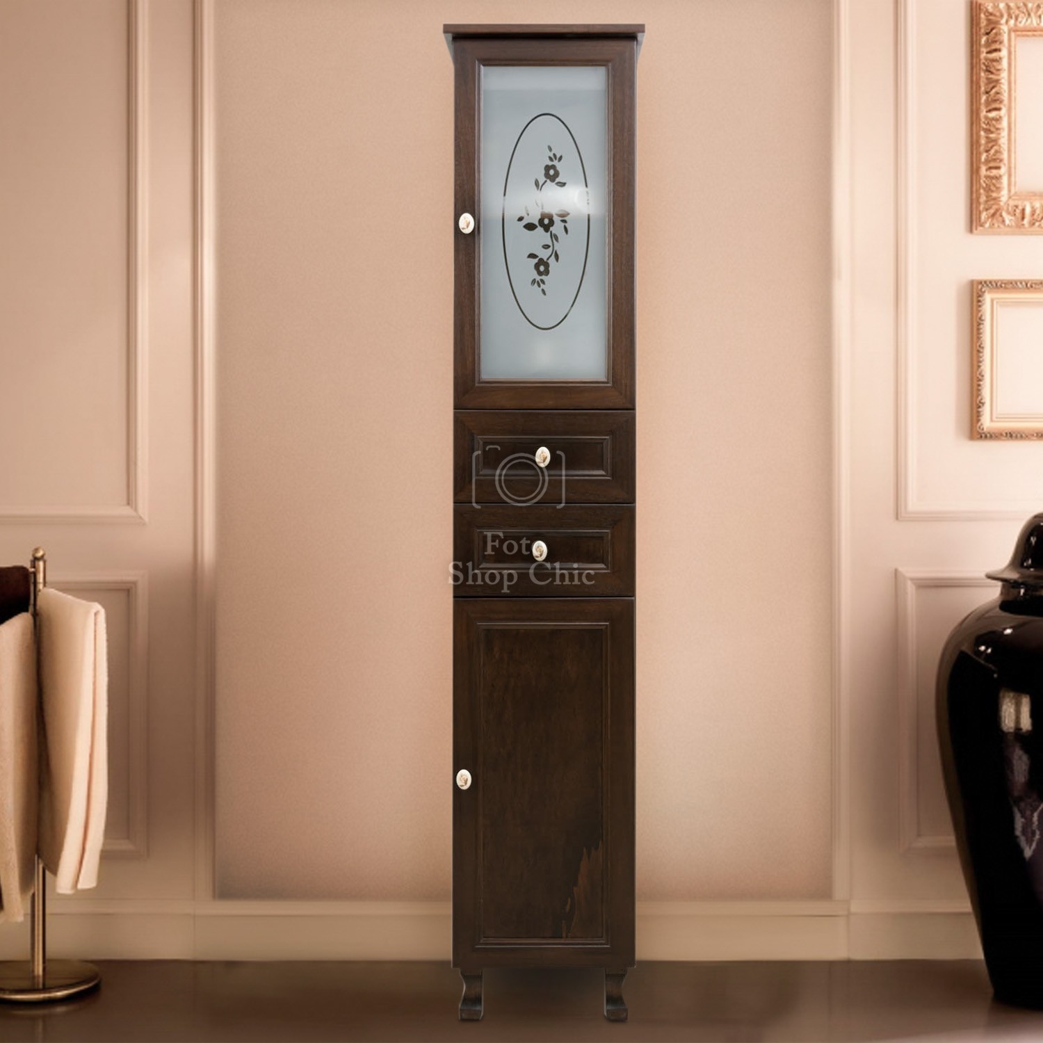 Mobile bagno in arte povera, costruito interamente in legno di pioppo realizzato completamente a mano in Italia. Base dotata di 3 cassetti centrali e 2 cassettini superiori molto capienti per riporre asciugamani, pettini, spazzole e prodotti per la cura del corpo. Unico nel suo genere per la sua sagomatura elegante aggiungendo un tocco di gusto retrò con l'aggiunta dei pomoli in ceramica floreali. affiancata da una colonna con 2 porte e 2 cassetti. Il lavabo in ceramica è resistente ad prodotti chimici e corrosivi. Con la base è compresa una specchiera. La vernice del mobile è idrorepellente.