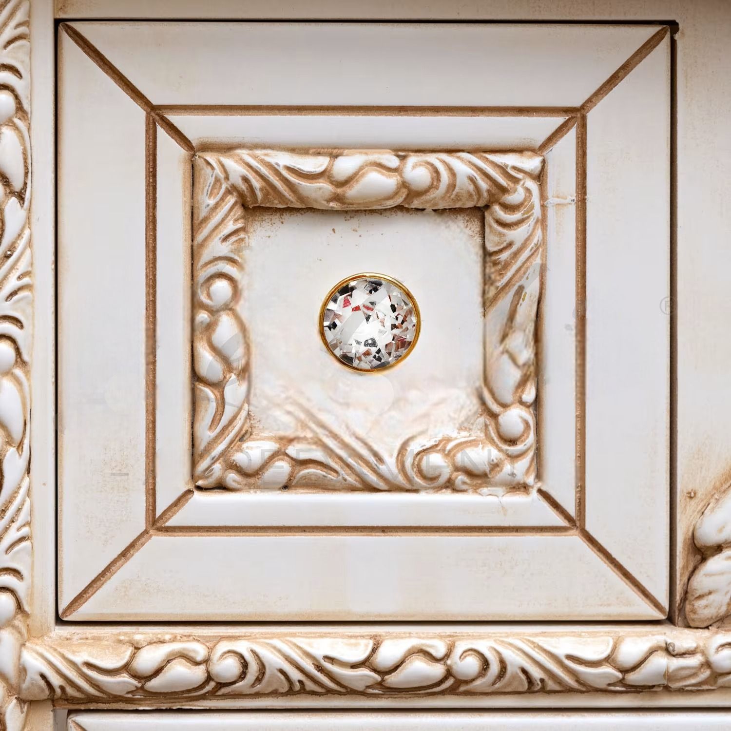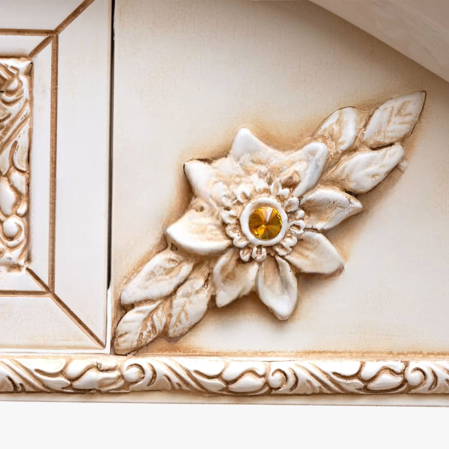 Mobile bagno in stile shabby chic, costruito interamente in legno di pioppo. Finitura laccato avorio decapè, realizzato completamente a mano in Italia. Dotato di 3 ante con incisioni floreali e 2 cassetti laterali. Unico nel suo genere per gli intarsi in foglia e i pomoli in ottone oro con swarovski, per non passare inosservati. Il spazioso lavabo è in ceramica resistente ad prodotti chimici e corrosivi. Con la base è compresa una specchiera in stile barocco. La vernice del mobile è idrorepellente.