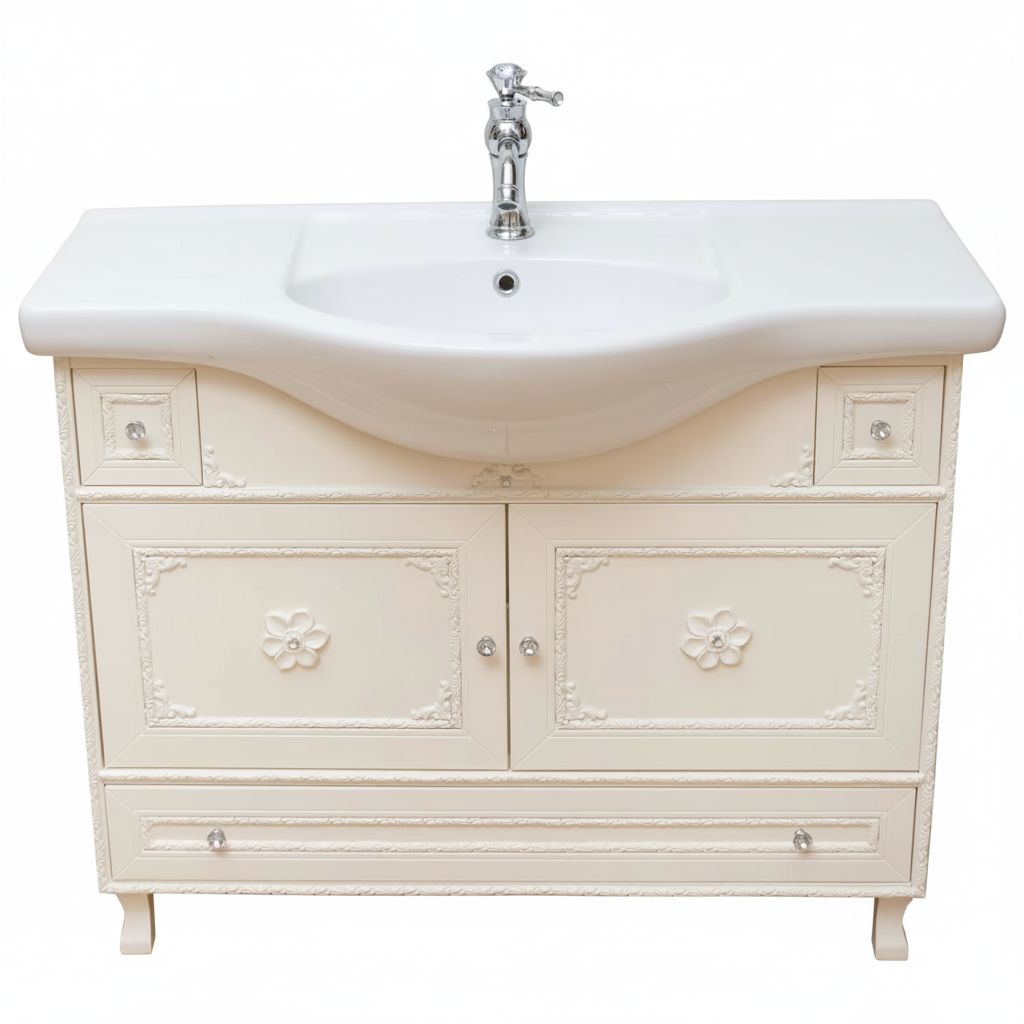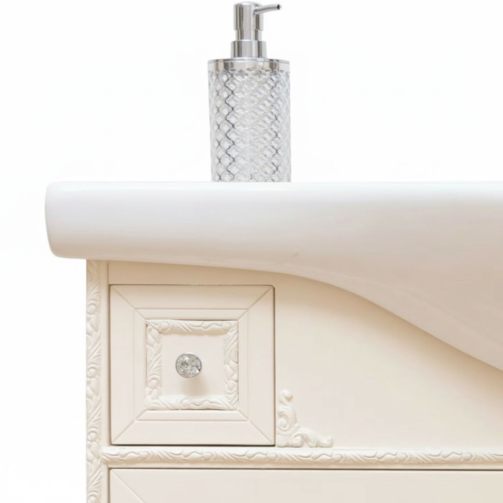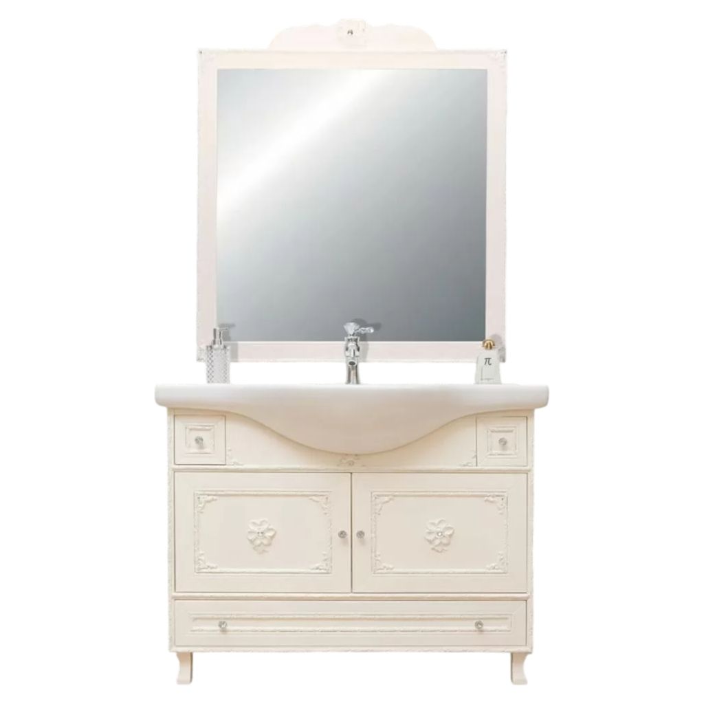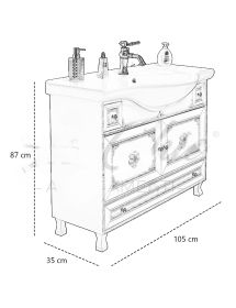 Mobile bagno in stile shabby chic, costruito interamente in legno di pioppo. Finitura laccato avorio, realizzato completamente a mano in Italia. Dotato di 2 ante con incisioni floreali e 2 cassetti laterali e con 1 cassettone situato tra le gambe. Unico nel suo genere per gli intarsi e i pomoli con swarovski, per non passare inosservati. Il spazioso lavabo è in ceramica resistente ad prodotti chimici e corrosivi. Con la base è compresa una specchiera in stile barocco. La vernice del mobile è idrorepellente.