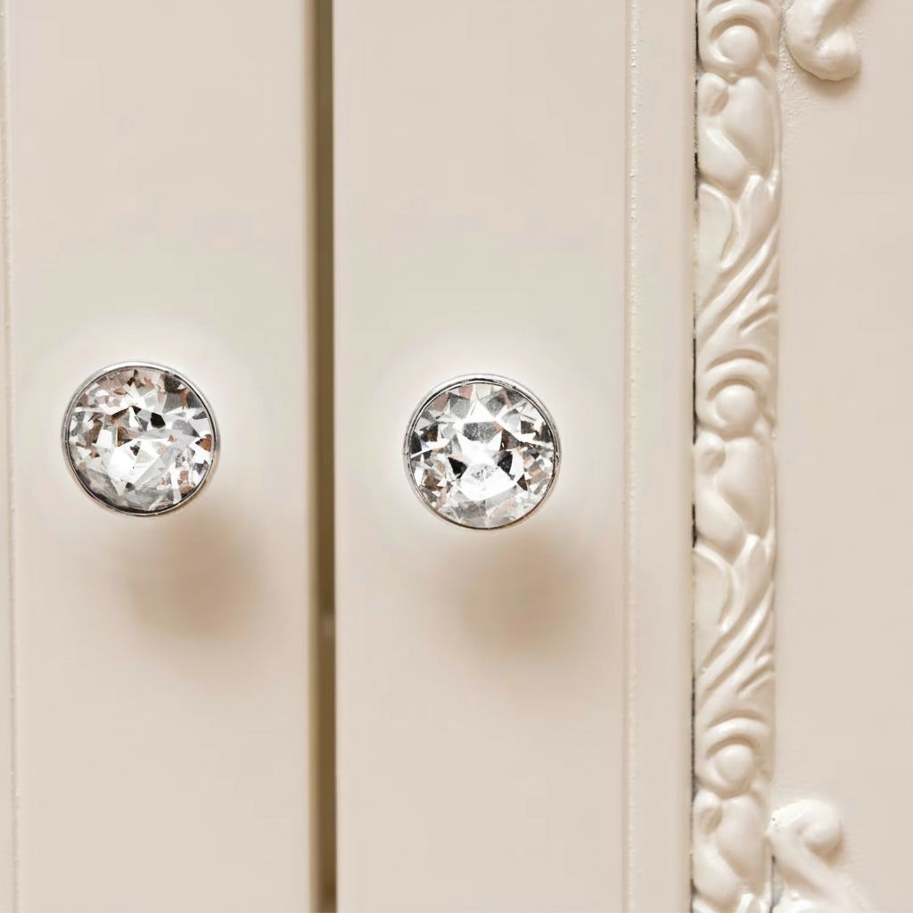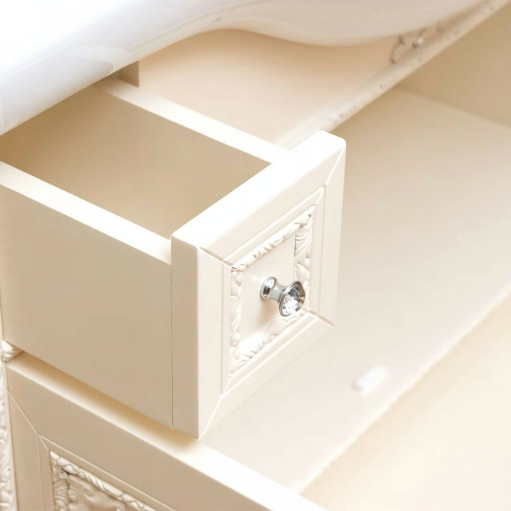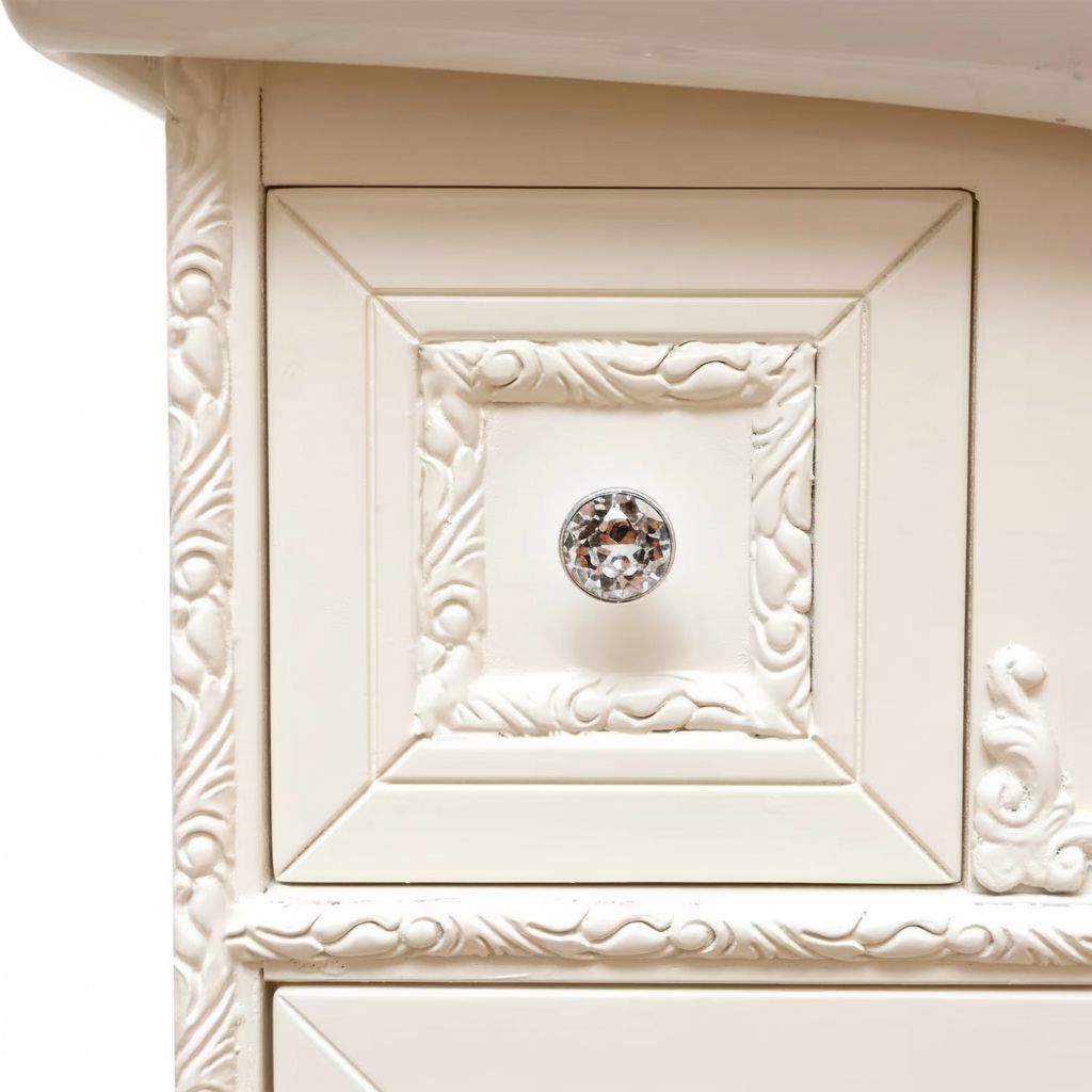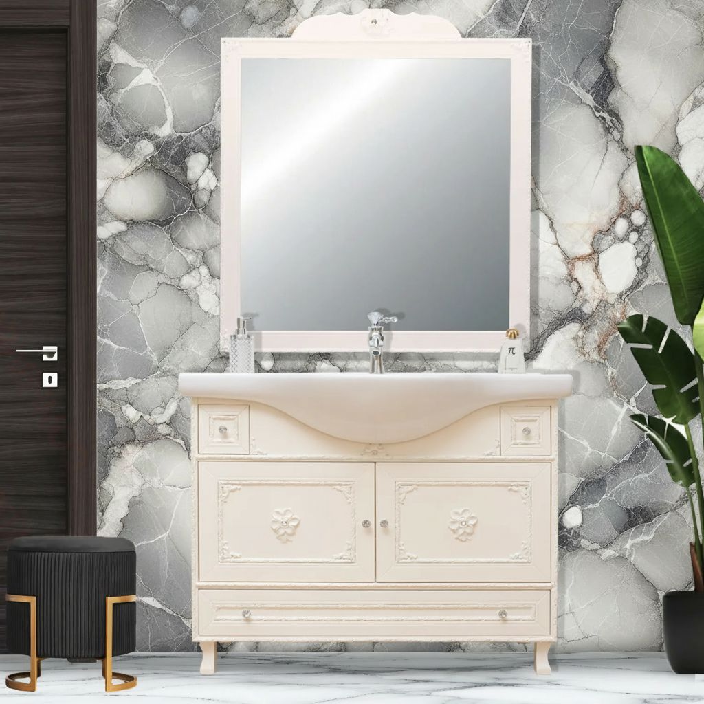 Mobile bagno in stile shabby chic, costruito interamente in legno di pioppo. Finitura laccato avorio, realizzato completamente a mano in Italia. Dotato di 2 ante con incisioni floreali e 2 cassetti laterali e con 1 cassettone situato tra le gambe. Unico nel suo genere per gli intarsi e i pomoli con swarovski, per non passare inosservati. Il spazioso lavabo è in ceramica resistente ad prodotti chimici e corrosivi. Con la base è compresa una specchiera in stile barocco. La vernice del mobile è idrorepellente.