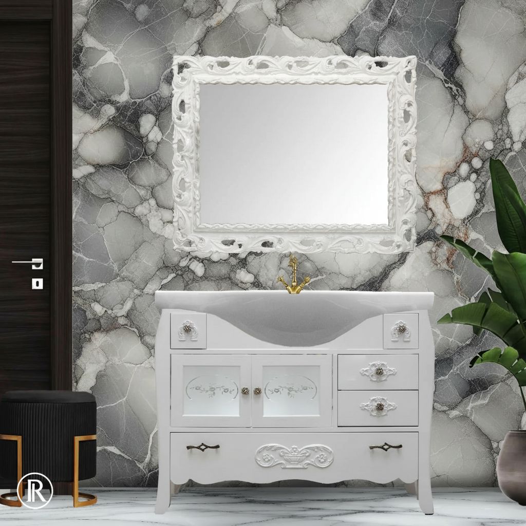 MOBILE BAGNO LEGNO BAROCCO BIANCO CON INTARSI L.105 P.35