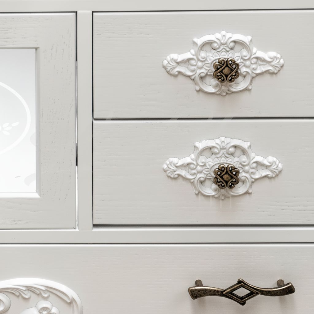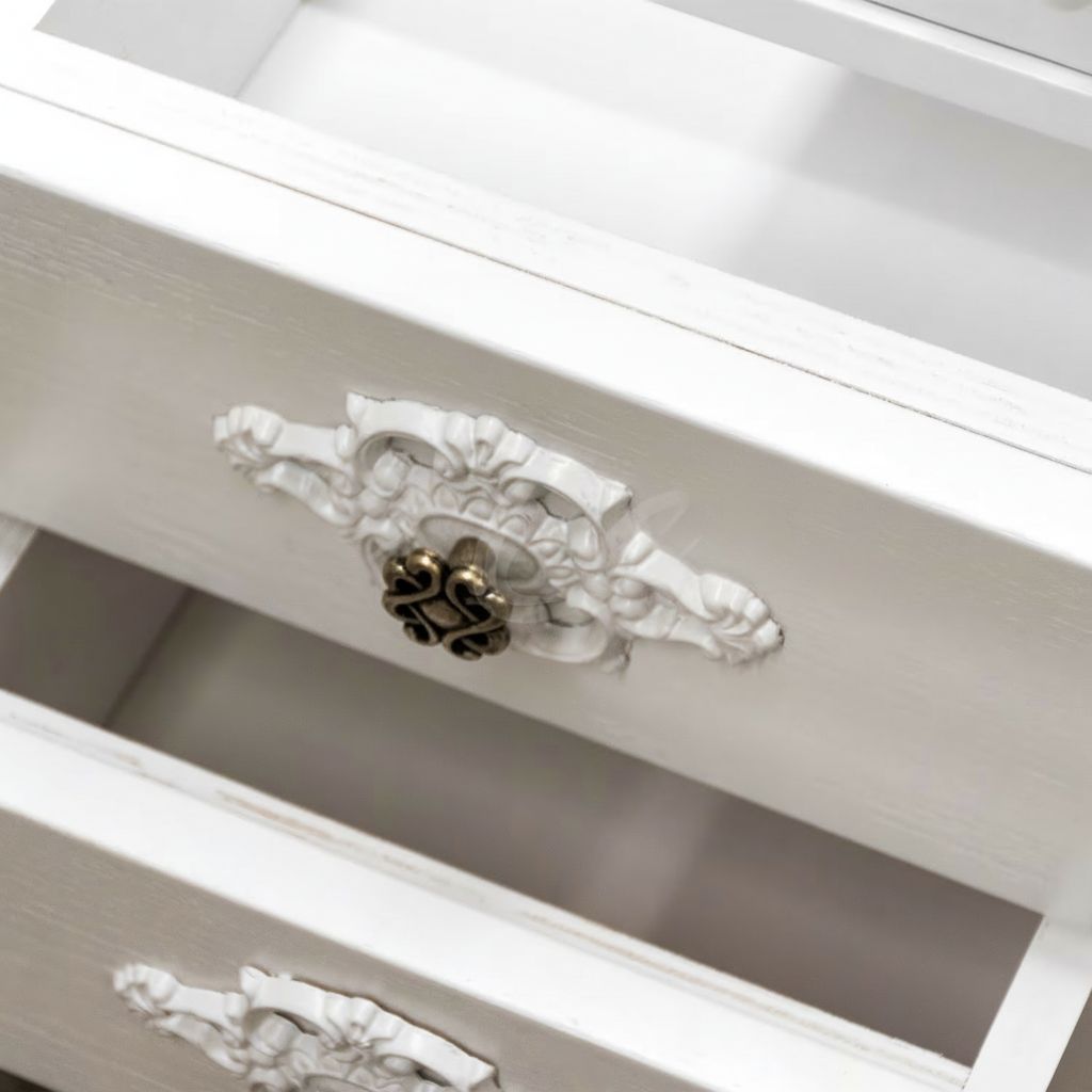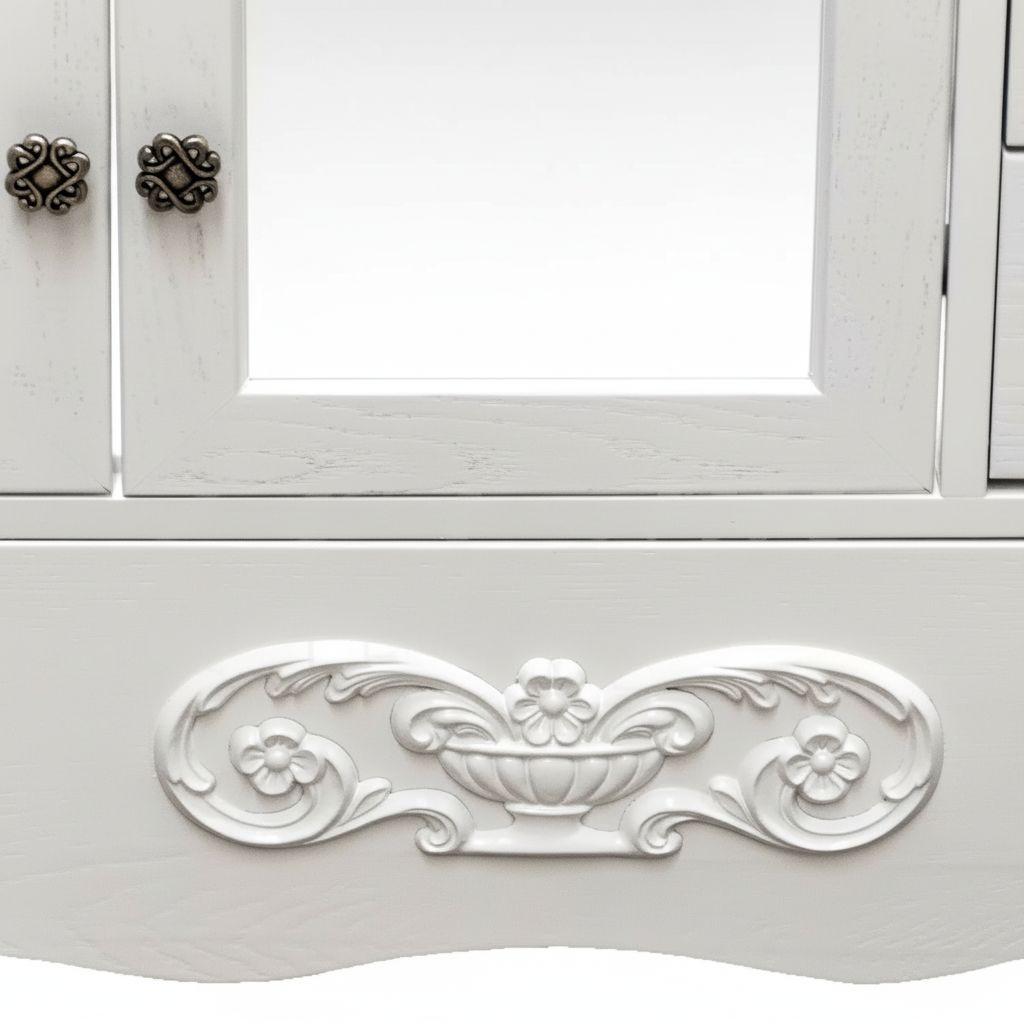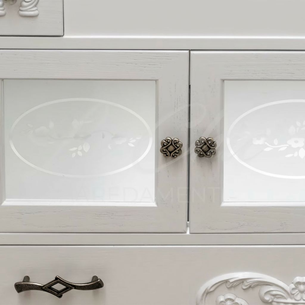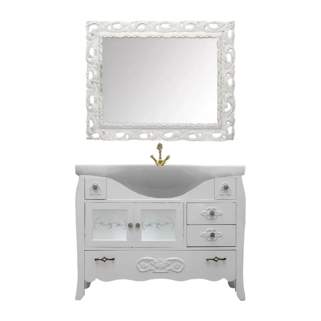 Mobile bagno in stile shabby chic, costruito interamente in legno di pioppo. Finitura laccato bianco omogeneo, realizzato completamente a mano in Italia. Dotato di 2 ante vetro sabbiato con decori con 2 cassetti laterali, 2 cassetti laterali e 1 cassettone nella parte inferiore. Unico nel suo genere per la sua laccatura e i pomoli e maniglie in bronzo anticato per non passare inosservati. Il spazio lavabo è in ceramica porcellanata di è resistente ad prodotti chimici e corrosivi. Con la base è compresa una specchiera in stile barocco. La vernice del mobile è idrorepellente.