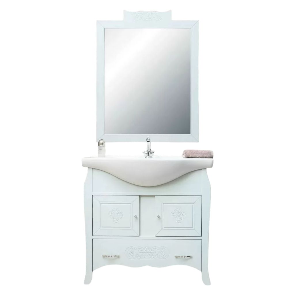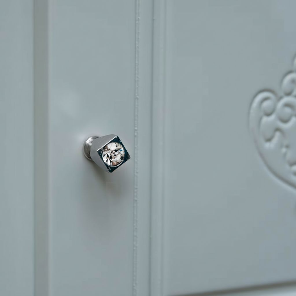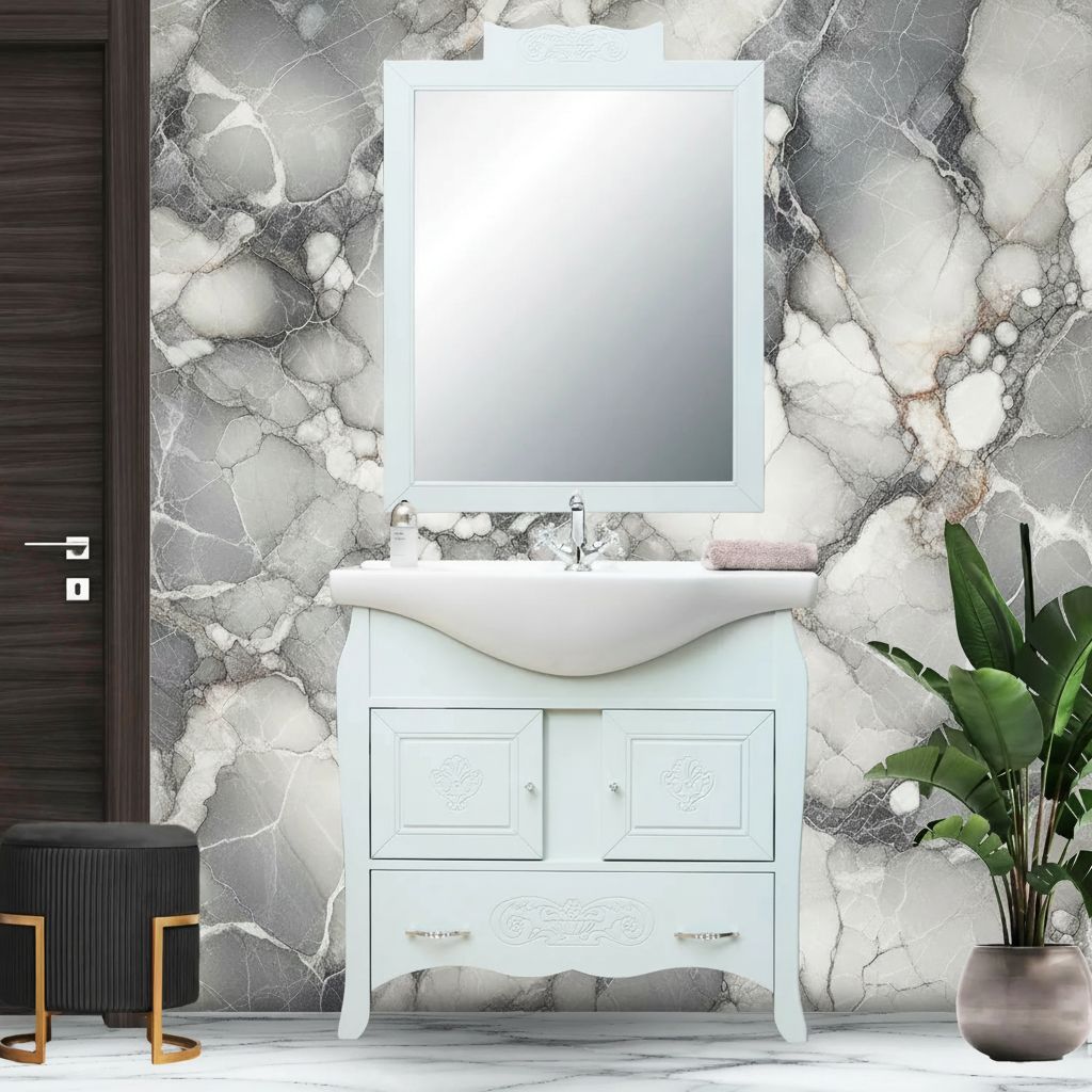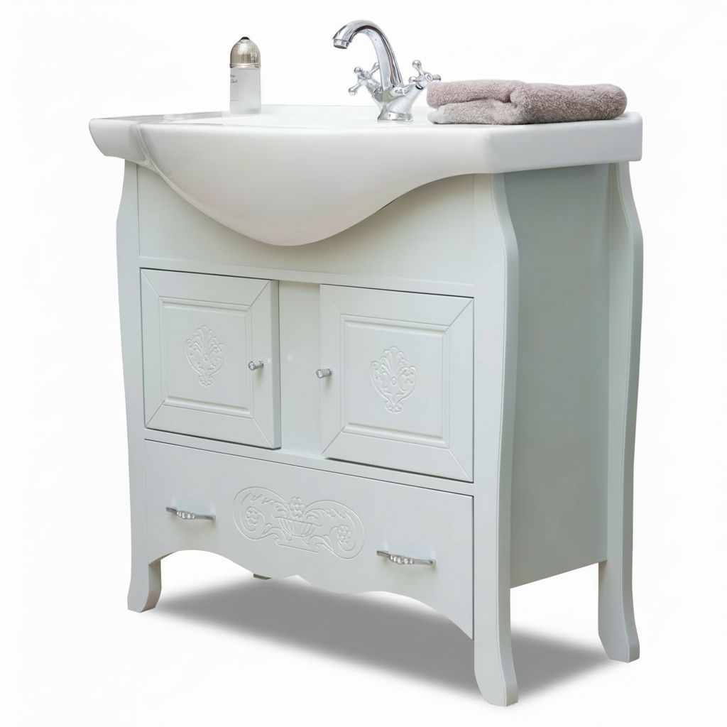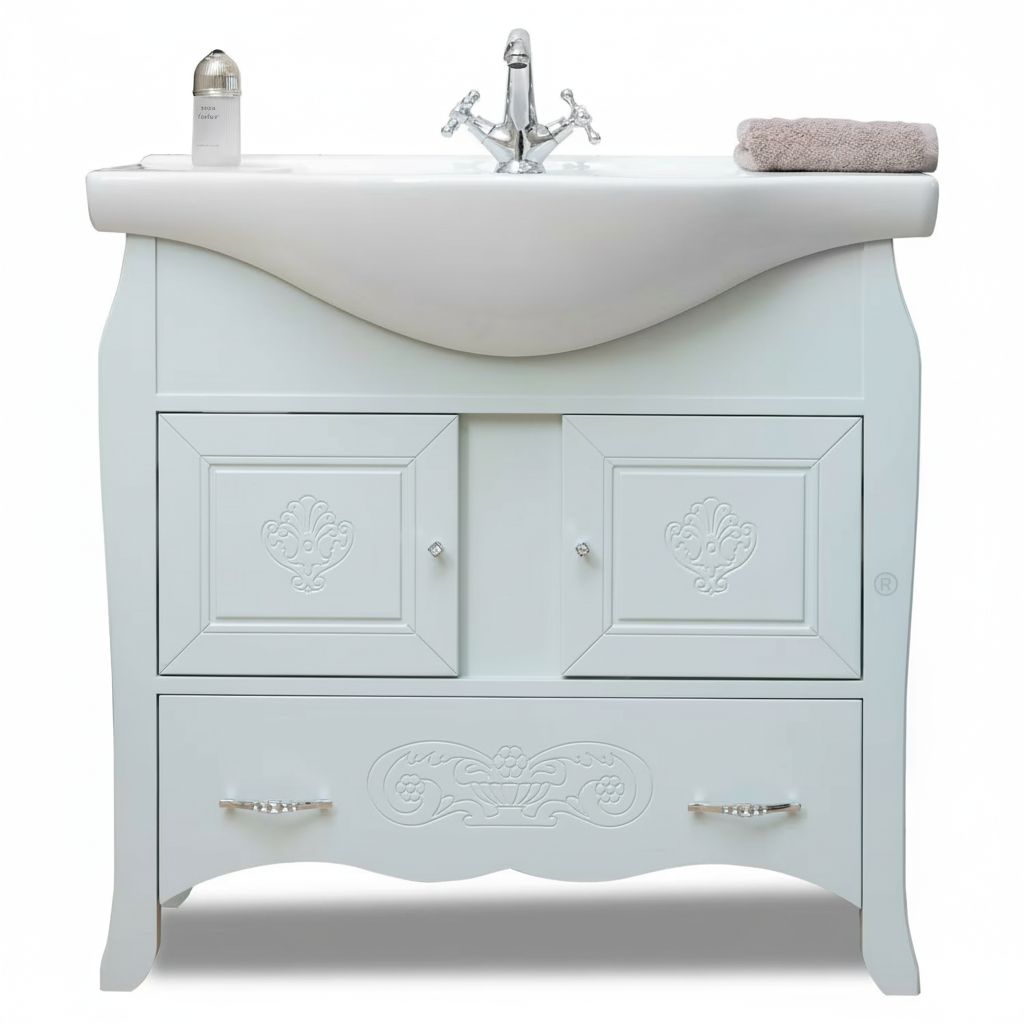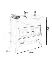 Mobile bagno in stile shabby chic, costruito interamente in legno di pioppo. Finitura laccato grigio, realizzato completamente a mano in Italia. Dotato di 2 ante e 1 cassetto per riporre asciugamani, pettini e prodotti per la cura del corpo, invece i pomelli sono in ottone argento con svarowski. Il spazioso lavabo è in ceramica resistente ad prodotti chimici e corrosivi. Con la base è compresa una specchiera in stile shabby. La vernice del mobile è idrorepellente.
