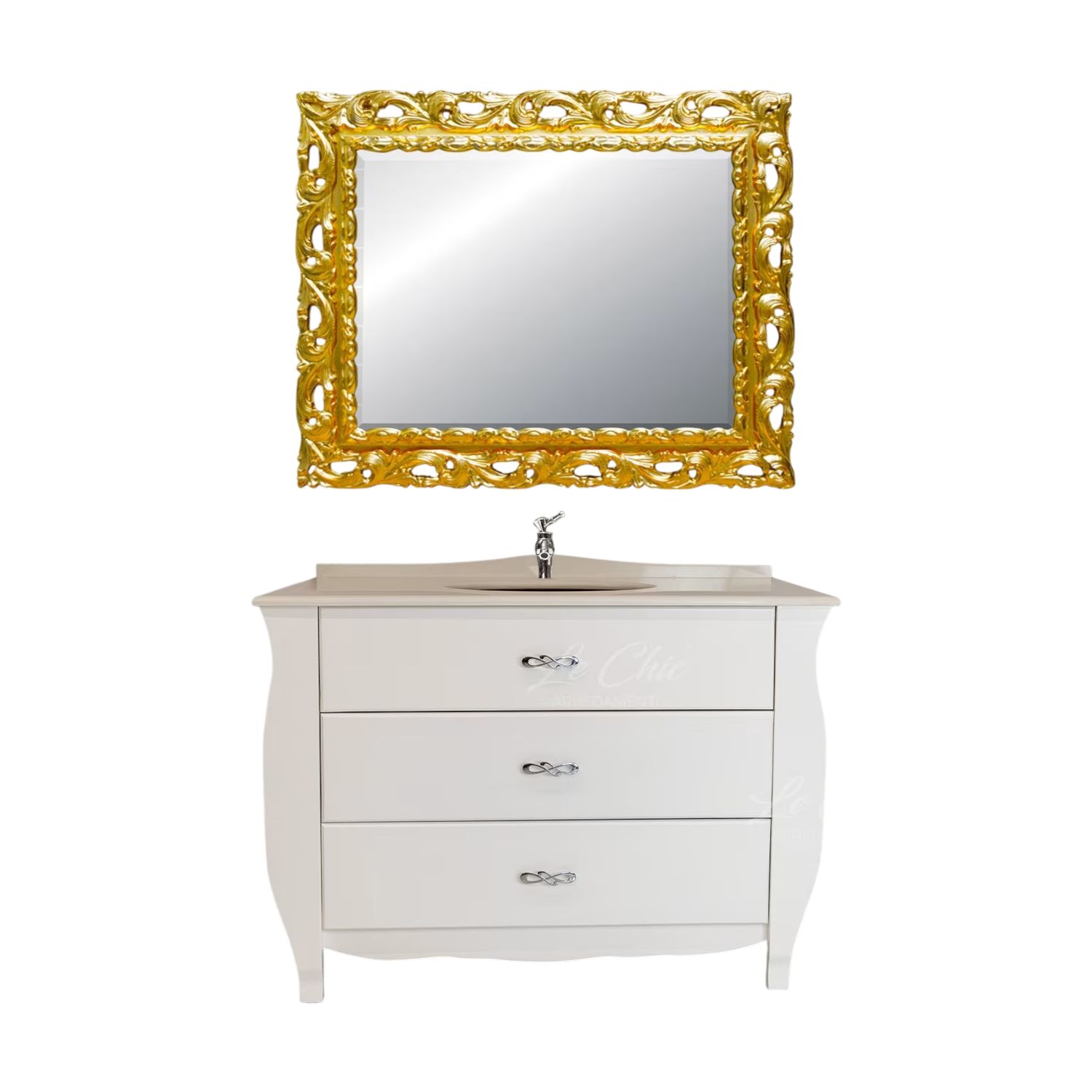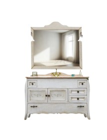 Mobile bagno in stile shabby chic, costruito interamente in MDF. Finitura laccato bianco, realizzato completamente a mano in Italia. Dotato di 3 cassetti per riporre asciugamani, pettini e prodotti per la cura del corpo. Il spazioso lavabo è in ceramica porcellanata accompagnato da un to in marmo naturale resistente ad prodotti chimici e corrosivi. Con la base è compresa una specchiera in stile barocco. La vernice del mobile è idrorepellente.
