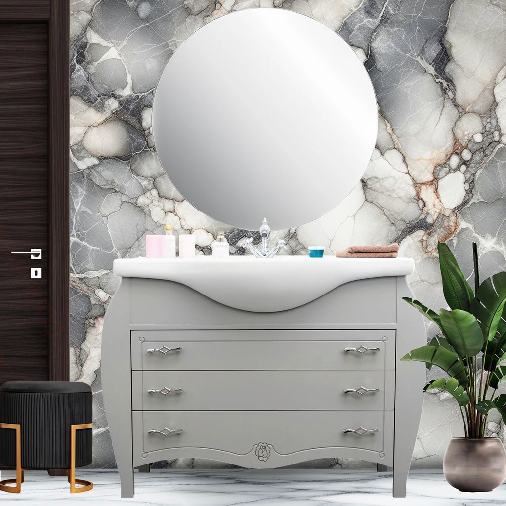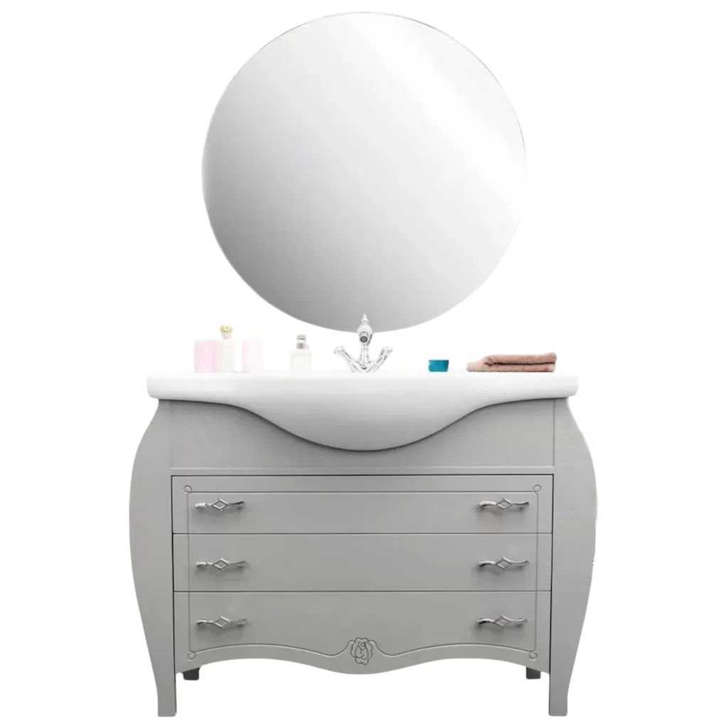 Mobile bagno in stile shabby chic, costruito interamente in legno di pioppo. Finitura laccato grigio, realizzato completamente a mano in Italia. Dotato di 3 cassetti per riporre asciugamani, pettini e prodotti per la cura del corpo, invece le maniglie sono in acciaio. Il spazioso lavabo è in ceramica resistente ad prodotti chimici e corrosivi. Con la base è compresa uno specchiera circolare. La vernice del mobile è idrorepellente.