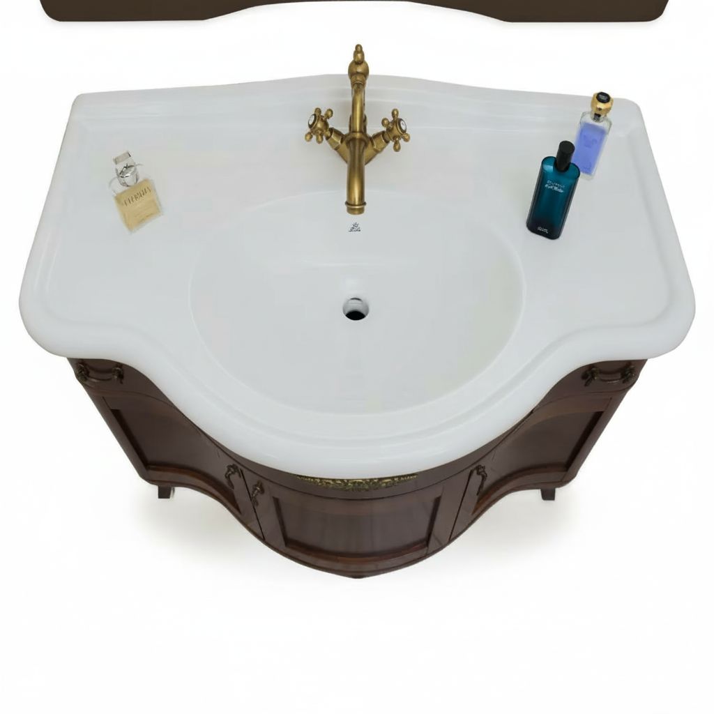 Mobile bagno in arte povera, costruito interamente in legno di pioppo realizzato completamente a mano in Italia. Dotato di 3 cassettoni centrali e 2 cassettini superiori molto capienti con 2 ante battenti per riporre asciugamani, pettini, spazzole e prodotti per la cura del corpo. Unico nel suo genere per la sua sagomatura elegante aggiungendo un tocco di gusto retrò con l'aggiunta dei pomoli e maniglie in ottone anticato. affiancata da una colonna con 2 porte e 1 cassetto. Il lavabo in ceramica è resistente ad prodotti chimici e corrosivi. Con la base è compresa una specchiera con 2 applique in vetro satinato. La vernice del mobile è idrorepellente.