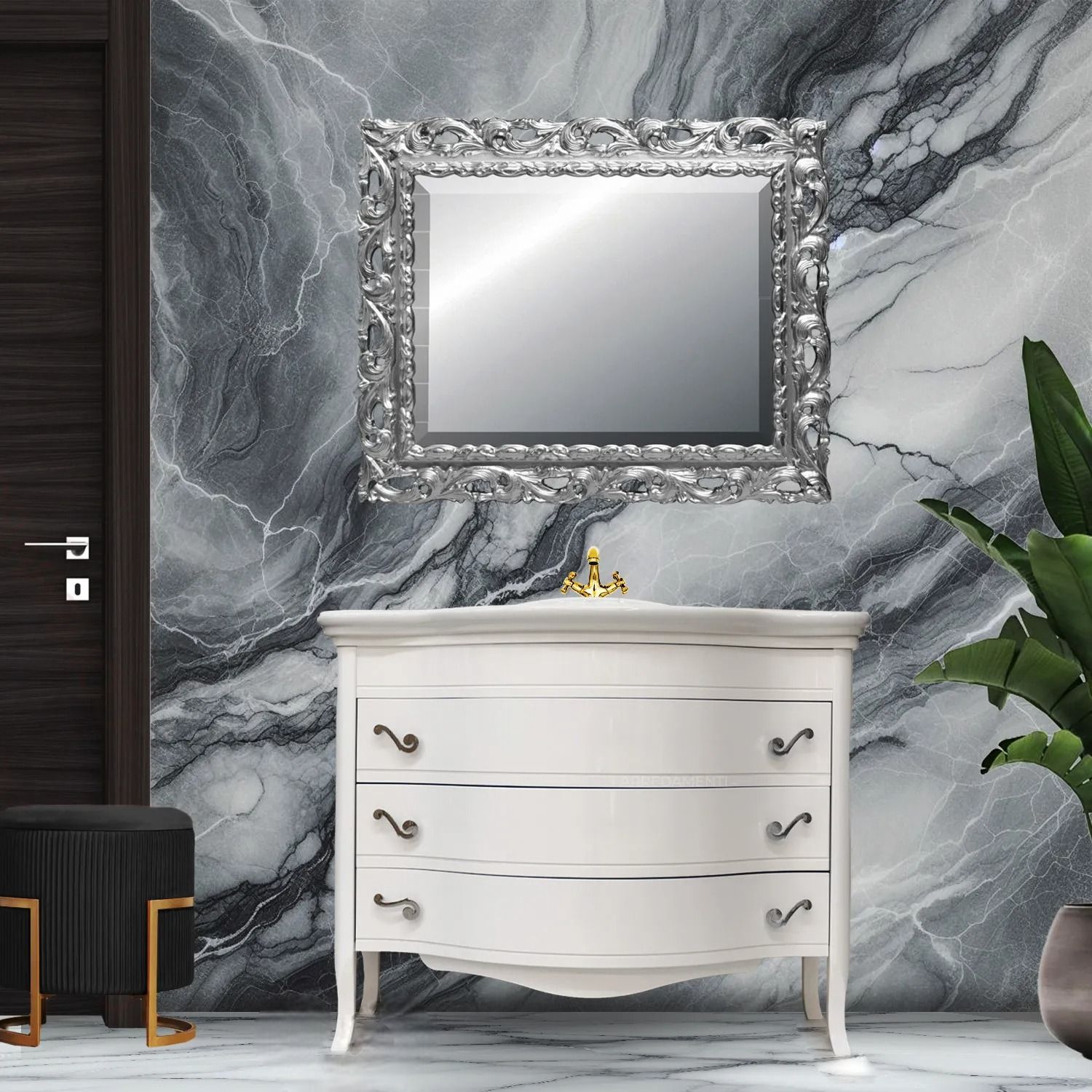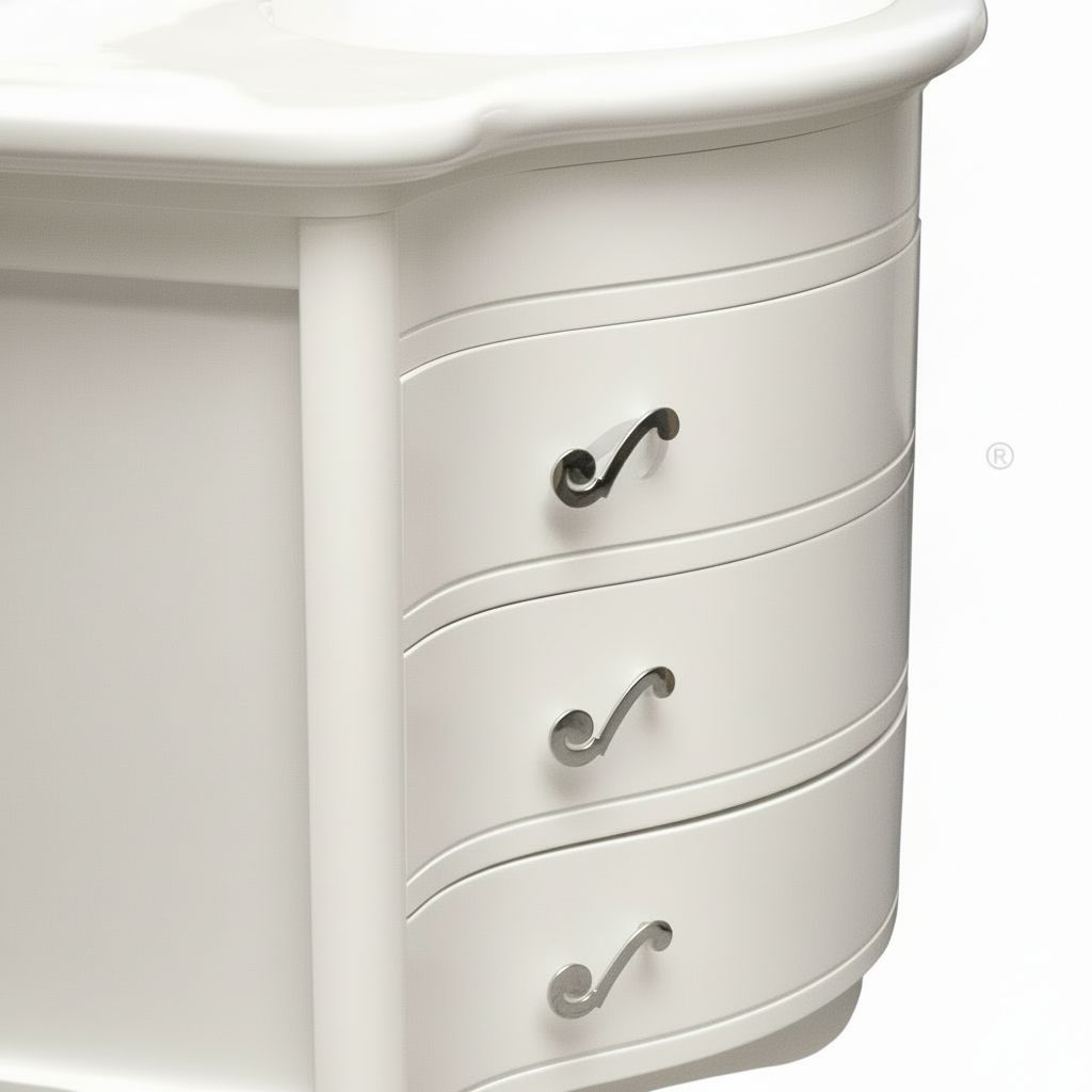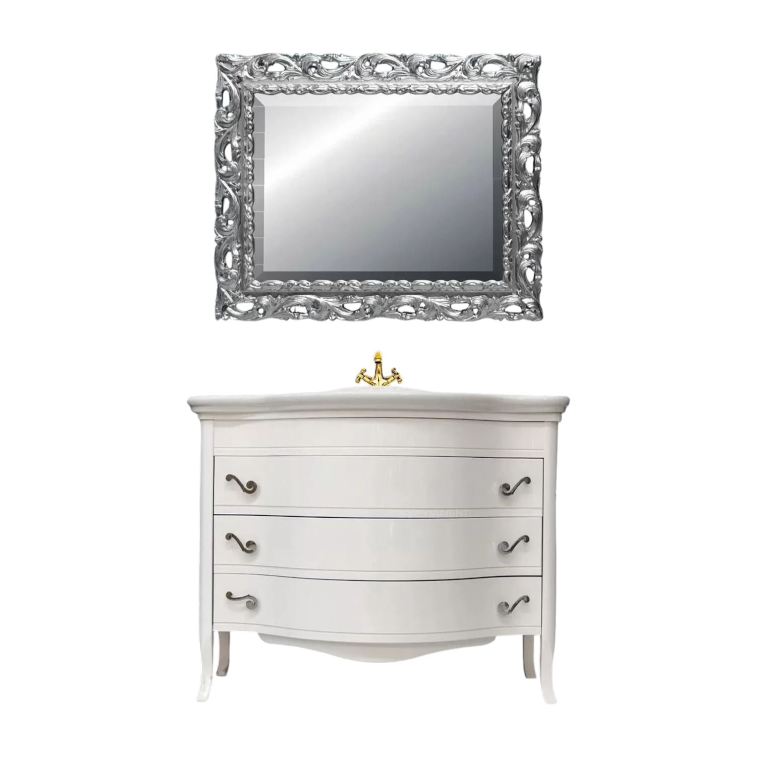 Mobile bagno in stile shabby chic, costruito interamente in legno massello. Finitura laccato bianco opaco, realizzato completamente a mano in Italia. Dotato di 3 cassetti per riporre asciugamani, pettini e prodotti per la cura del corpo. Il spazioso lavabo è in ceramica porcellanata resistente ad prodotti chimici e corrosivi. Con la base è compresa una specchiera in stile barocco. La vernice del mobile è idrorepellente.