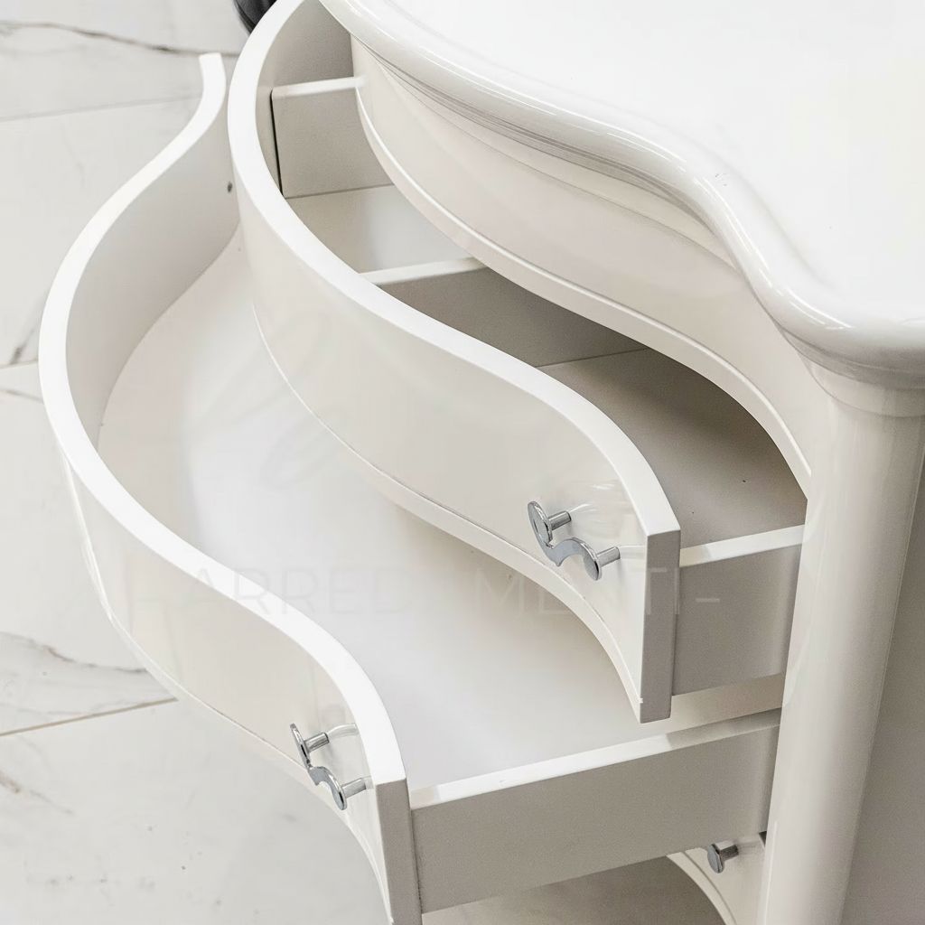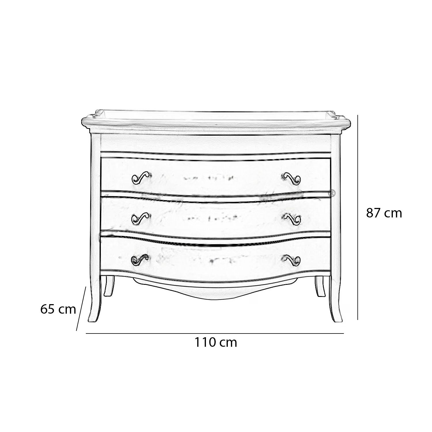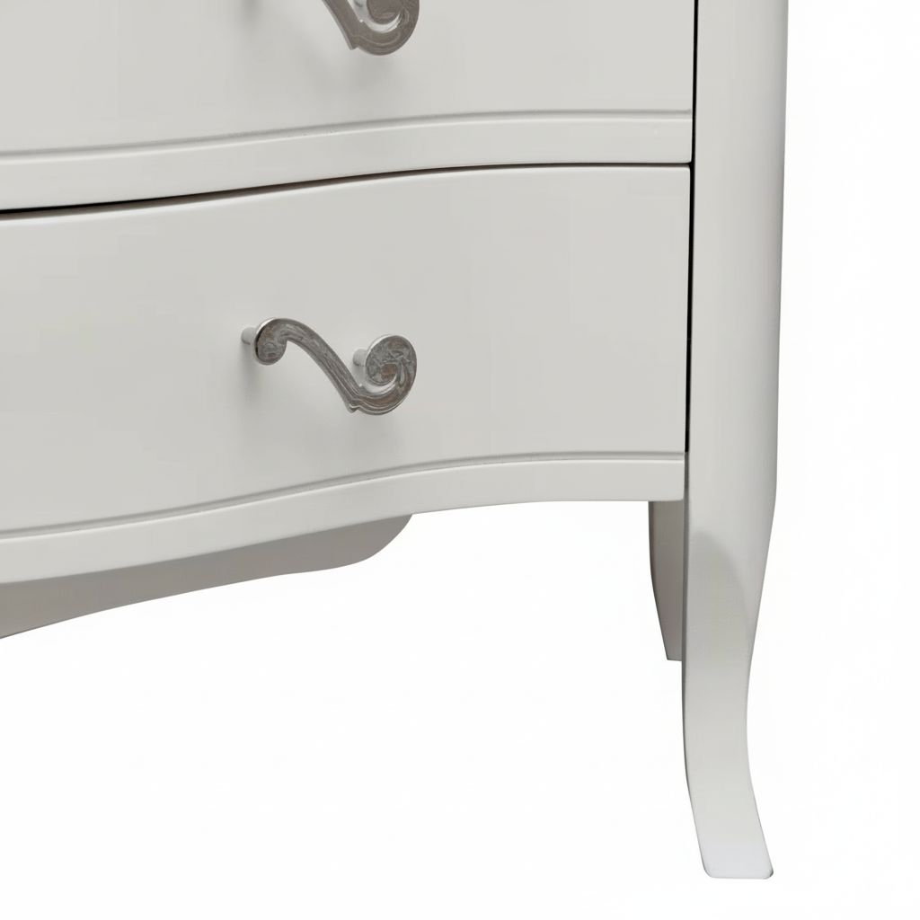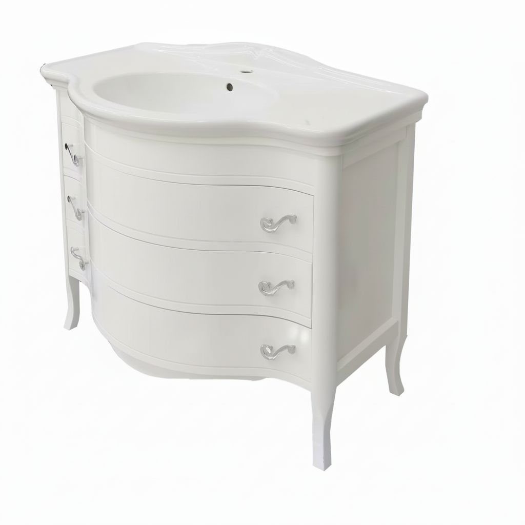 Mobile bagno in stile shabby chic, costruito interamente in legno massello. Finitura laccato bianco opaco, realizzato completamente a mano in Italia. Dotato di 3 cassetti per riporre asciugamani, pettini e prodotti per la cura del corpo. Il spazioso lavabo è in ceramica porcellanata resistente ad prodotti chimici e corrosivi. Con la base è compresa una specchiera in stile barocco. La vernice del mobile è idrorepellente.