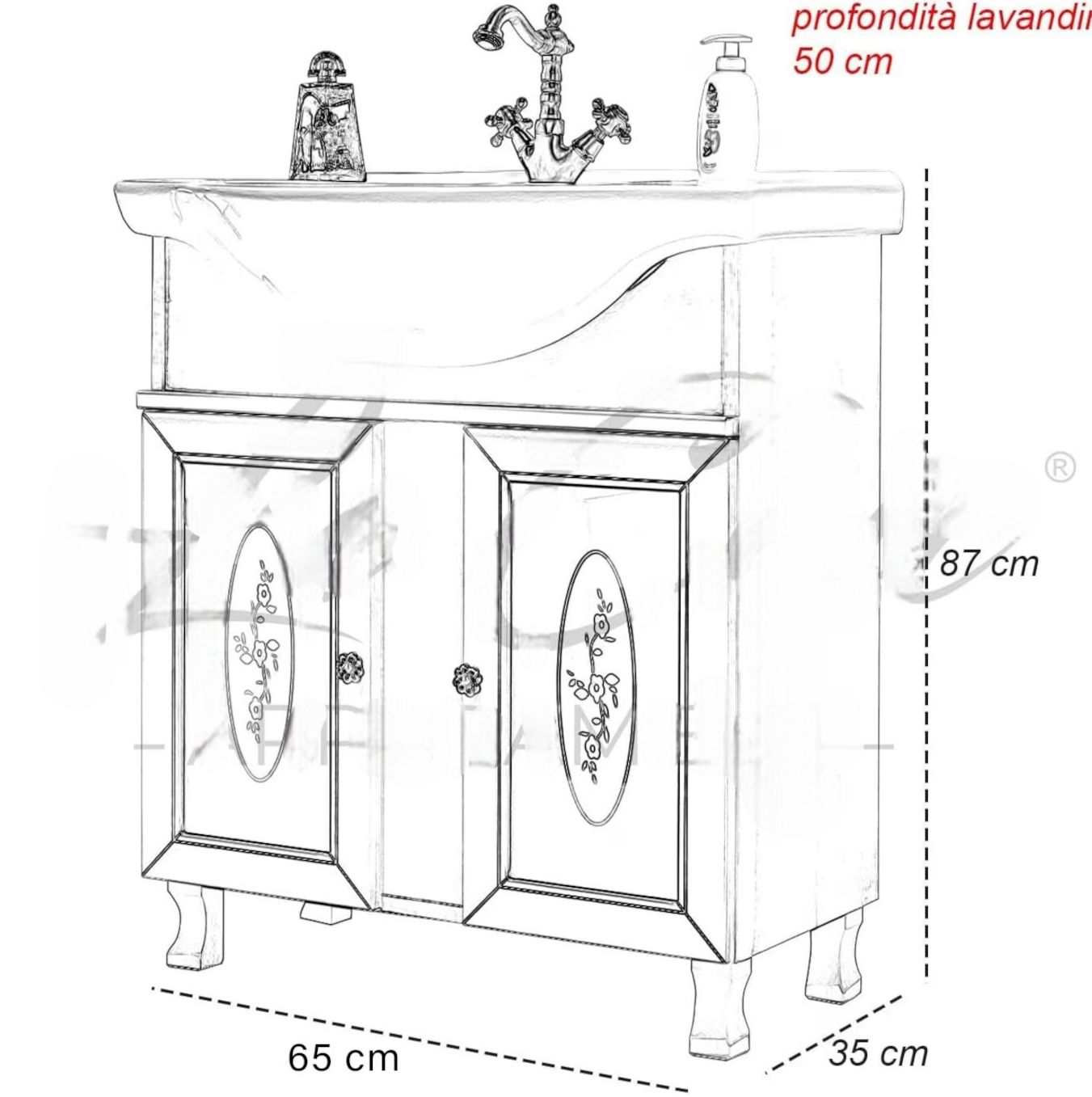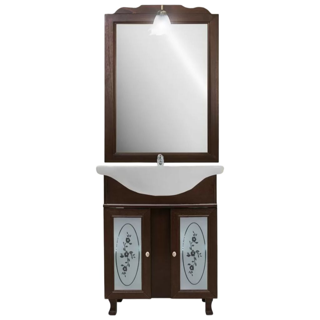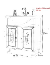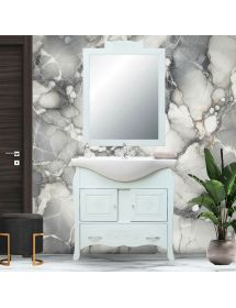 Mobile bagno in arte povera, costruito interamente in legno di pioppo realizzato completamente a mano in Italia. Dotato di 2 porte in vetro sabbiato decorato molto capienti per riporre spazzole, asciugamani e prodotti per il bagno. Unico nel suo genere per i pomoli in ceramica con decori floreali. Il lavabo è in ceramica porcellanata resistente ad prodotti chimici e corrosivi. Con la base è compresa una specchiera con applique. La vernice del mobile è idrorepellente. Ideale da posizionare su spazi stretti di difficile passaggio come solitamente è la zona bagno.
