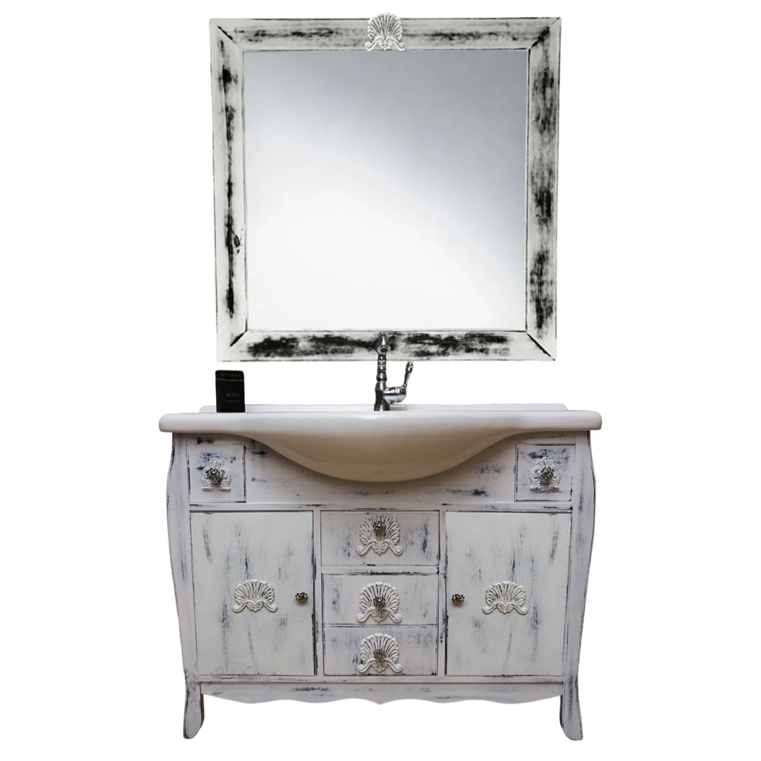 Con la base è compresa una specchiera in stile shabby anticato e un lavabo in ceramica porcellanata, resistente ad prodotti chimici e allo stesso tempo facile da pulire. La vernice del mobile è idrorepellente.