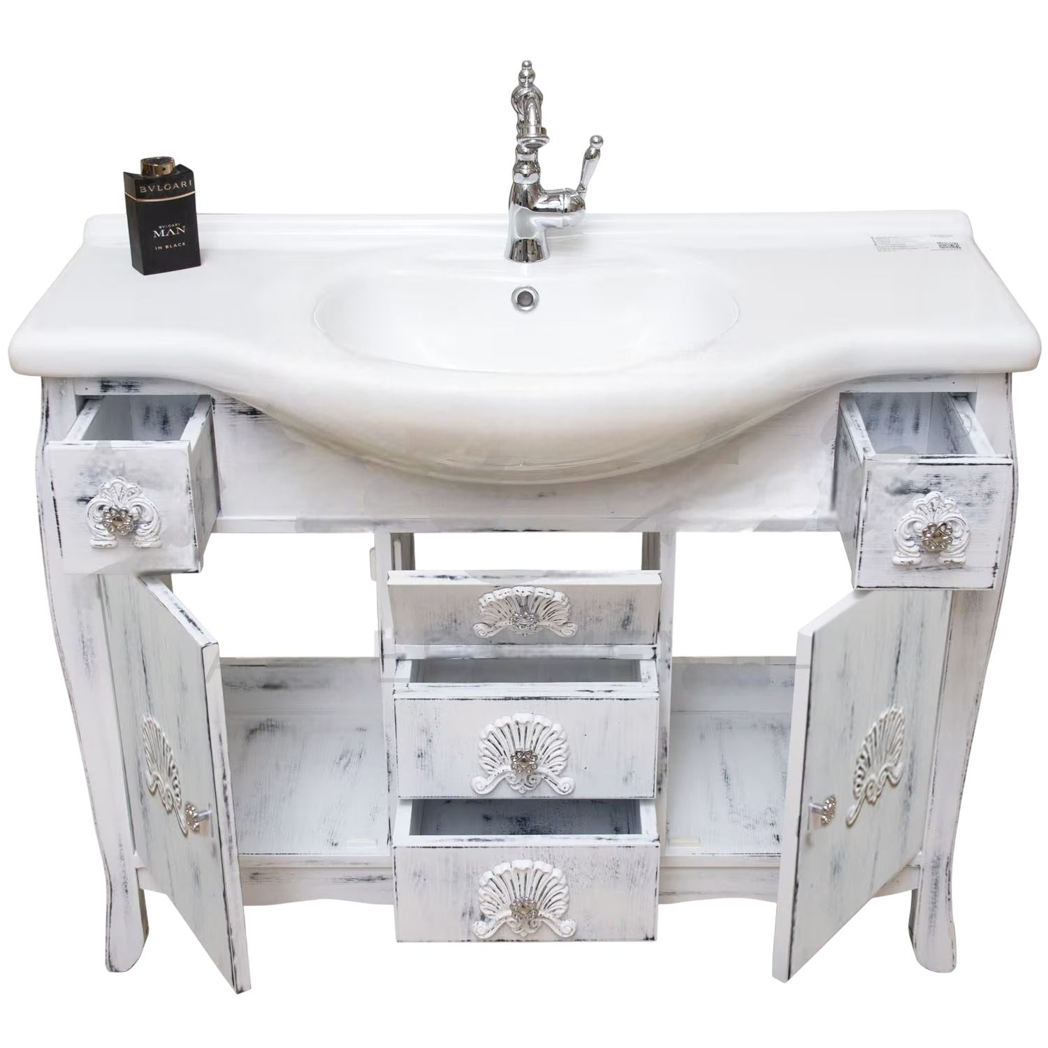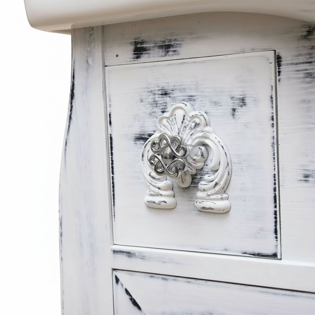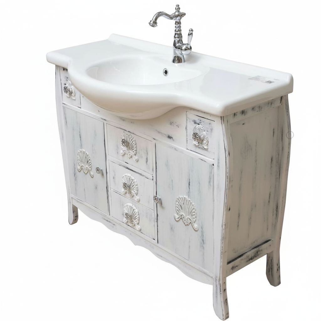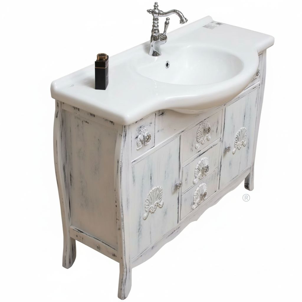 Mobile bagno in stile shabby, costruito interamente in legno di rovere. Finitura bianco anticato, realizzato completamente a mano in Italia. Dotato di 2 ante, 3 cassetti in linea e ben 2 cassettini laterali, frontale delle porte e dei cassetti con decori apposti a mano.