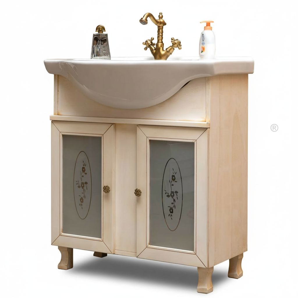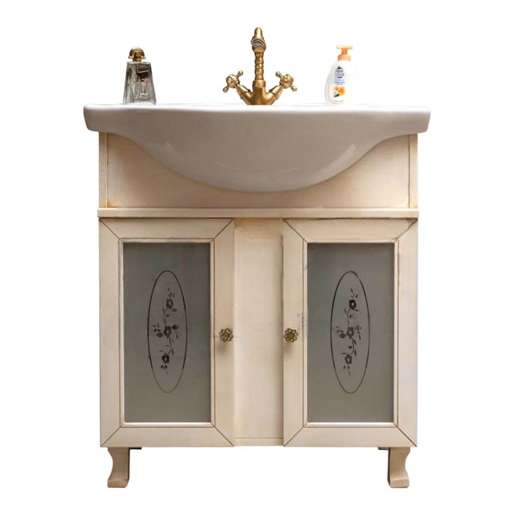 Mobile bagno in arte povera, costruito interamente in legno di pioppo realizzato completamente a mano in Italia. Dotato di 2 porte in vetro sabbiato decorato molto capienti per riporre spazzole, asciugamani e prodotti per il bagno. Unico nel suo genere per la laccatura avorio anticato. Il lavabo è in ceramica porcellanata resistente ad prodotti chimici e corrosivi. Con la base è compresa una specchiera con applique. La vernice del mobile è idrorepellente. Ideale da posizionare su spazi stretti di difficile passaggio come solitamente è la zona bagno.