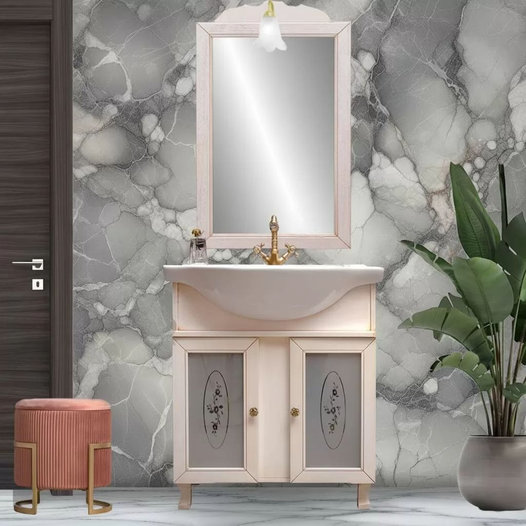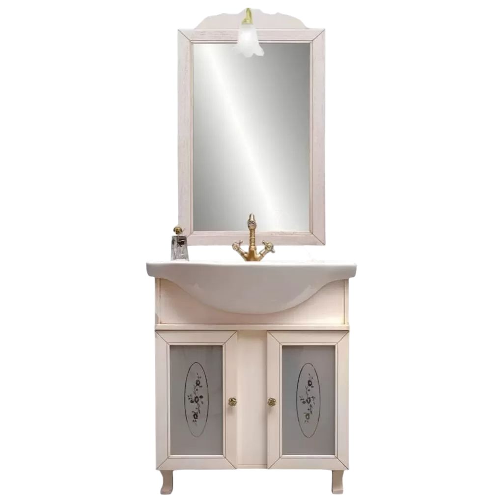 Mobile bagno in arte povera, costruito interamente in legno di pioppo realizzato completamente a mano in Italia. Dotato di 2 porte in vetro sabbiato decorato molto capienti per riporre spazzole, asciugamani e prodotti per il bagno. Unico nel suo genere per la laccatura avorio anticato. Il lavabo è in ceramica porcellanata resistente ad prodotti chimici e corrosivi. Con la base è compresa una specchiera con applique. La vernice del mobile è idrorepellente. Ideale da posizionare su spazi stretti di difficile passaggio come solitamente è la zona bagno.