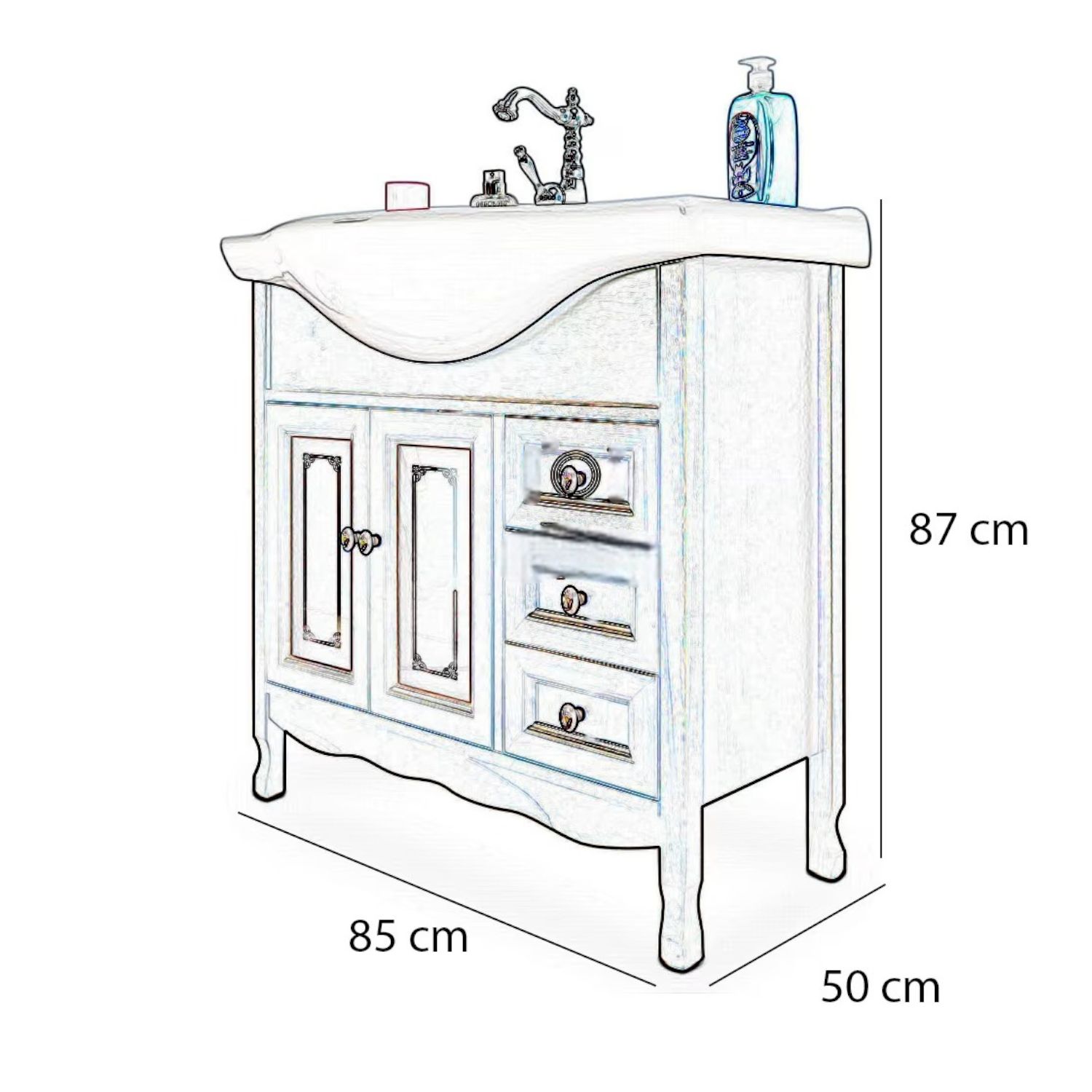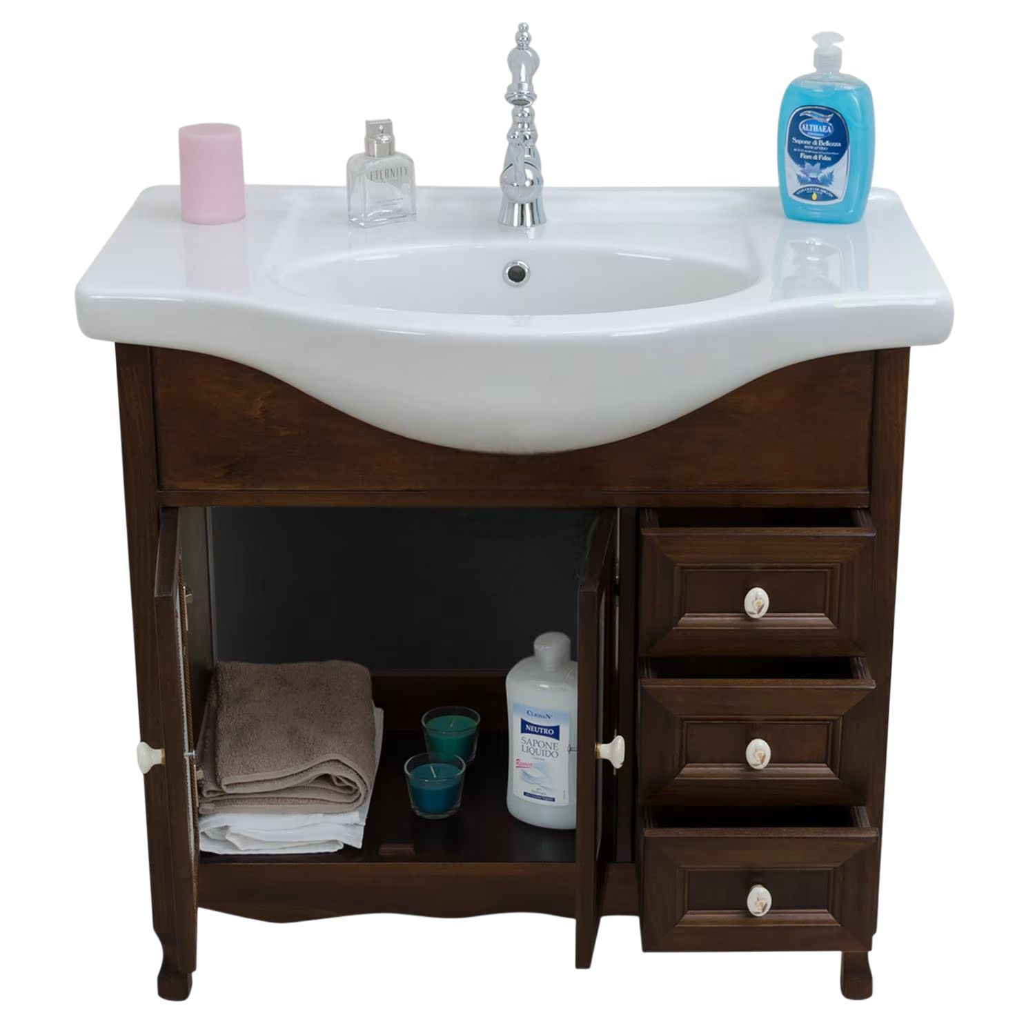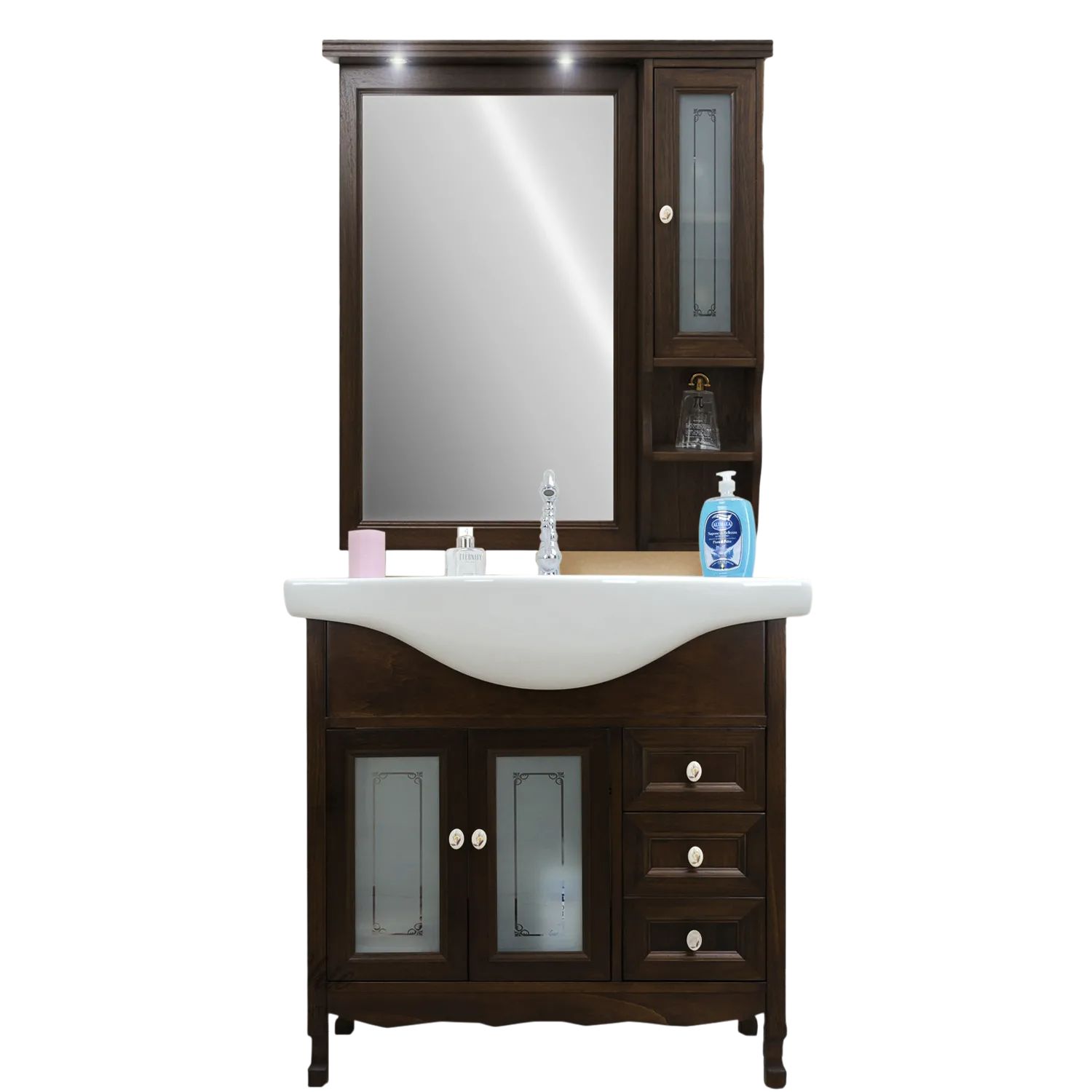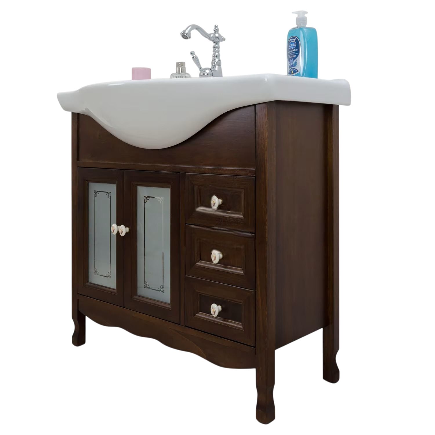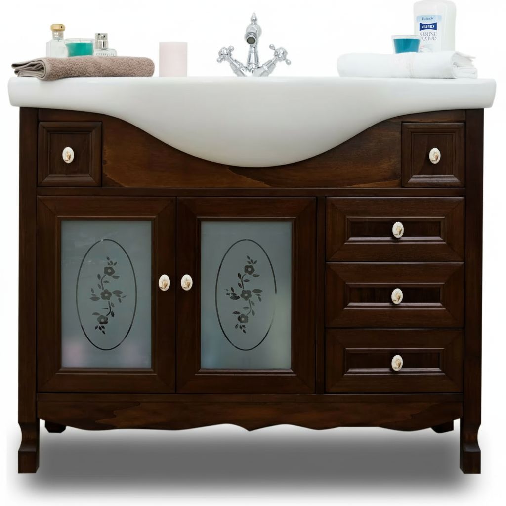 Mobile bagno in arte povera, costruito interamente in legno di pioppo realizzato completamente a mano in Italia. Dotato di 2 ante con vetro sabbiato con decori, 3 cassetti laterali. Unico nel suo genere in tinta noce e i pomoli in ceramica con disegni floreali, per non passare inosservati per il suo stile raffinato ed elegante. Il spazioso lavabo è in ceramica resistenti ad prodotti chimici e corrosivi. Con la base è compresa una specchiera in stile barocco con anta in vetro sabbiato e decori. La vernice del mobile è idrorepellente.