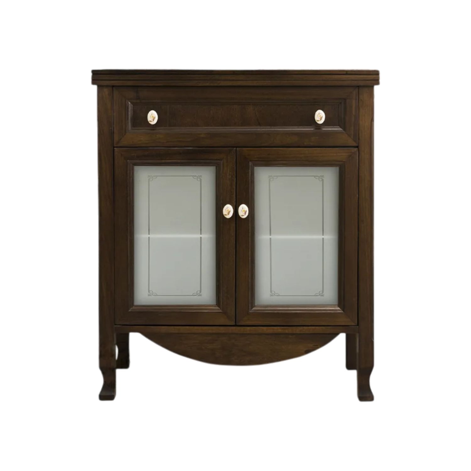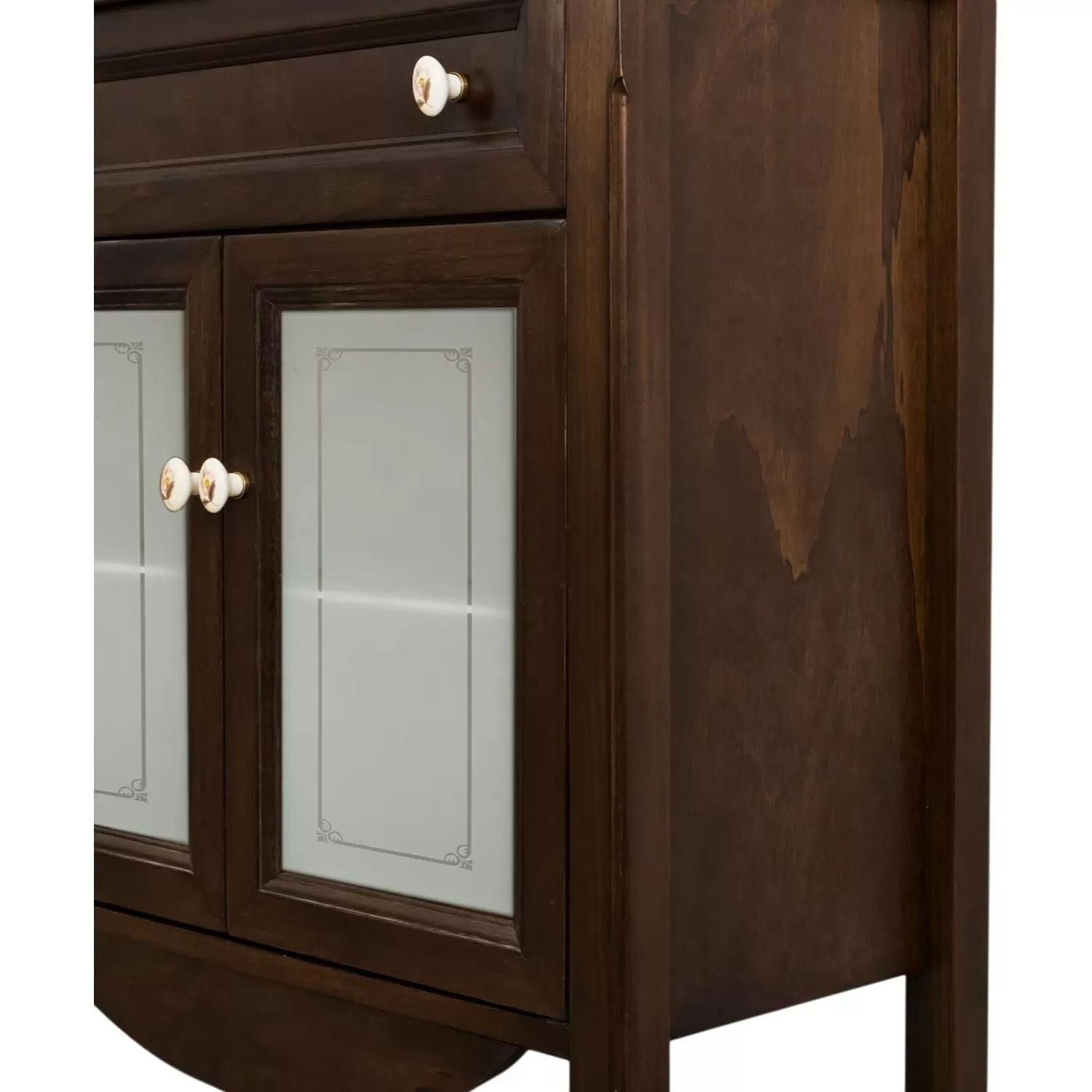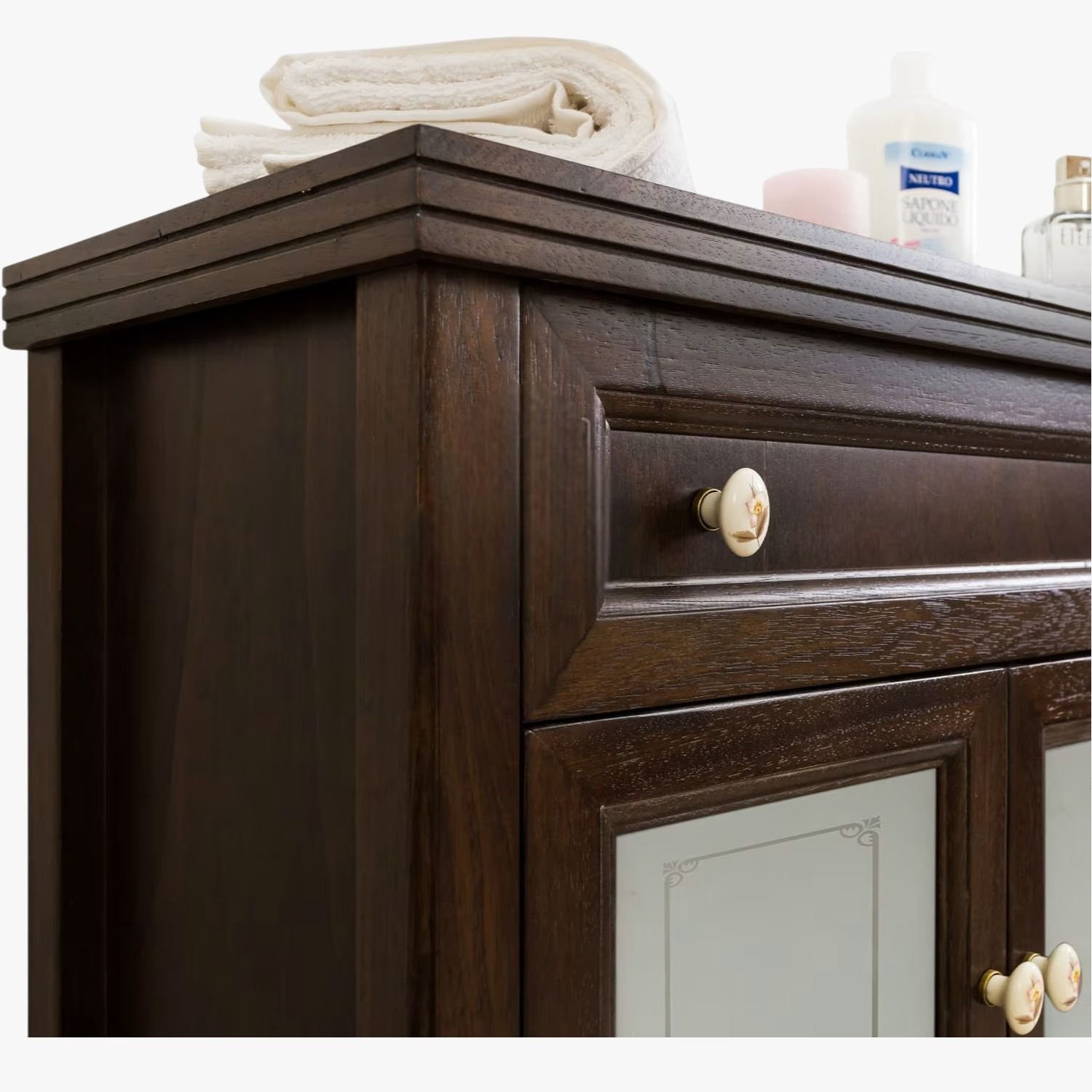Con una finitura noce calda e avvolgente, questo mobile saprà donare al vostro spazio più intimo carattere e personalità, valorizzando l’ambiente con un tocco romantico e raffinato, grazie ai dettagli floreali dei pomoli in ceramica.