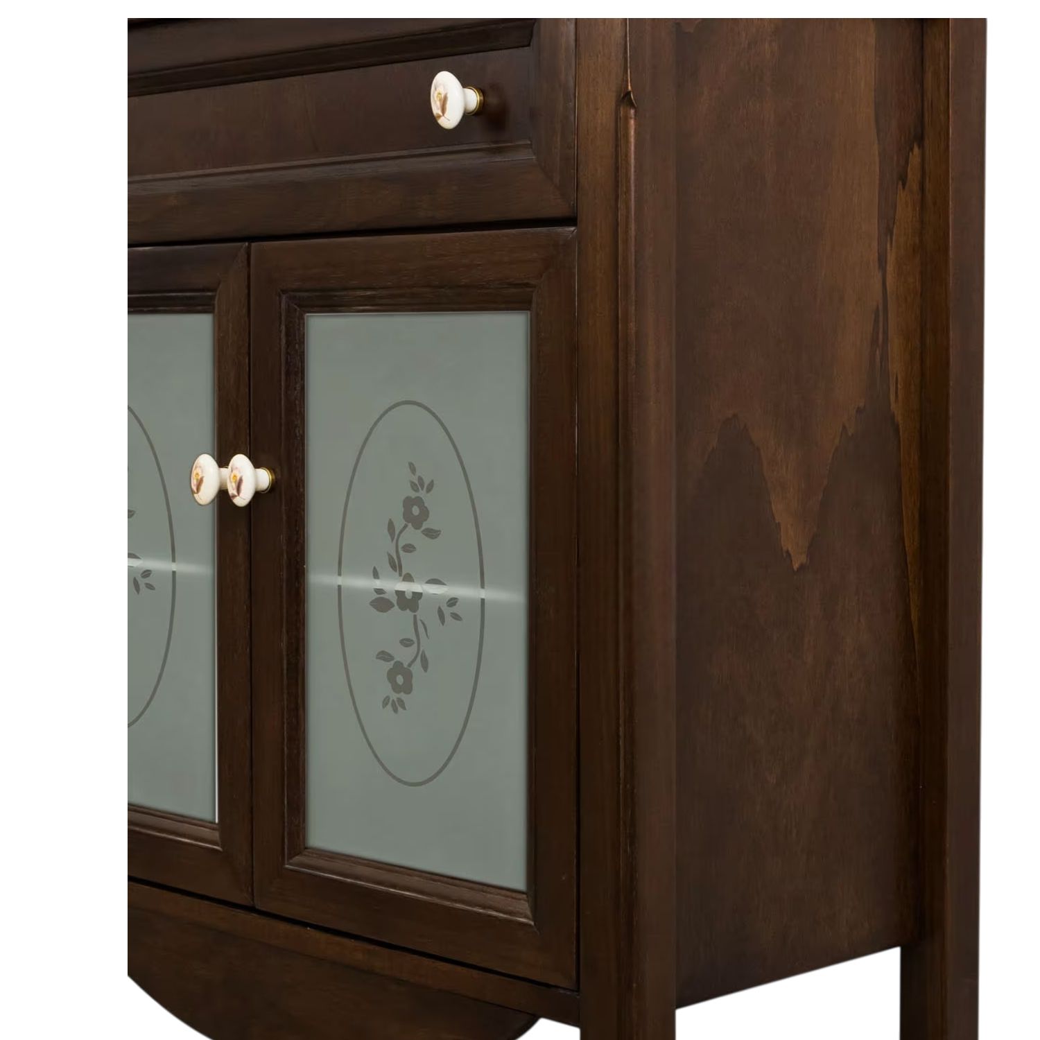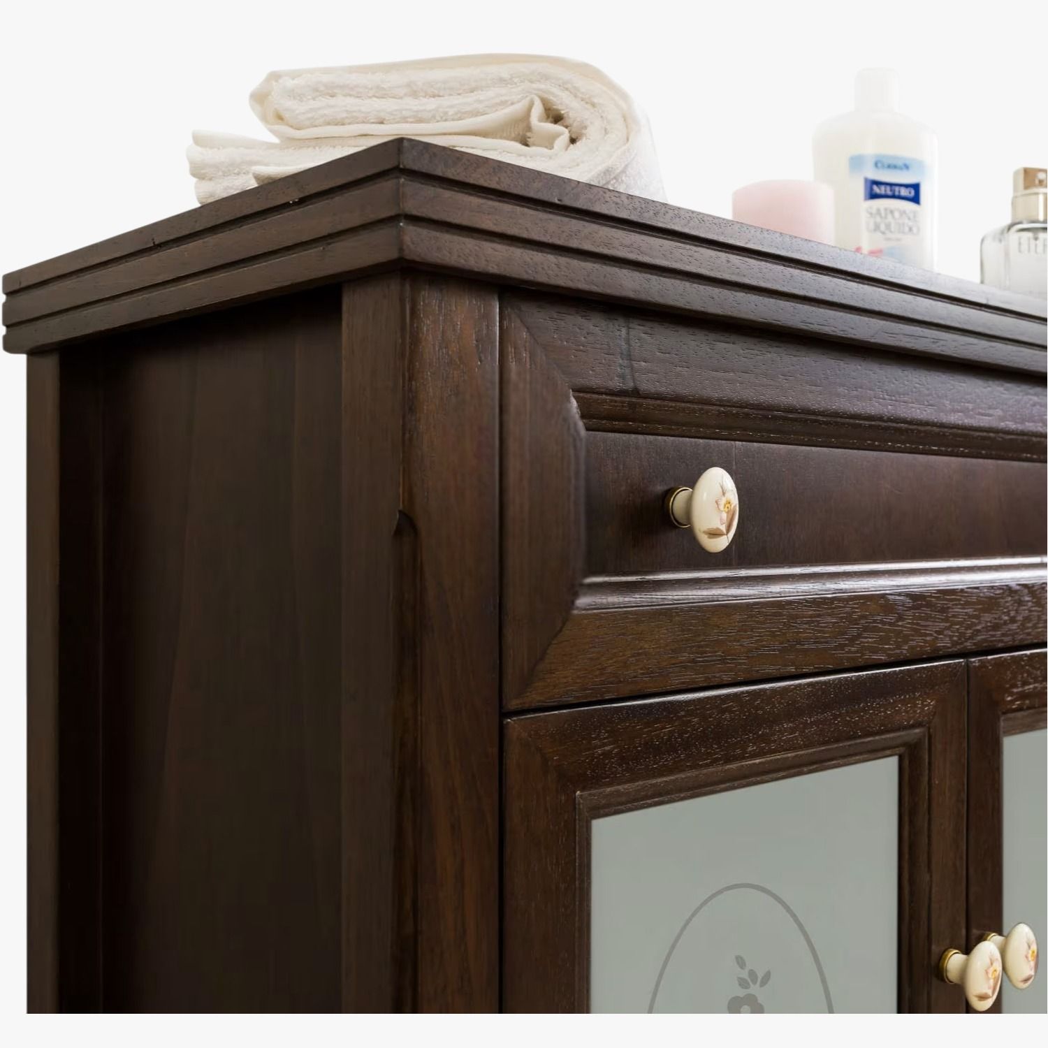 Con una finitura noce calda e avvolgente, questo mobile saprà donare al vostro spazio più intimo carattere e personalità, valorizzando l’ambiente con un tocco romantico e raffinato, grazie ai dettagli floreali dei pomoli in ceramica.