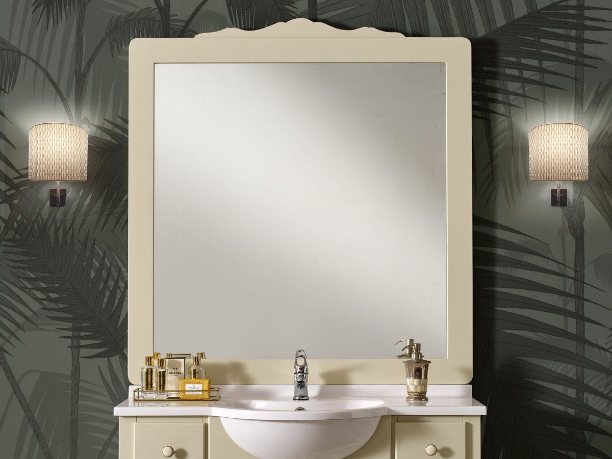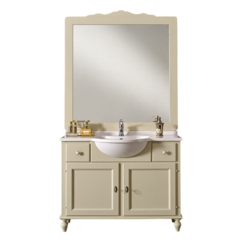 Mobile da bagno composto da base, lavabo in mineralmarmo e specchiera di generose dimensioni. Il mobile ha forme raffinate ed eleganti, impreziosite negli angoli da gambe finemente tornite. Questo mobile da bagno è dotato di due cassetti e due antine.