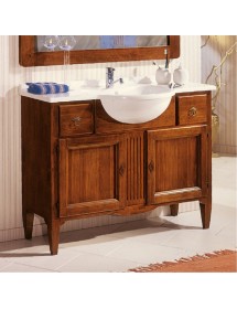 Mobile da bagno composto da base, lavabo in mineralmarmo e specchiera di generose dimensioni. Il mobile ha forme semplici ed essenziali, perfette per un bagno in stile classico. Questo mobile da bagno è dotato di due cassetti e due antine, separate dl centro da un elemento intagliato. Specchiera di grandi dimensioni con elemento decorativo superiore.