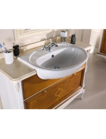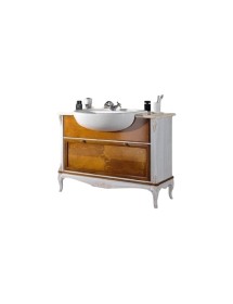 Mobile da bagno con ampia ribalta anteriore con pannello intarsiato. Elegante e raffinata con i suoi intarsi e le forme arrotondate, arricchite da particolari intagliati nel legno massello e con il marmo che riprende negli angoli la bombatura della gamba, si adatta a qualsiasi ambiente sia classico che contemporaneo rendendolo importante ed unico.