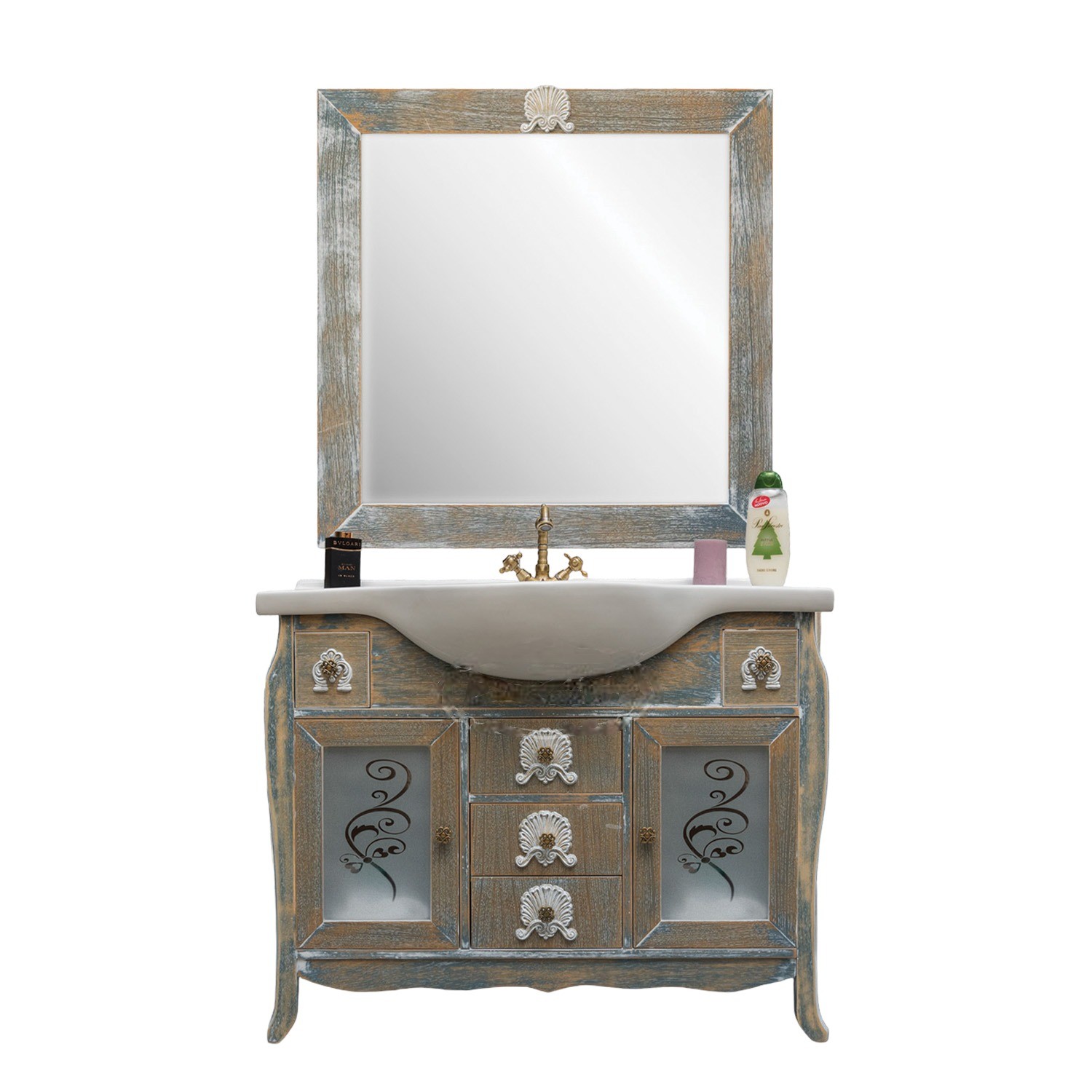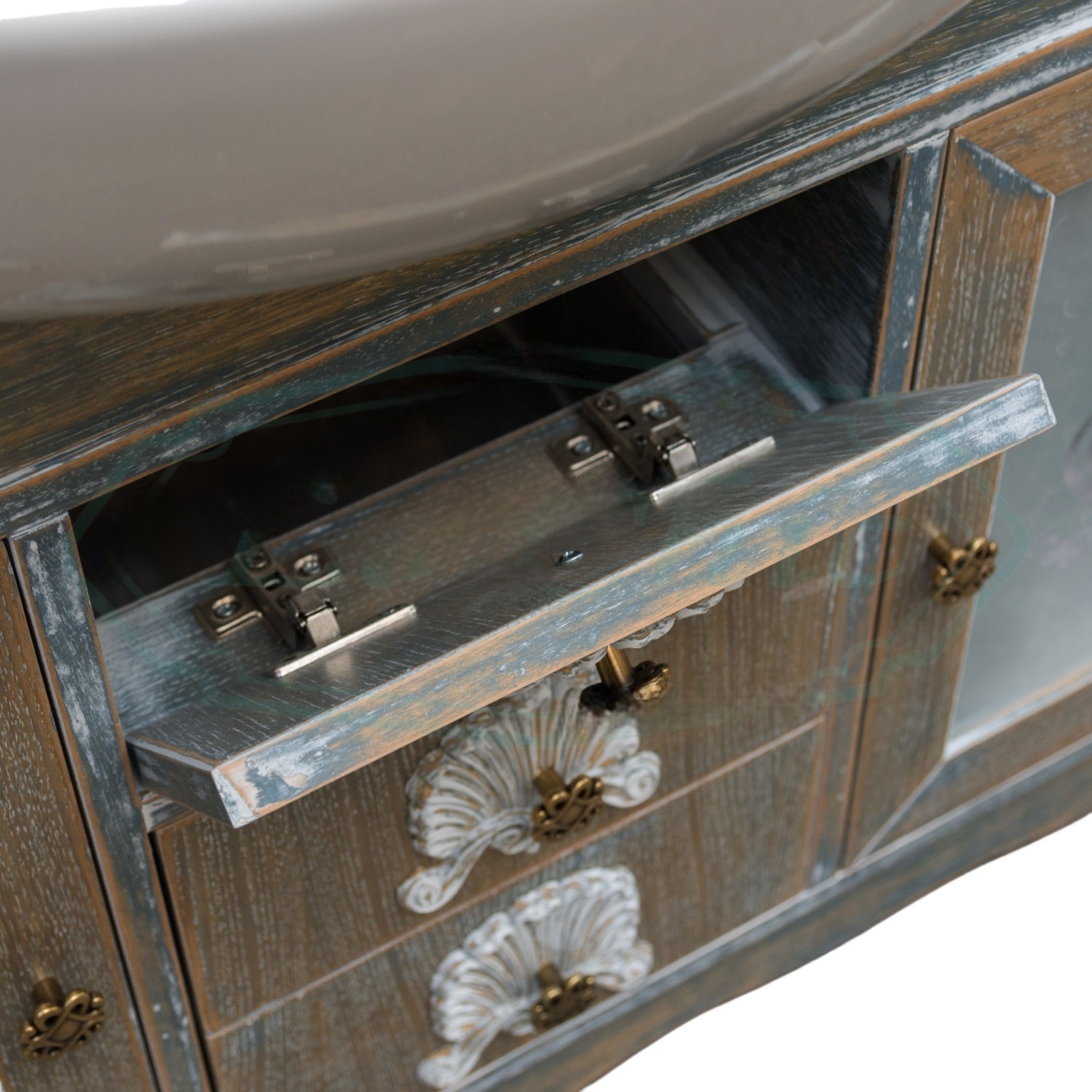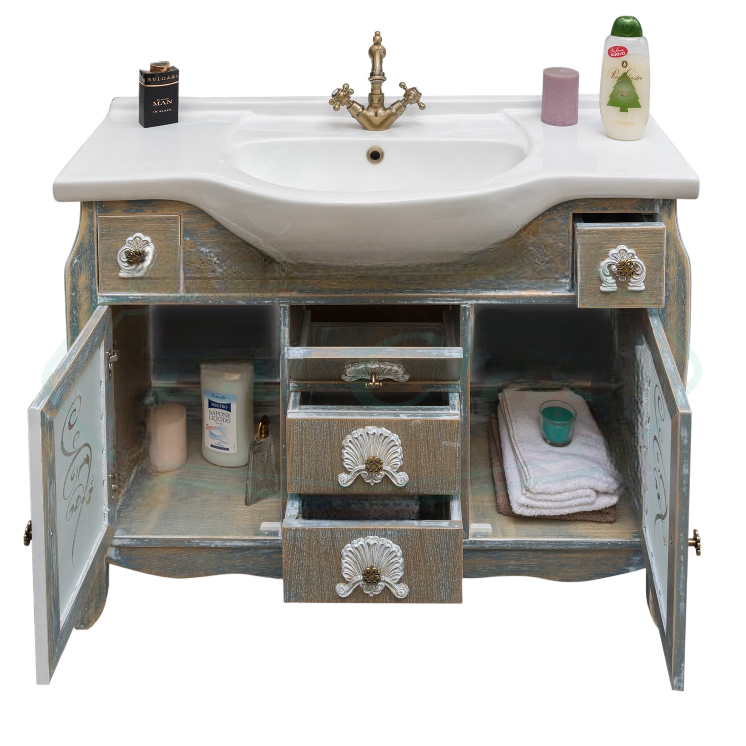 Mobile bagno in stile shabby, costruito interamente in legno di rovere. Finitura anticata, realizzato completamente a mano in Italia. Dotato di 2 ante con vetri satinati, 3 cassetti in linea e ben 2 cassettini laterali, ha i fianchi in legno massello e i pomelli in ottone con con decori apposti a mano.
