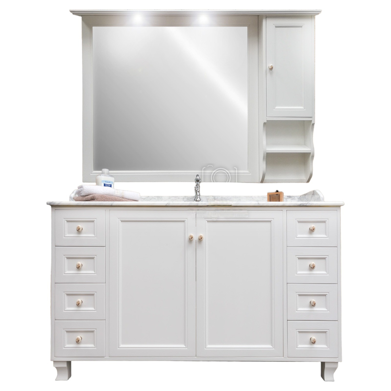 Mobile bagno in stile shabby chic, costruito interamente in legno di pioppo. Finitura laccato bianco, realizzato completamente a mano in Italia. Dotato di 2 ante centrali battenti e ben 8 cassettini laterali, pomelli in ceramica con base in ottone. Con la base è compresa una specchiera in stile shabby con 2 faretti a led e un top in marmo, resistente ad prodotti chimici e allo stesso tempo facile da pulire. La vernice del mobile è idrorepellente.
