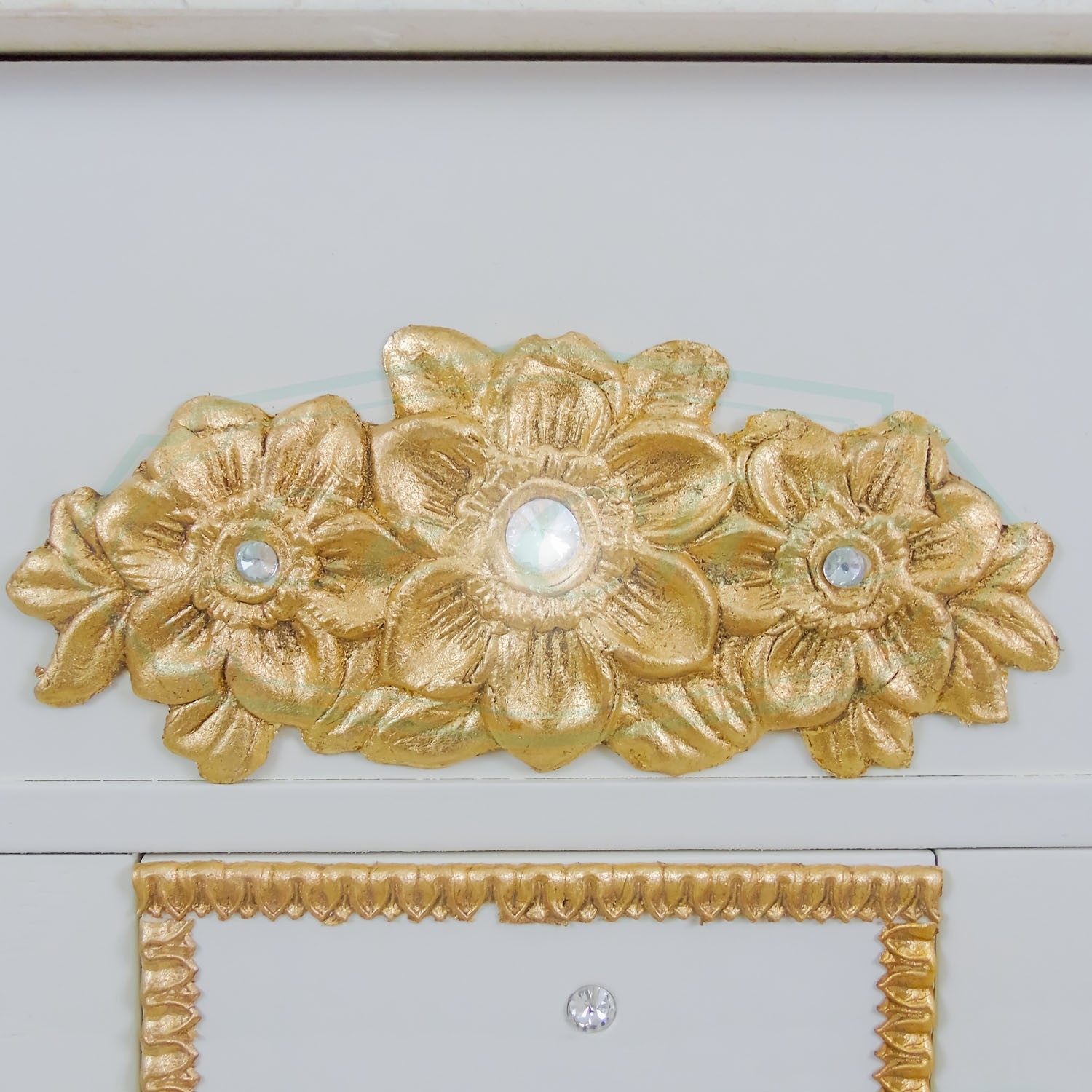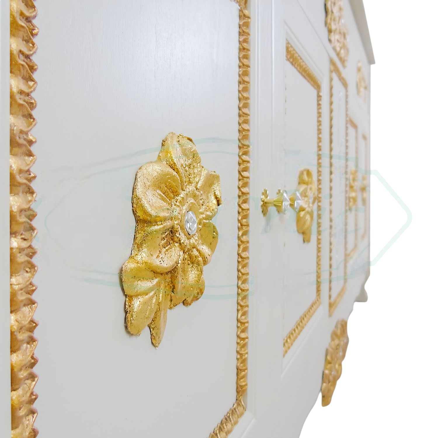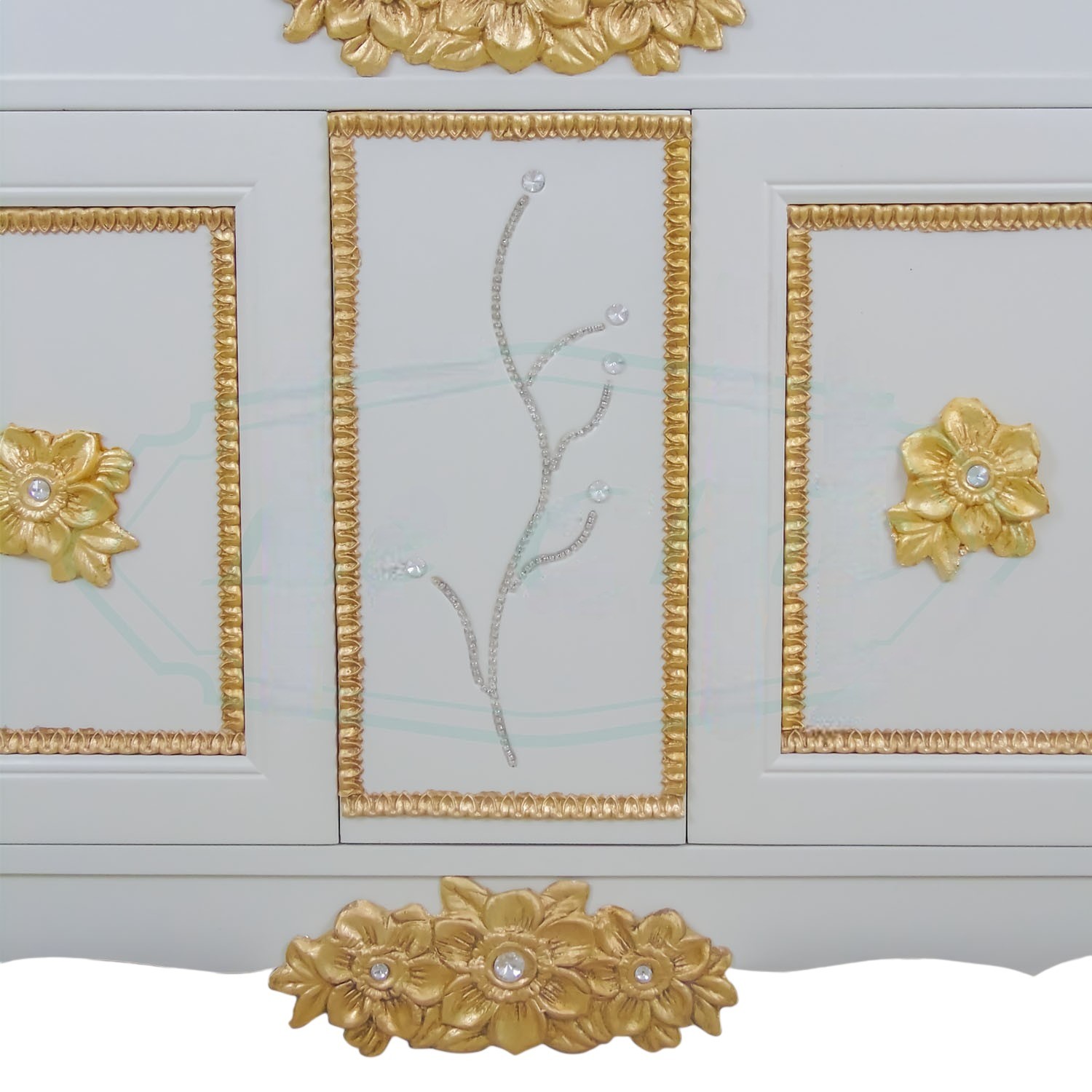 Mobile bagno in stile shabby chic, costruito interamente in legno di pioppo. Finitura laccato bianco bianco, realizzato completamente a mano in Italia. Dotato di 2 ante e 2 cassetti laterali nella parte superiore. Unico nel suo genere con i pomoli in ottone oro con swarovski e punti luce in stile swarovski, per non passare inosservati. Il spazioso lavabo in ceramica con doppia vasca e il top in marmo sono resistenti ad prodotti chimici e corrosivi. Con la base è compresa una specchiera in stile barocco. La vernice del mobile è idrorepellente.