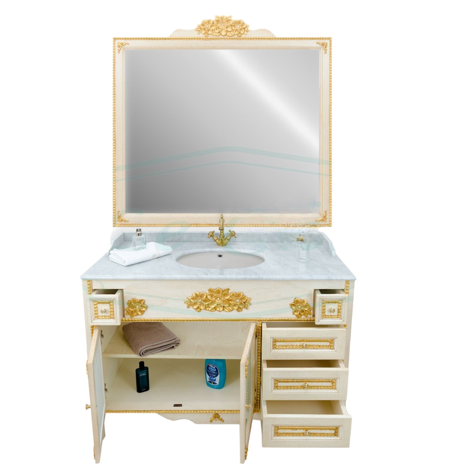 Mobile bagno in stile shabby chic, costruito interamente in legno di pioppo. Finitura laccato avorio decapè, realizzato completamente a mano in Italia. Dotato di 2 ante vetro sabbiato con decori, 3 cassetti laterali e 2 cassetti nella parte superiore. Unico nel suo genere per gli intarsi in foglia oro e i pomoli in ottone oro con swarovski, per non passare inosservati. Il top in marmo bianco di carrara è resistente ad prodotti chimici e corrosivi. Con la base è compresa una specchiera in stile barocco. La vernice del mobile è idrorepellente.