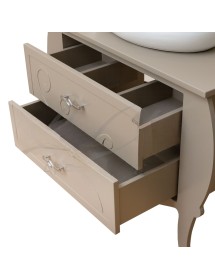 Mobile bagno in stile shabby chic, costruito interamente in legno di pioppo. Finitura laccato avorio decapè, realizzato completamente a mano in Italia. Dotato di 3 cassettoni. 8 cassettini laterali e 2 porte in vetro sabbiate con decori. Unico nel suo genere per la finitura crackle che da il senso del mobile invecchiato, arricchendolo con pomelli dorati con punti luce in stile swarovski, per non passare inosservati da amici e parenti. Il lavabo in ceramica è resistente ad prodotti chimici e corrosivi. Con la base è compresa una specchiera in stile barocco. La vernice del mobile è idrorepellente.