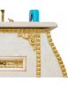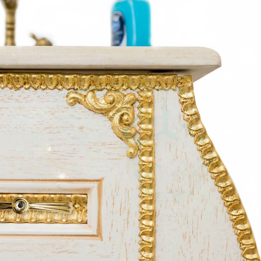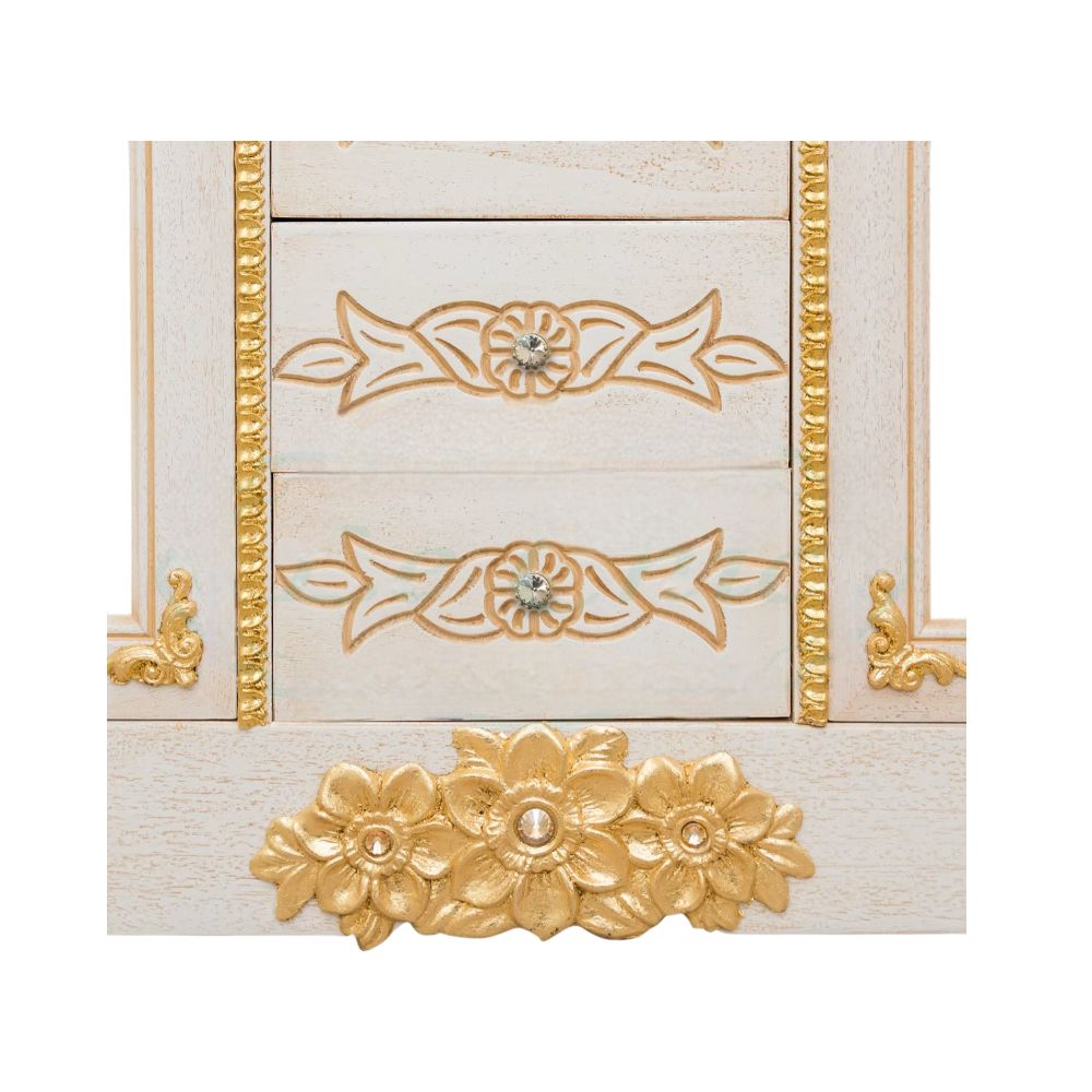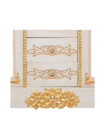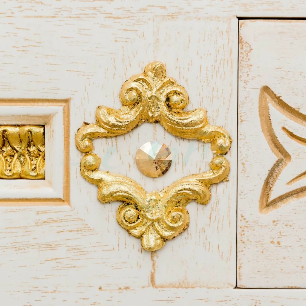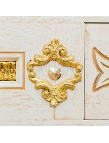 Mobile bagno in stile shabby chic, costruito interamente in legno di pioppo. Finitura laccato avorio decapè, realizzato completamente a mano in Italia. Dotato di 4 ante in vetro sabbiato con decori e 4 cassetti centrali. Unico nel suo genere per gli intarsi in foglia oro e con i pomoli e le maniglie in ottone oro in stile swarovski, per non passare inosservati da amici e parenti. Il top in marmo è resistente ad prodotti chimici e corrosivi. Con la base è compresa una specchiera in stile barocco. La vernice del mobile è idrorepellente.