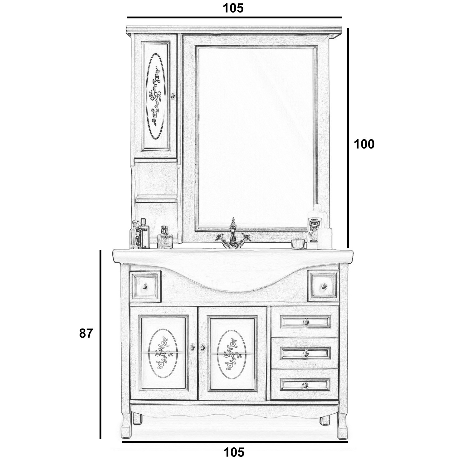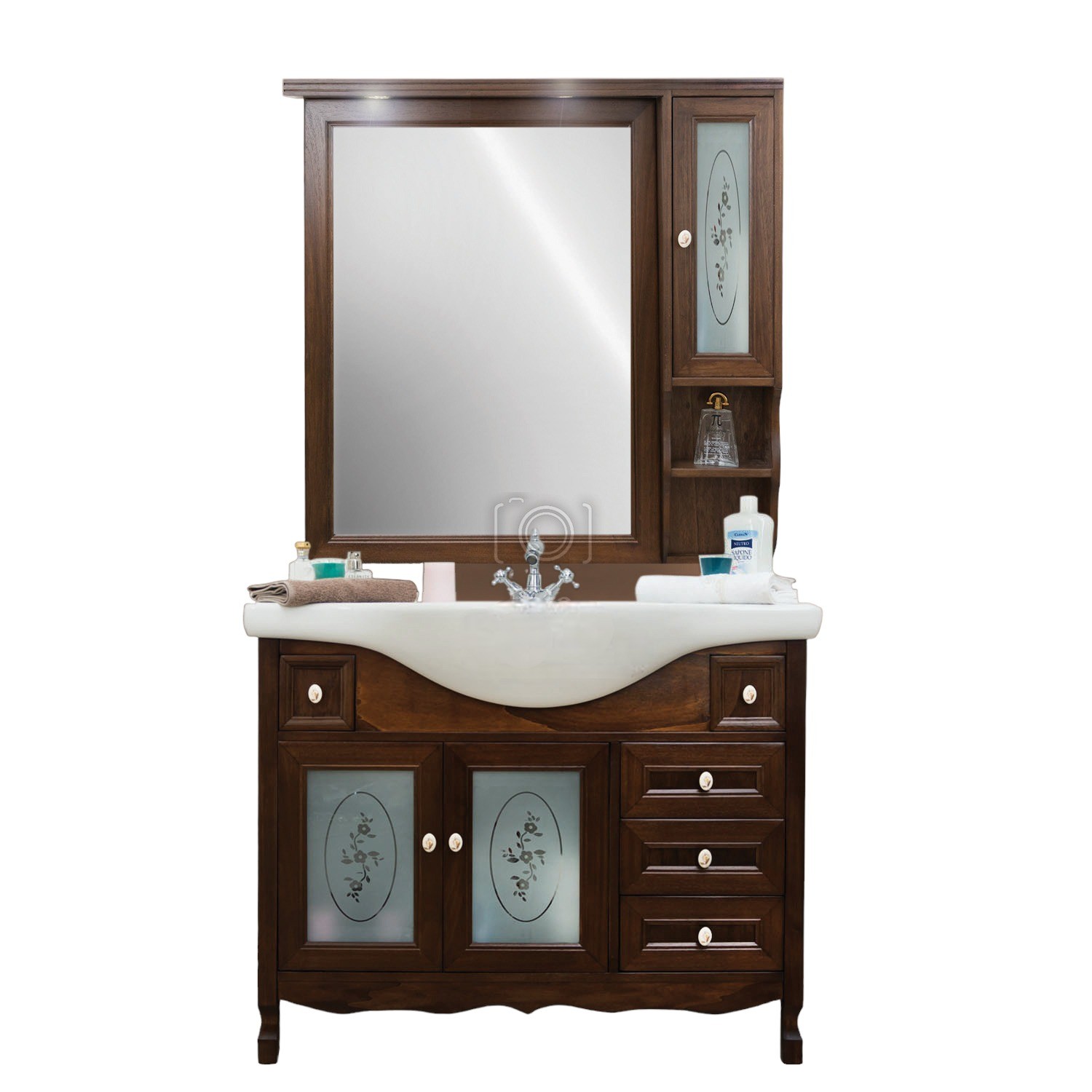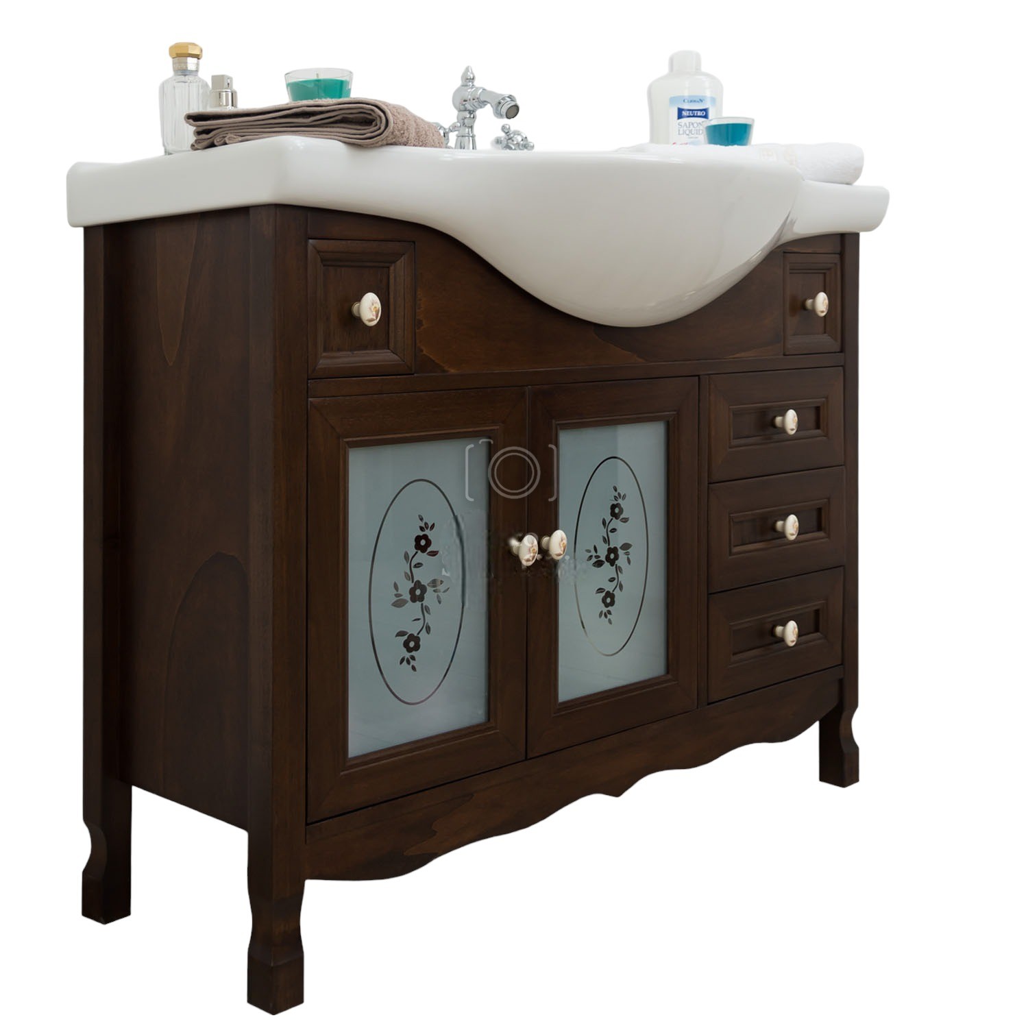 Mobile bagno in arte povera, costruito interamente in legno di pioppo realizzato completamente a mano in Italia. Dotato di 2 ante con vetro sabbiato con decori, 3 cassetti scorrevoli laterali e 2 cassettini nella parte superiore. Unico nel suo genere in tinta noce e i pomoli in ceramica con disegni floreali, per non passare inosservati per il suo stile raffinato ed elegante. Il spazioso lavabo e il top sono i in ceramica resistenti ad prodotti chimici e corrosivi. Con la base è compresa una specchiera in stile barocco e i led. La vernice del mobile è idrorepellente.