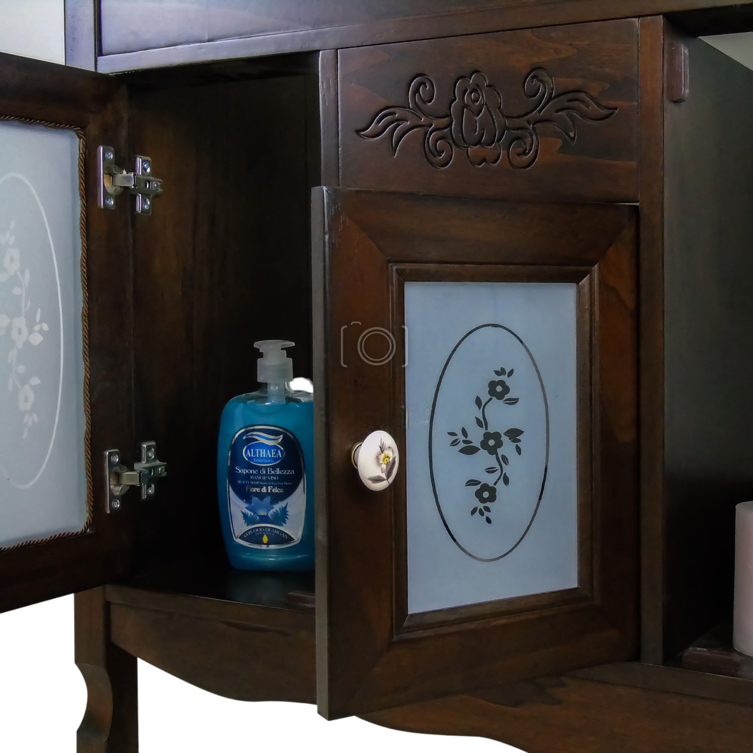 Mobile bagno in arte povera, costruito interamente in legno di pioppo realizzato completamente a mano in Italia. Dotato di 3 porte in vetro sabbiato con decori molto capienti per riporre spazzole, asciugamani e prodotti per il bagno. Unico nel suo genere per i pomoli in ceramica con decori floreali. Il Top è in ceramica porcellanata resistente ad prodotti chimici e corrosivi. Con la base è compresa una specchiera con applique. La vernice del mobile è idrorepellente. Ideale da posizionare su spazi stretti di difficile passaggio come solitamente è la zona bagno.