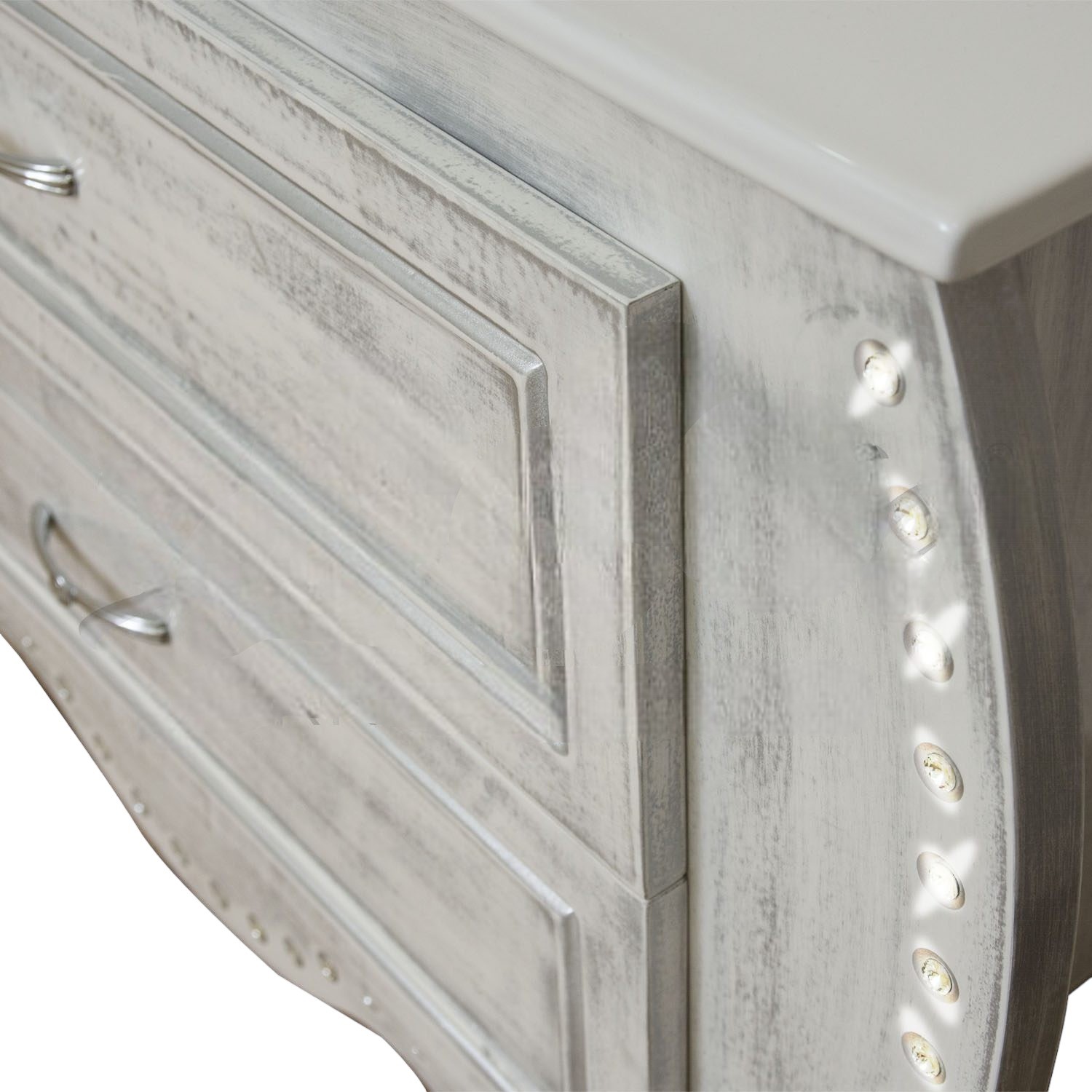 Mobile bagno contemporaneo, costruito interamente in legno di pioppo realizzato completamente a mano in Italia. Dotato di 2 cassettoni centrali per riporre spazzole, asciugamani e prodotti per il bagno. Unico nel suo genere per le sue linee sagomate arricchite con brillanti tipo swarovski. Lavabo sotto piano in ceramica porcellanata resistente ad prodotti chimici e corrosivi. Con la base è compresa una specchiera con inserti brillanti che richiamano la base a 2 cassetti. La vernice del mobile è idrorepellente. Ideale da posizionare su spazi stretti di difficile passaggio come solitamente è la zona bagno.