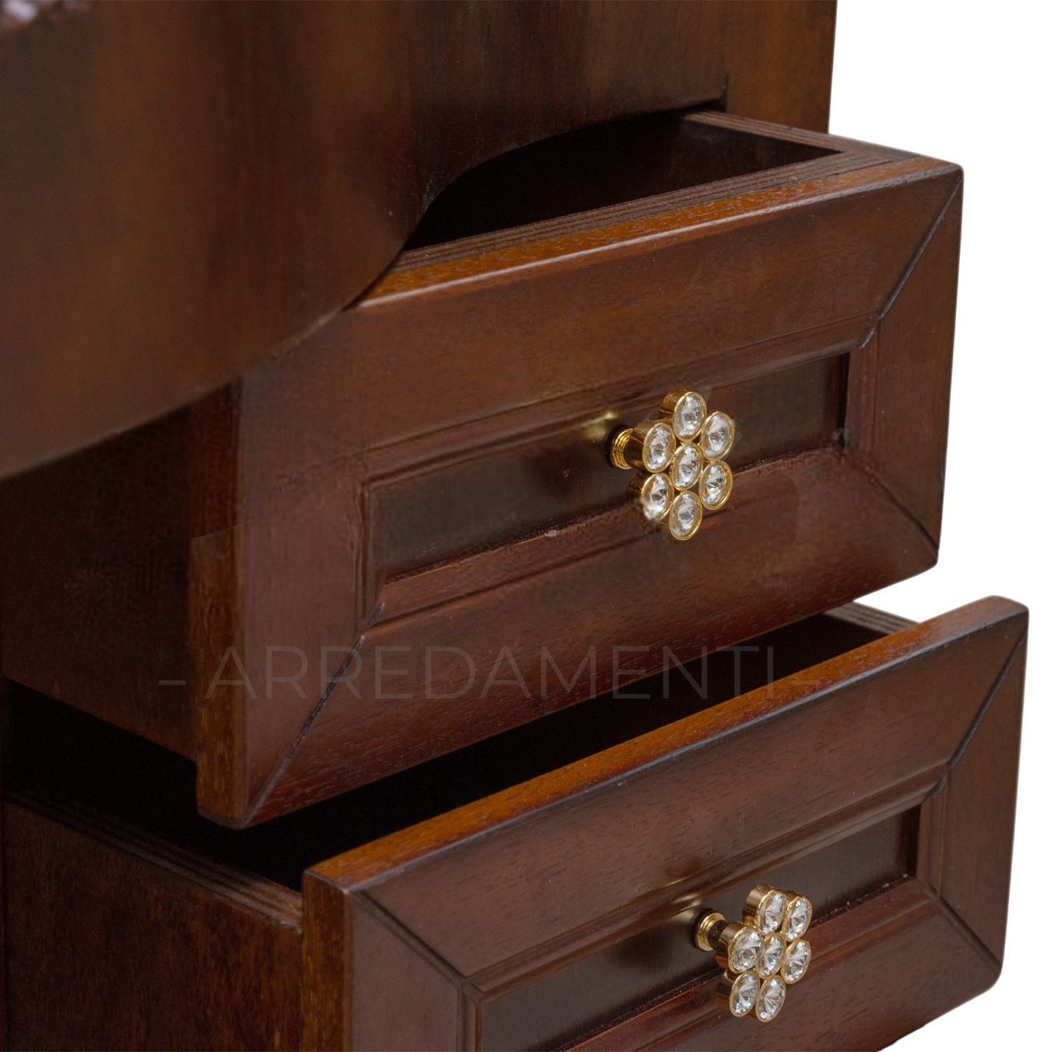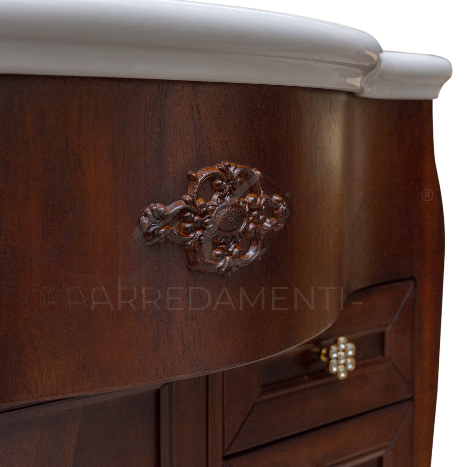 Mobile bagno in stile shabby chic, costruito interamente in legno di pioppo. Finitura tinta noce, realizzato completamente a mano in Italia. Dotato di 2 ante, 2 cassetti laterali e 1 cassettone nella parte inferiore. Unico nel suo genere per gli intarsi e i pomoli e maniglie in ottone oro con pietra stile swarovski, per non passare inosservati. Top e lavabo in ceramica è resistente ad prodotti chimici e corrosivi. Con la base è compresa una specchiera in stile barocco. La vernice del mobile è idrorepellente.