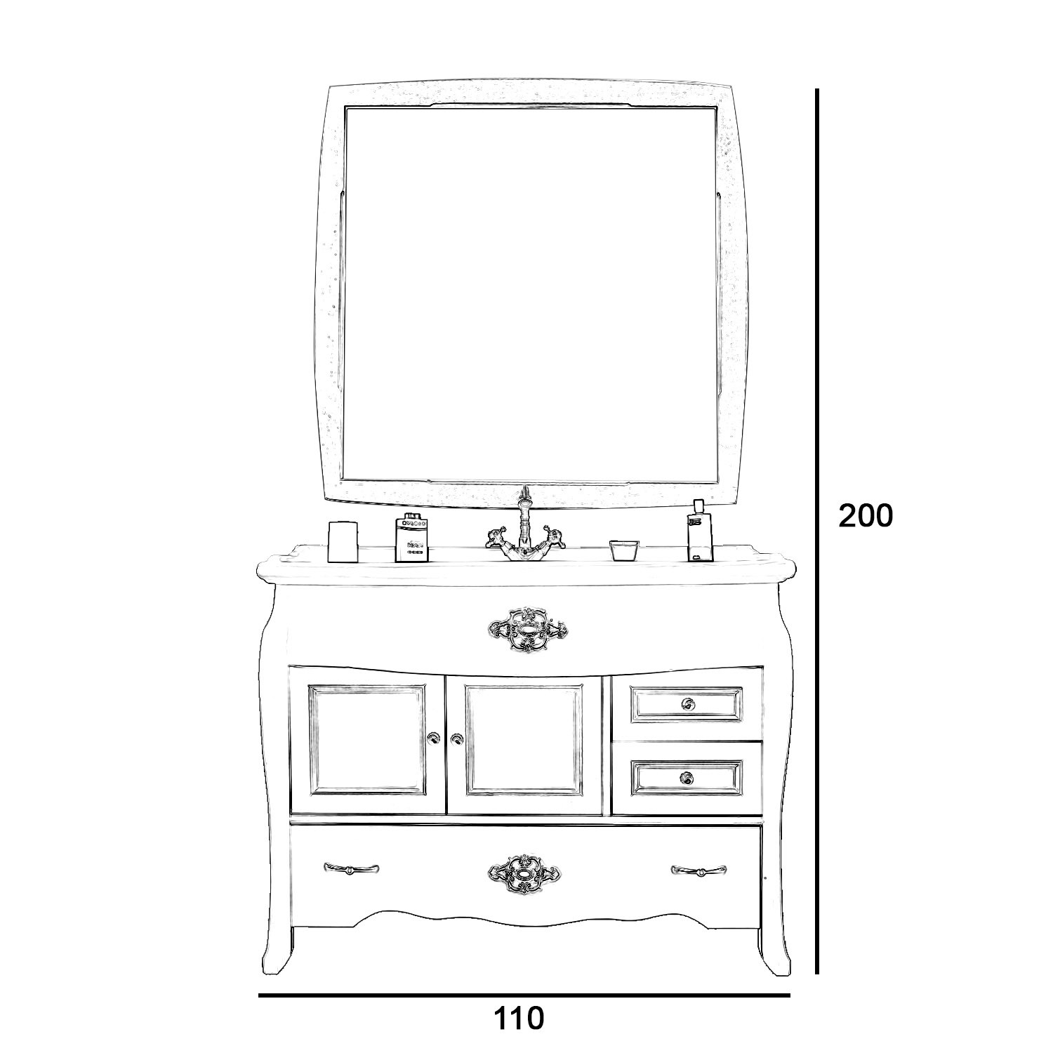 Mobile bagno in stile shabby chic, costruito interamente in legno di pioppo realizzato completamente a mano in Italia. Dotato di 2 ante, 2 cassetti laterali e 1 cassettone nella parte inferiore. Unico nel suo genere per gli intarsi e i pomoli e maniglie in ottone oro con pietra stile swarovski, per non passare inosservati. Top e lavabo in ceramica è resistente ad prodotti chimici e corrosivi. Con la base è compresa una specchiera in stile barocco. La vernice del mobile è idrorepellente.