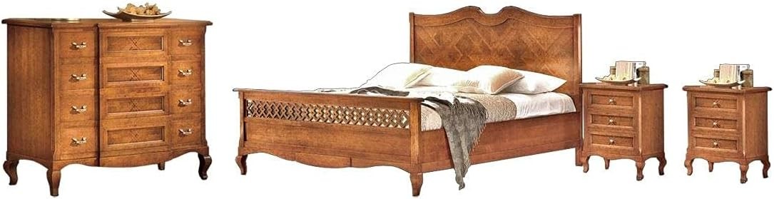 Camera da letto Costruita in legno composta da un letto matrimoniale con angoli a becco di civetta e gambe a sciabola, testata intarsiata con pediera traforata che prosegue con una fascia sagomata affiancata da due comodini dotati di 3 cassetti intarsiati per riporre all'occorrenza biancheria intima e oggetti. Il tutto accompagnato da una cassettiera in legno con angoli a becco di civetta e gambe a sciabola, dotata di 4 cassettoni con sezione centrale avanzata e intarsiata per riporre biancheria intima e indumenti. Composizione unica nel suo stile per la sua verniciatura bassano in contrasto con il letto traforato e gli intarsi, dando un' atmosfera dallo stile classico.