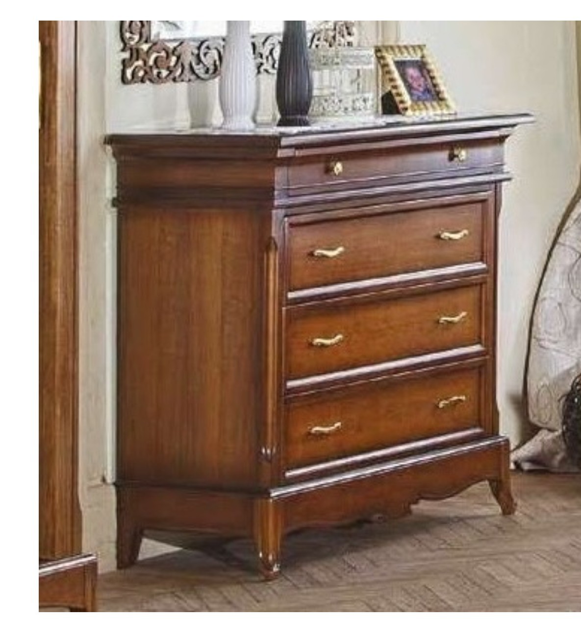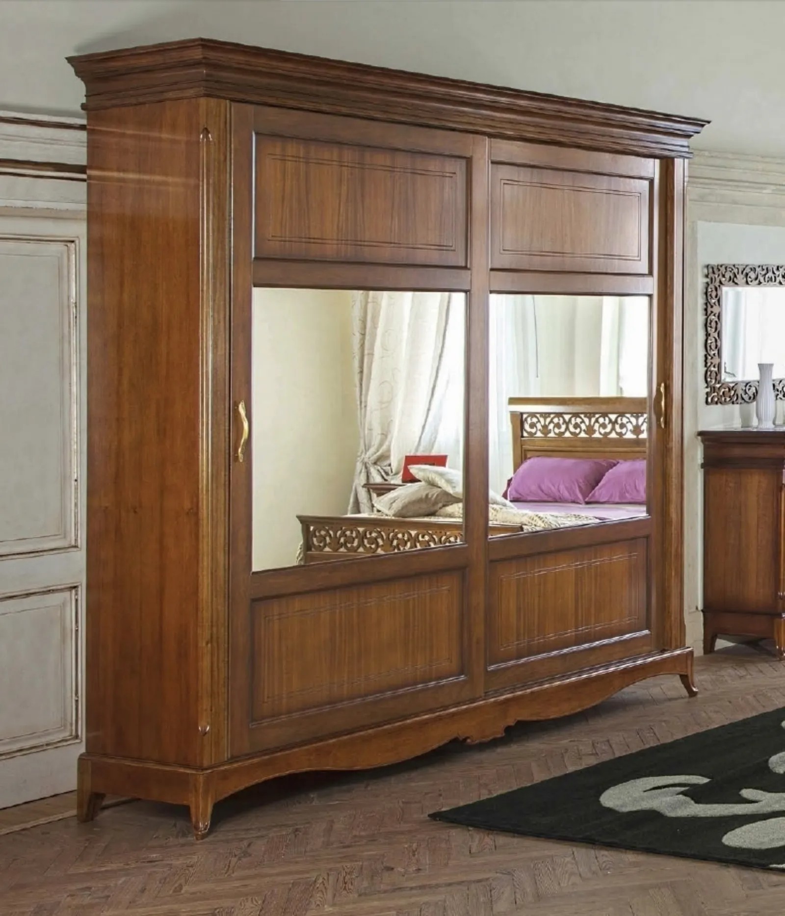 Camera da letto classica costruita in legno composta da un letto matrimoniale con gambe a sciabola, pediera e testata che proseguono con una fascia traforata affiancato da due comodini dotati di 3 cassetti per riporre all'occorrenza biancheria intima e oggetti. Cassettiera costruita in legno con angoli a becco di civetta e gambe a sciabola dotata di 4 cassettoni per riporre biancheria intima e indumenti. Armadio classico costruito in legno con corpo centrale con ante scorrevoli, arricchito da specchi centrali sui pannelli delle porte rendendolo unico per la sua originalità. L' interno è suddiviso in 2 vani con inserito all' interno 3 pali appendi e 3 ripiani.