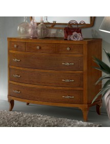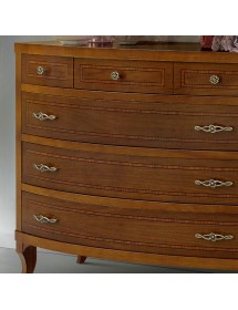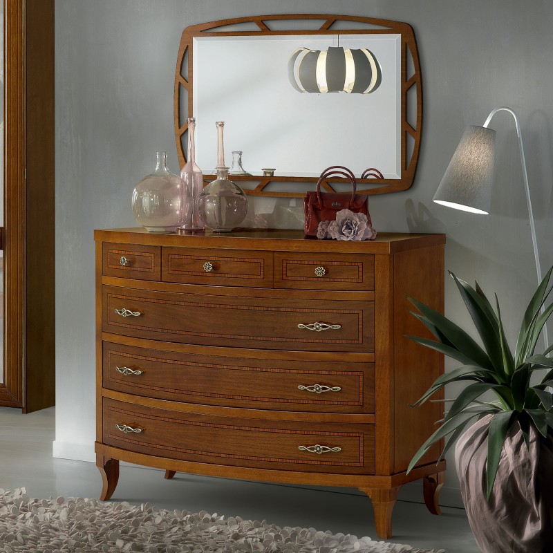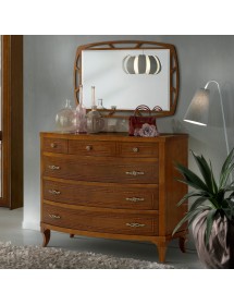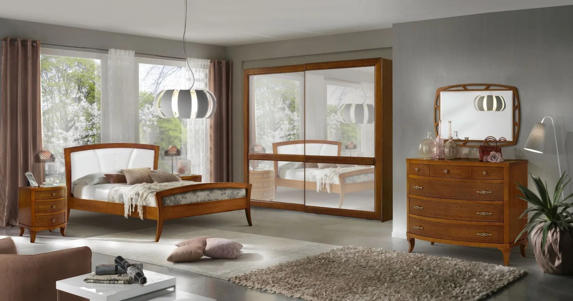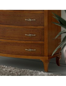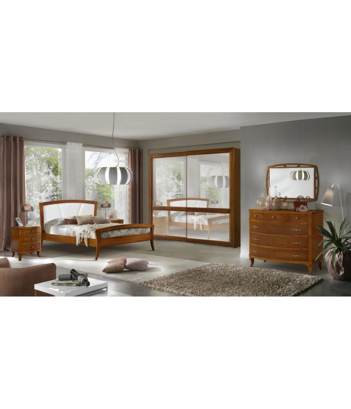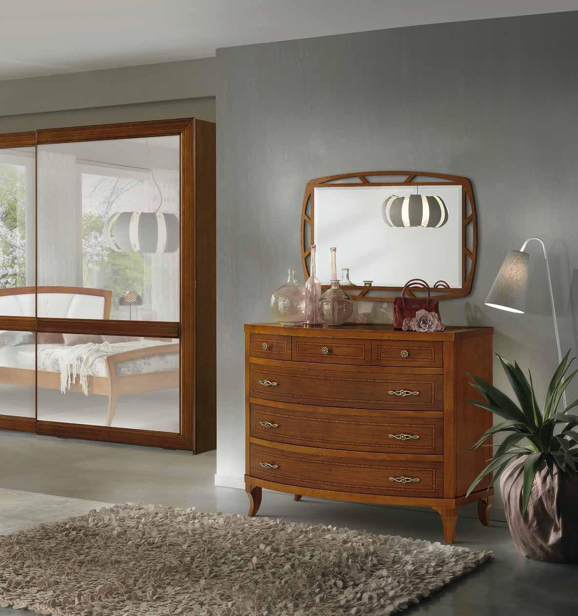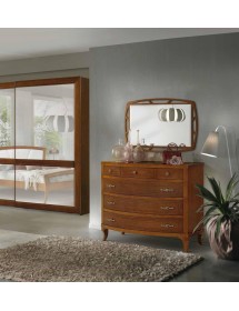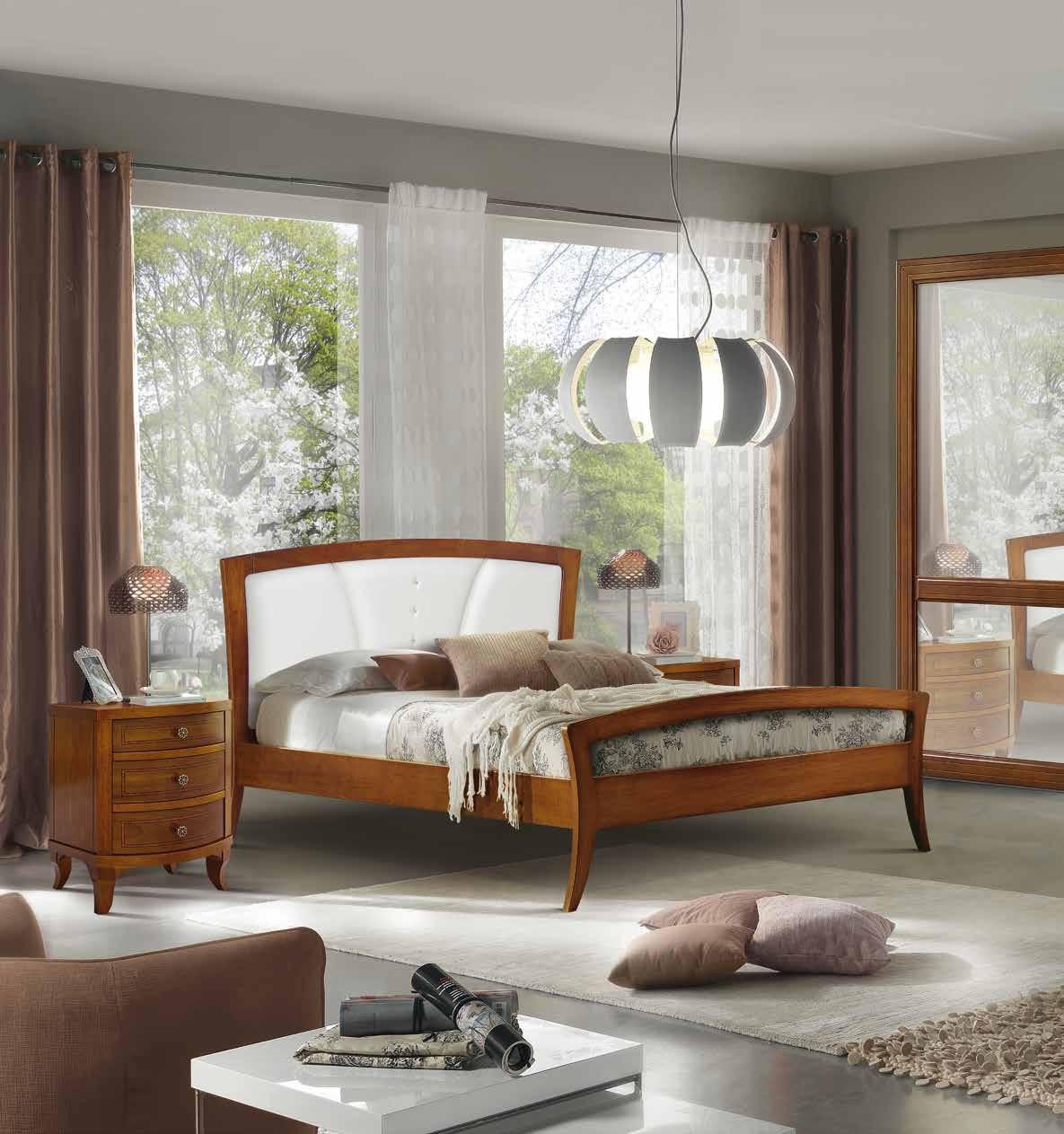 Camera da letto classica costruita in legno composta da un letto matrimoniale con gambe a sciabola e testata imbottita in ecopelle che proseguono con una fascia sagomata affiancata da due comodini dotati di 3 cassetti con filetti per riporre all'occorrenza biancheria intima e oggetti. Cassettiera costruita in legno con filetti e gambe a sciabola dotata di 3 cassettoni e 3 cassettini per riporre indumenti.. Armadio classico costruito in legno con corpo centrale con 2 ante scorrevoli, arricchito da specchi centrali sui pannelli delle porte o in legno rendendolo unico per la sua originalità. L' interno è suddiviso in 2 vani con inserito all' interno 3 pali appendi, 3 ripiani e una cassettiera con 4 cassetti