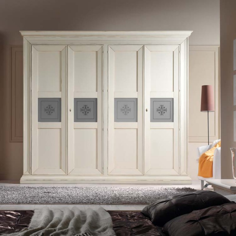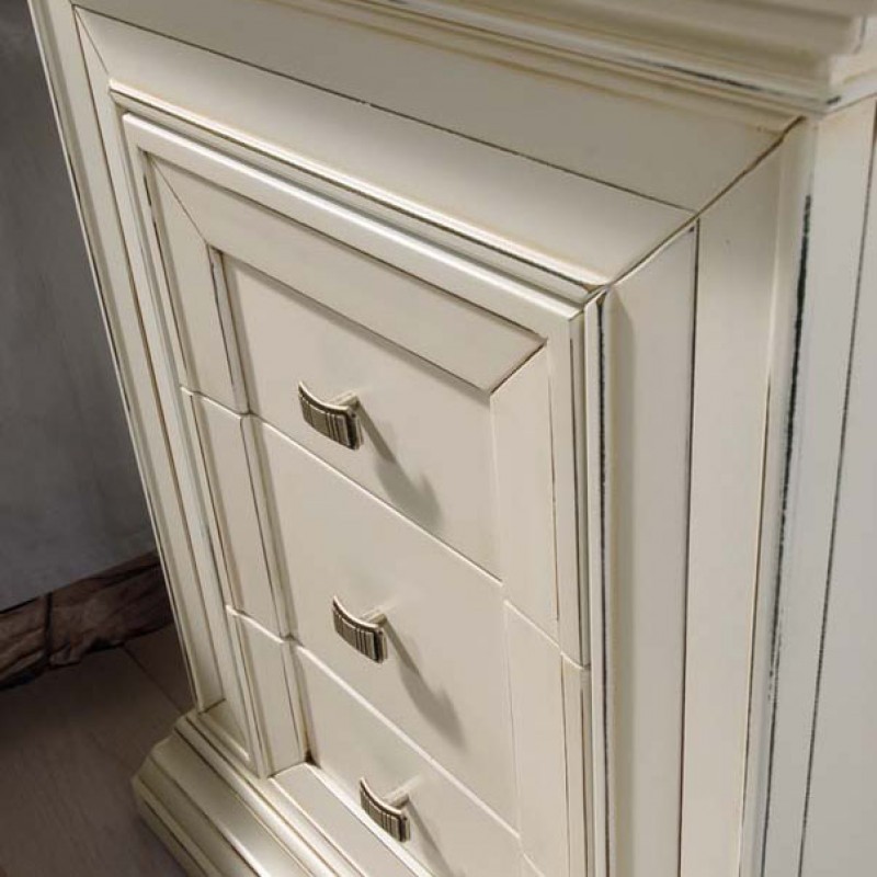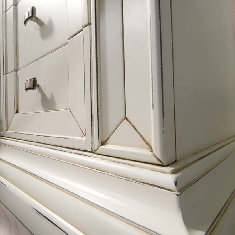 Realizzata in Italia in legno massello di pioppo con parti in listellare e toulipier, questa composizione con finitura Bianco anticato incarna l’essenza e la solidità dell’arredamento classico artigianale.